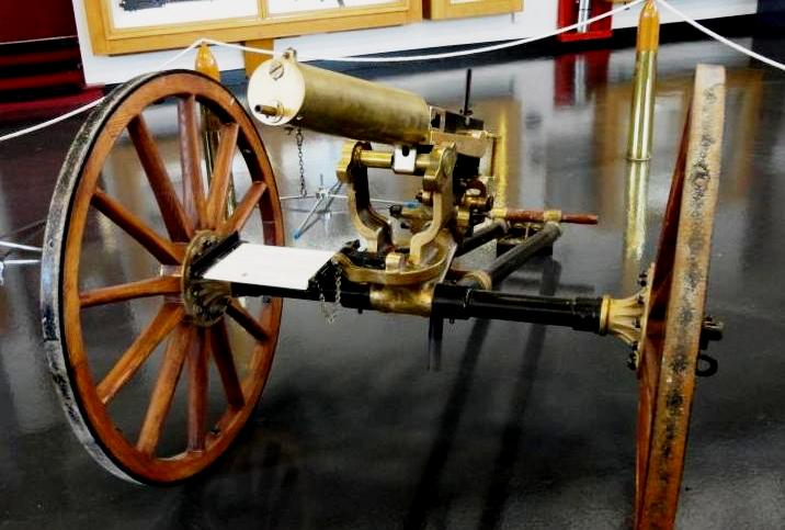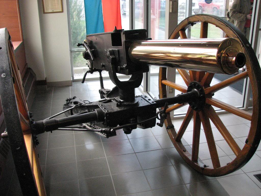 1-pounder QF Mk. 1, V.S.M. (Vickers, Sons & Maxim LL) 1905 Automatic Gun, aka “pom-pom”, weight (410 lbs), (Serial No. unknown), Reg. No. unknown, mounted on a wheeled carriage inside the Royal 22e Regiment Museum.