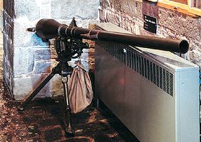 75-mm M20 Recoilless Rifle, inside the Museum Annex. Located in the Quebec Citadel National Historic Site of Canada within the King’s Bastion and adjacent to the Governor General’s Residence, Building No. 10, also known as the Former Military Prison or Museum Annex, is a two-story rectangular stone structure with a hipped roof pierced by three brick chimneys.