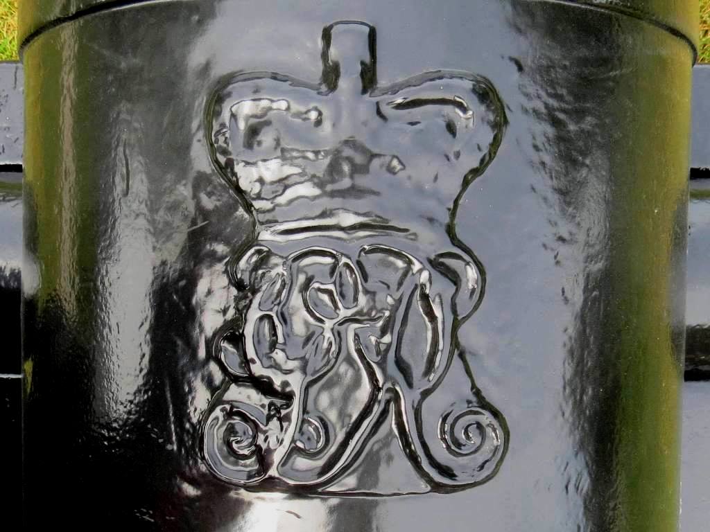 Carronade à chargement par la bouche lisse de 32 livres de 17 cwt en fonte avec anneau de culasse à motif Blomefield, poids 17-1-0 (1 932 lb), montée sur une voiture de garnison en fer au sud de l’entrée principale. L’une des nombreuses carronades SBML de différentes tailles est montée à divers endroits sur les ravelins et les rampes à l’intérieur de la Citadelle.