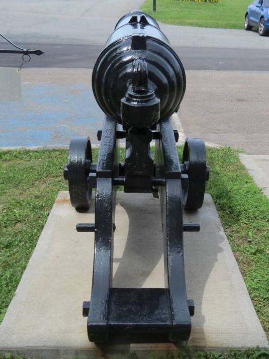 Cast Iron 32-pounder 17-cwt Smoothbore Muzzleloading Carronade with a Blomefield pattern breeching ring, weight 17-3-0 (1,988 lbs), mounted on a wood naval gun carriage. No. 1 of 2 in front of the Residence of the Governor General, la Citadelle de Québec.