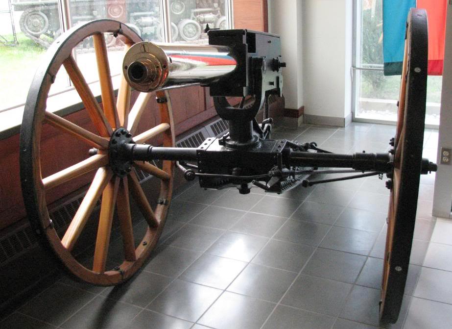 1 livre QF Mk. 1, V.S.M. (Vickers, Sons & Maxim LL) 1905 Automatic Gun, aka “pom-pom”, poids (410 lbs), (Serial No. unknown), Reg. Non inconnu, monté sur une voiture à roues à l’intérieur du musée Royal 22e Régiment.