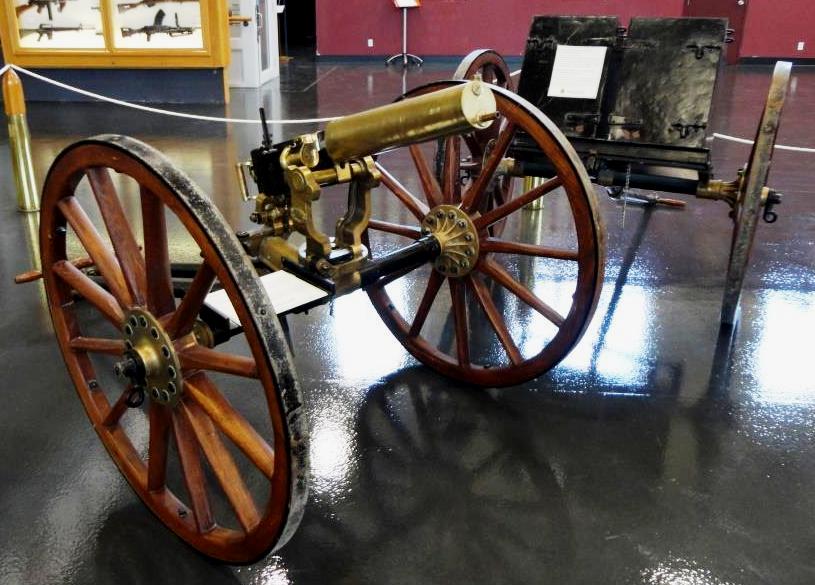 .303-inch Vickers-Maxim machine gun, Model 1898, mounted on a wheeled gun carriage with limber inside the museum.