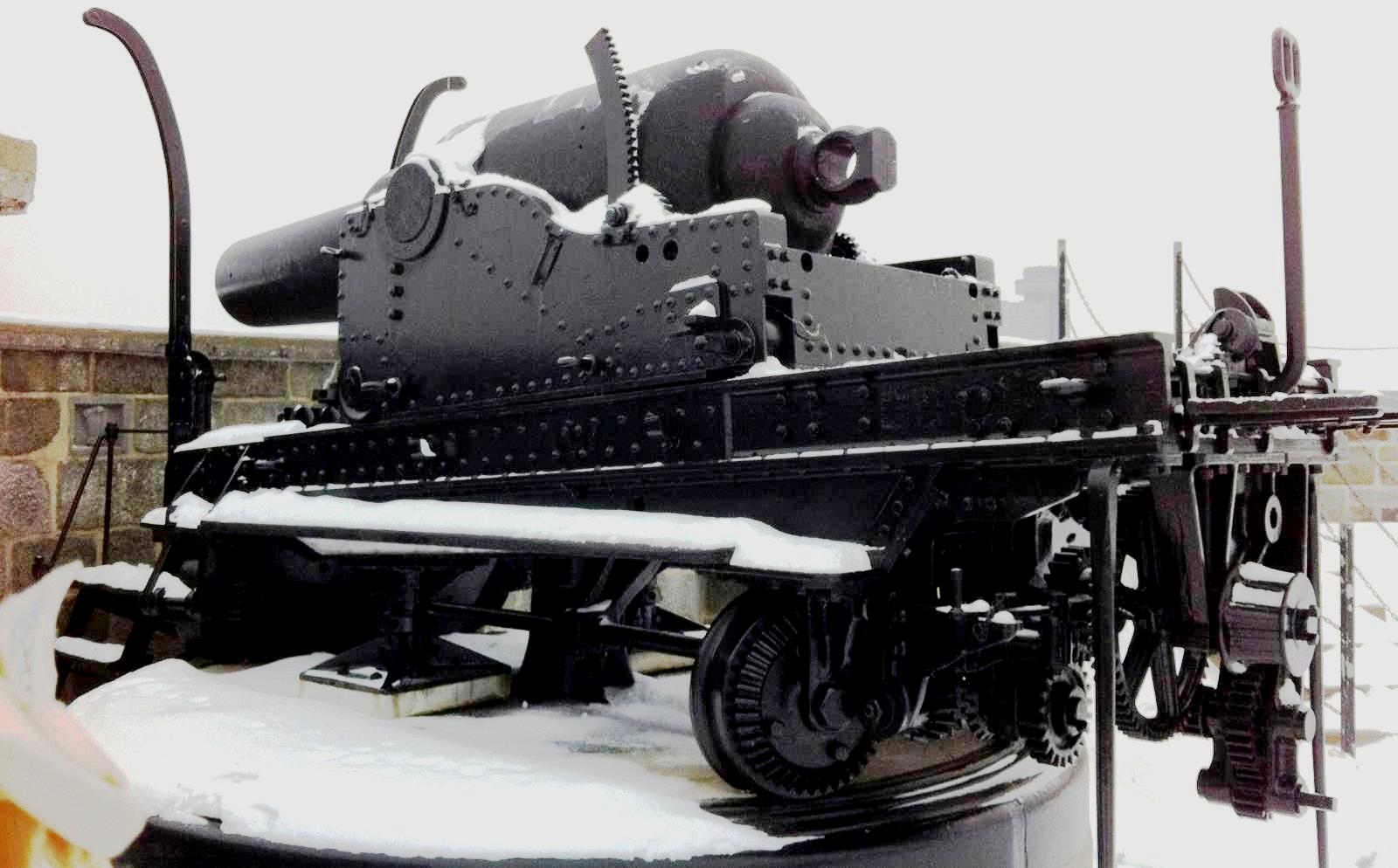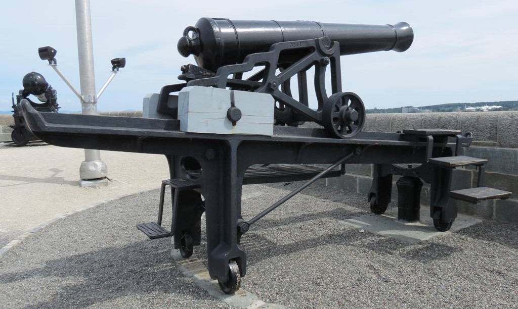 Canon Pallister de 7 pouces,poids de 11228 lbs, no 1776, 1867. Pos. no 5 de 12. Chariot traversant en fer.