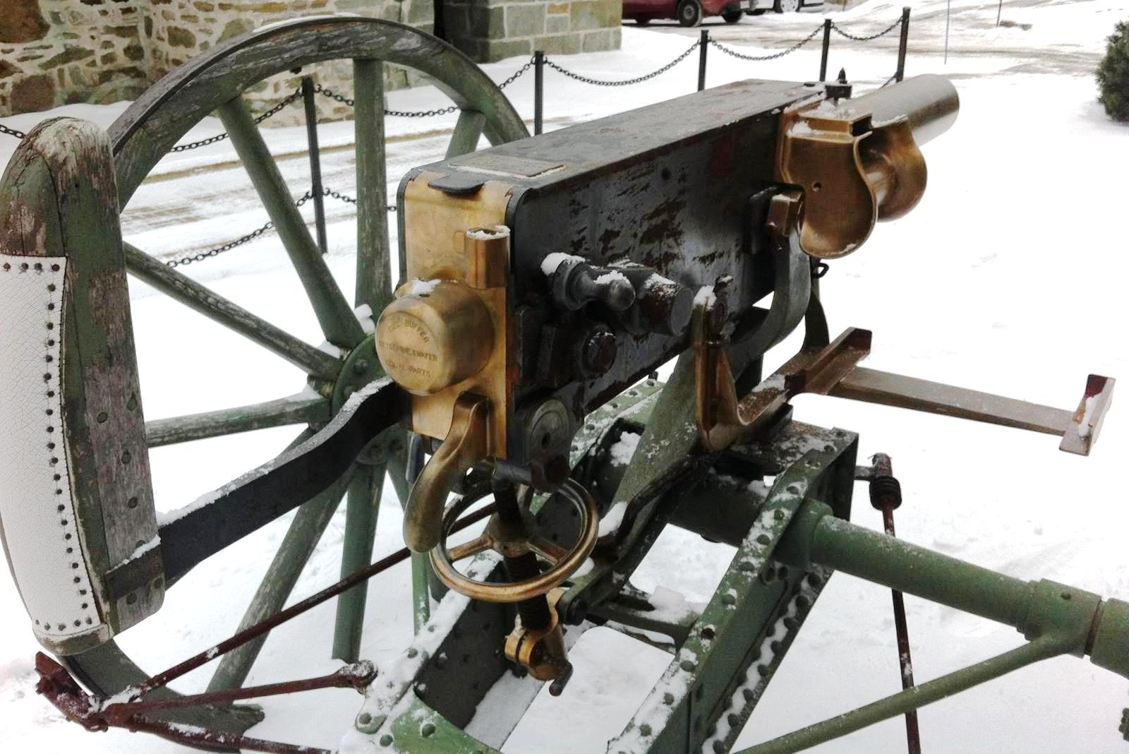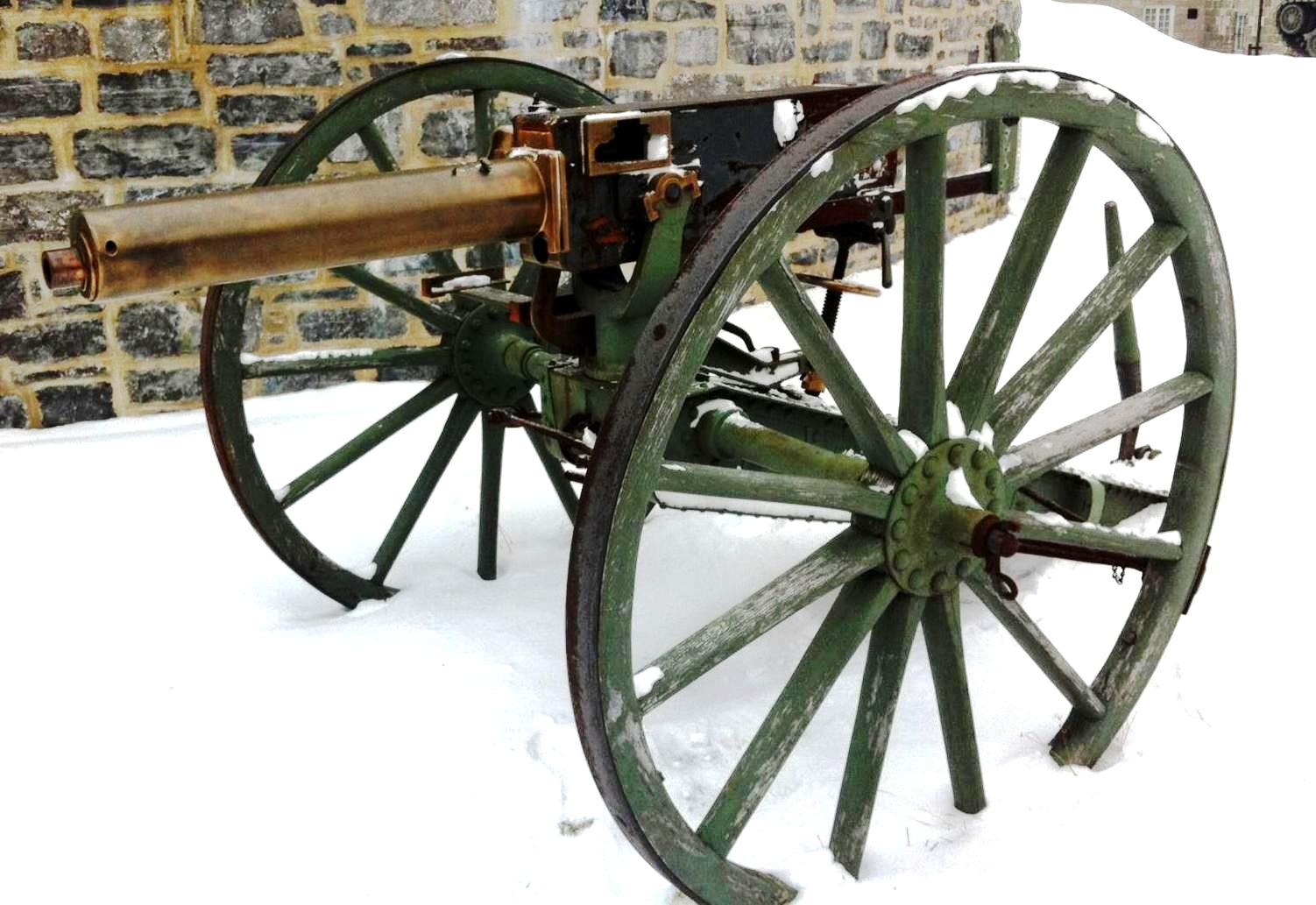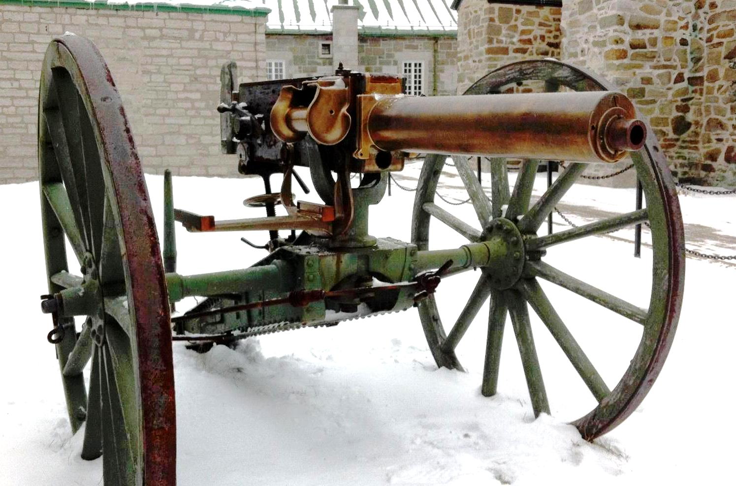 1-pounder QF Mk. 1, V.S.M. (Vickers, Sons & Maxim LL) 1905 Automatic Gun, aka “pom-pom”, weight (410 lbs), (Serial No. 2492), Reg. No. 112, mounted on a wheeled carriage near the Royal 22e Regiment Museum.