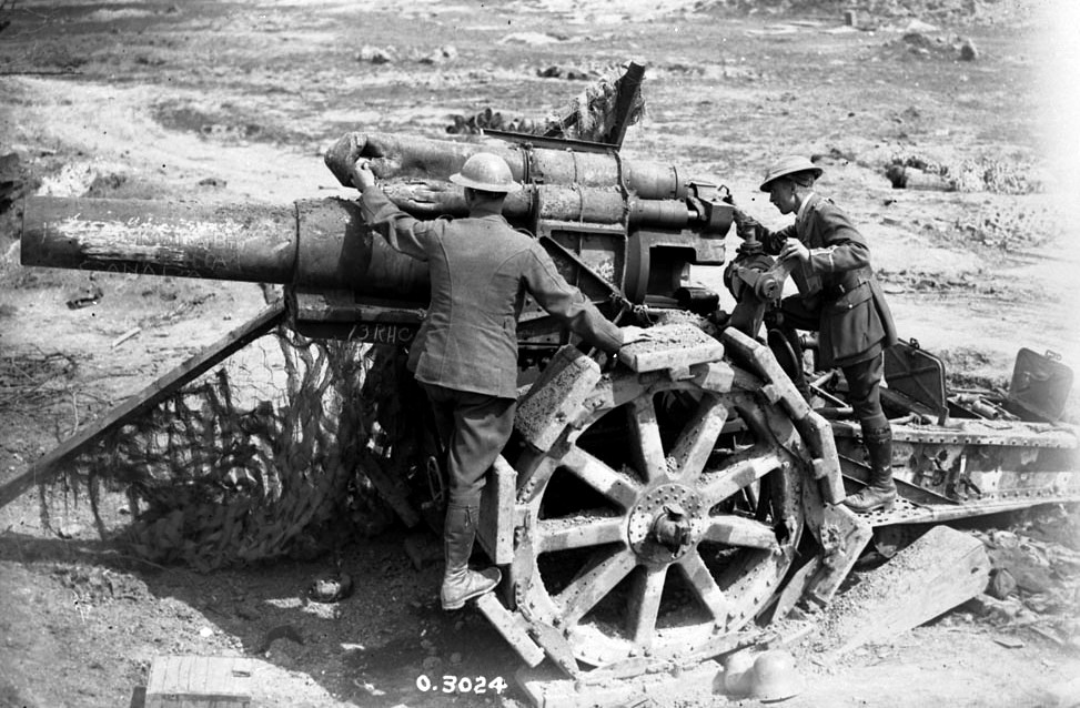 German First World War 21-cm Mörser 1916 neuer Art (21-cm Mrs 16 n.A.) Heavy Mortar, (Serial Nr. 825) on the breech, (Mrs Nr. 1237) on the trail. This Mrs 16 was captured on 3 Sep 1918 by a Battalion of the 11th Infantry Brigade, 4th Canadian Division, Canadian Expeditionary Force (CEF), on a road NE of Villers-lez-Cagnicourt, France.