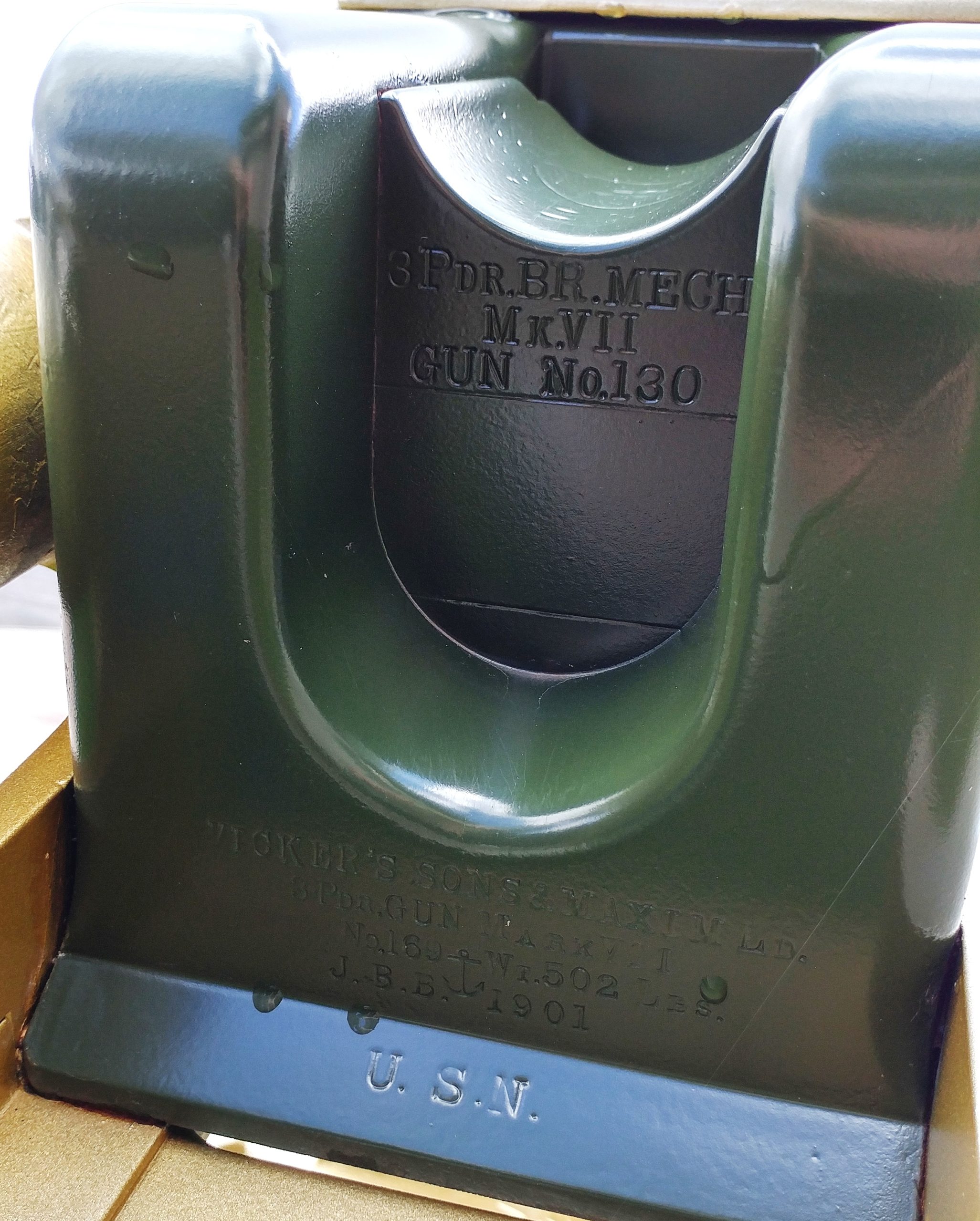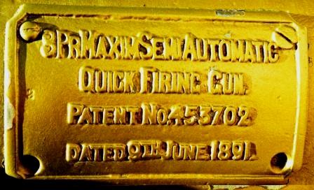 3-pounder USN, Vickers, Sons & Maxim LL Semi-Automatic QF Gun, plaque Patent No. 453702, dated 9th June 1891, plate USN Vickers Sons & Maxim London 3-pounder VI No. 531, JBB, 832, 1901, 35466, 4616, No. 2 in front of the 4th Artillery Regiment (General Support), Headquarters, main entrance.
