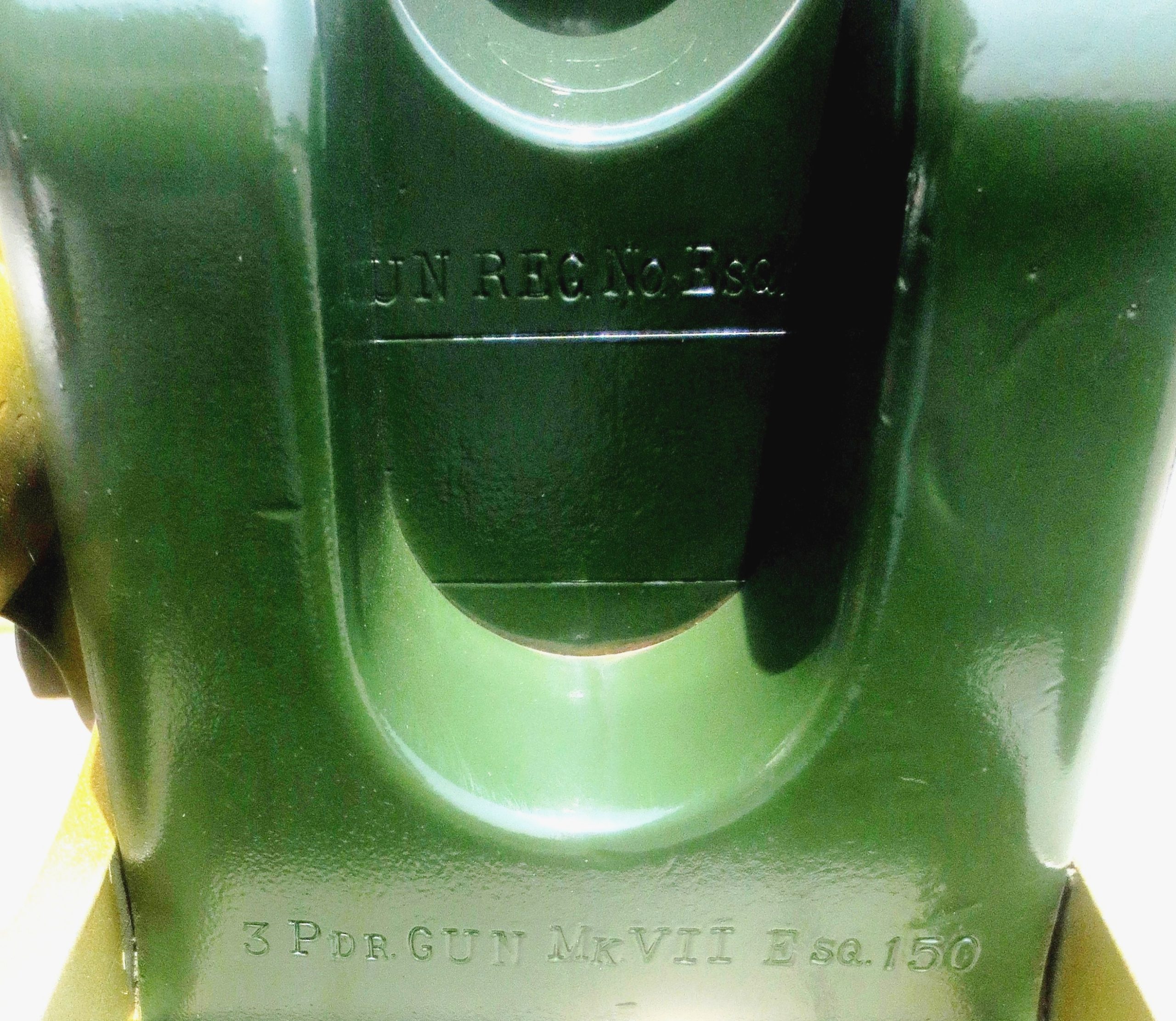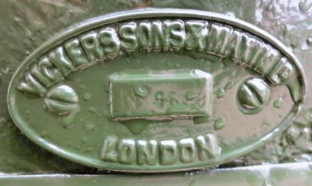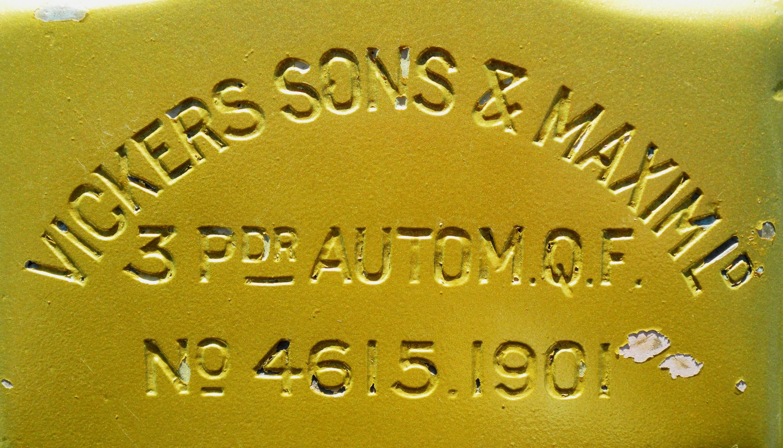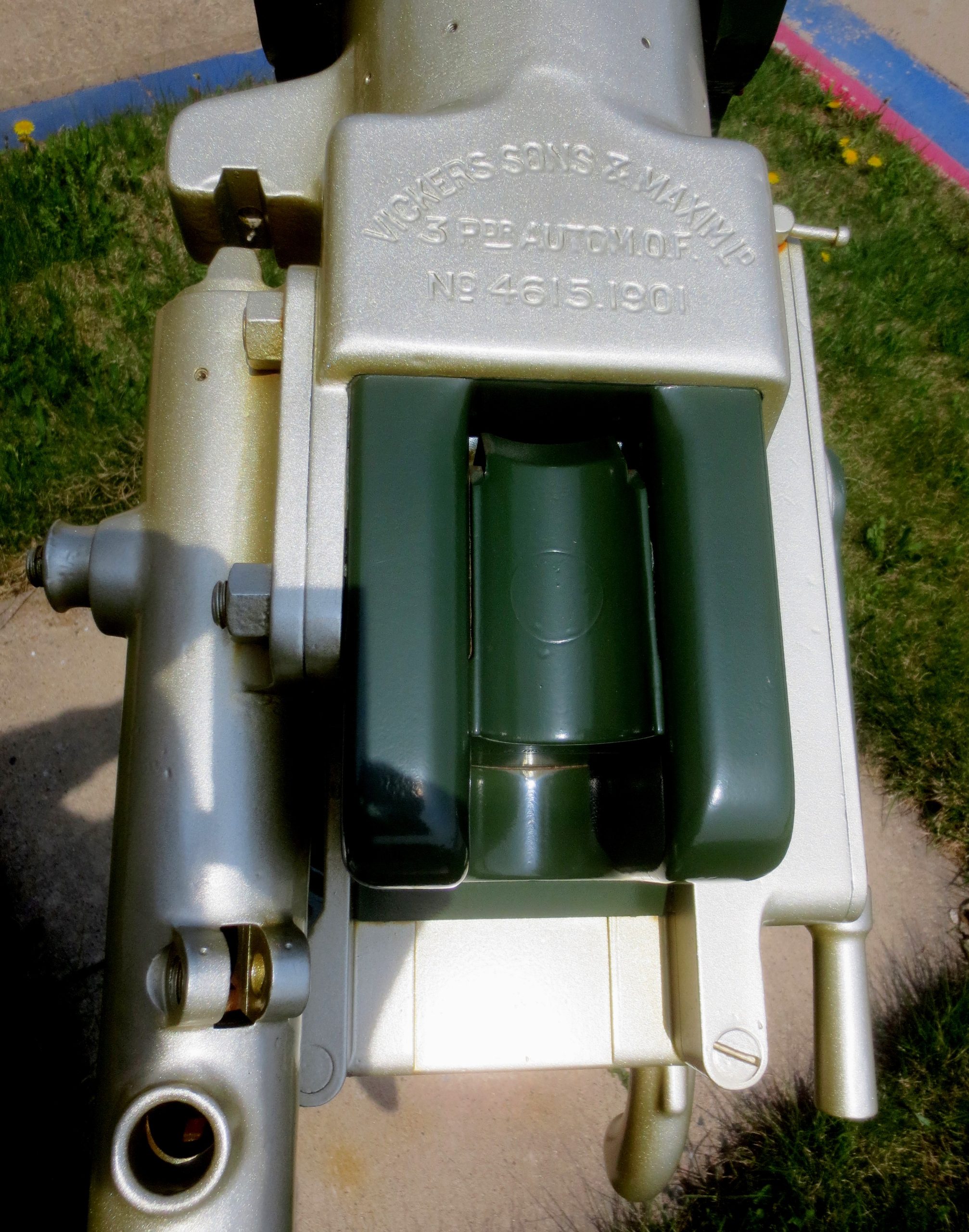 3-pounder Vickers, Sons & Maxim LD Semi-Automatic QF Gun, stamped Vickers Sons & Maxim LD 3 pdr Autom. QF, No. 4615, 1901. Mk VII, ESQ 150. 3-pounder Stand VI Mod 2, No. 90, EWE, GHE 346. 1915. No. 1 in front of the 4th Artillery Regiment (General Support), Headquarters, main entrance.