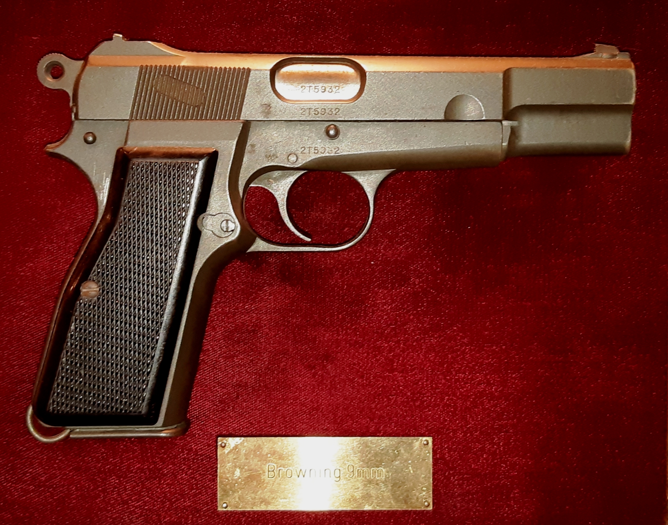 Browning 9-mm Hi Power single-action semi-automatic handgun. High-Power pistols were produced in Canada for Allied use, by John Inglis and Company in Toronto, Ontario. The plans were sent from the FN factory to the UK when it became clear the Belgian plant would fall into German hands, enabling the Inglis factory to be tooled up for Hi-Power production for Allied use. Inglis produced two versions of the Hi-Power, one with an adjustable rear sight and detachable shoulder stock (primarily for a Nationalist Chinese contract) and one with a fixed rear sight. Production began in late 1944 and they were on issue by March 1945 in time for use on the Operation Varsity airborne crossing of the Rhine into Germany. The pistol was popular with the British airborne forces as well as covert operations and commando groups such as the Special Operations Executive (SOE), the U.S. Office of Strategic Services (OSS) and the British Special Air Service (SAS) Regiment. Inglis High-Powers made for Commonwealth forces have the British designation ‘Mk 1’, or ‘Mk 1*’, and the manufacturer’s details on the left of the slide. They were known in British and Commonwealth service as the ‘Pistol No 2 Mk 1’, or ‘Pistol No 2 Mk 1*’ where applicable. Serial numbers were 6 characters, the second being the letter ‘T’, e.g. 1T2345. Serial numbers on pistols for the Chinese contract instead used the letters ‘CH’, but otherwise followed the same format. When the Chinese contract was cancelled, all undelivered Chinese-style pistols were accepted by the Canadian military with designations of ‘Pistol No 1 Mk 1’ and ‘Pistol No 1 Mk 1*’.