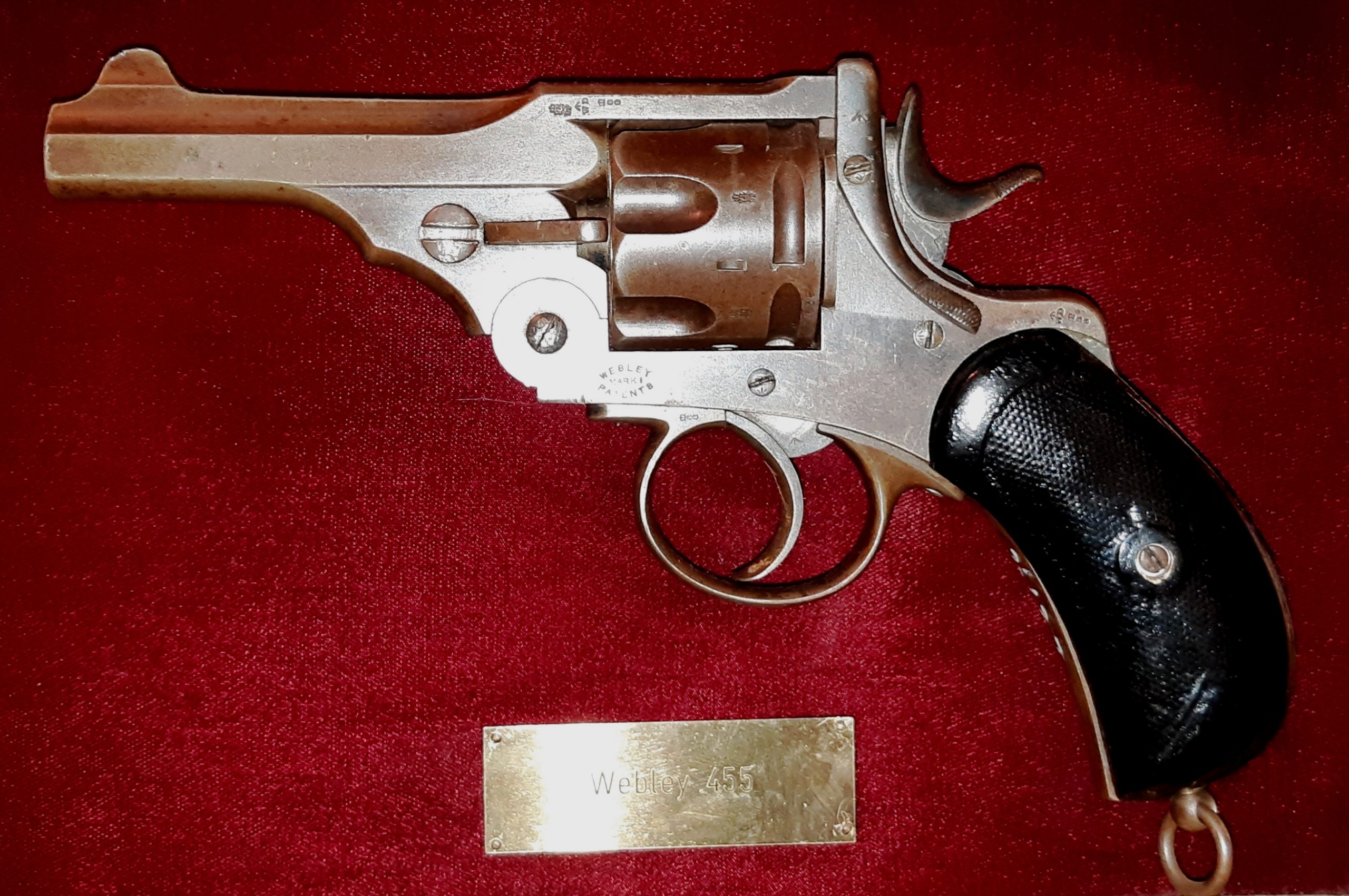 Webley .455-cal revolver, (also known as the Webley Top-Break Revolver or Webley Self-Extracting Revolver) was, in various marks, a standard issue service pistol for the armed forces of the British Commonwealth, from 1887 until 1963. The Webley is a top-break revolver and breaking the revolver operates the extractor, which removes cartridges from the cylinder. The Webley Mk. I service revolver was adopted in 1887 and the Mk. IV rose to prominence during the Boer War of 1899-1902. The Mk. VI, introduced in 1915 during the Firt World War, is perhaps the best-known model. Webley service revolvers are among the most powerful top-break revolvers ever produced.