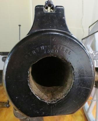 9-pounder 8-cwt Muzzleloading Rifle, weight 8-1-4 (928 lbs), RGF No. 23, 1870 on the left trunnion, Firth Steel 1580 on the muzzle, W arrow D, R.C.D. 1877, No. 459, I, stamped on the iron carriage with wood wheels.  Inside the museum.