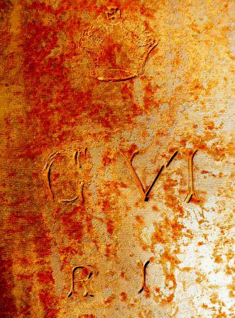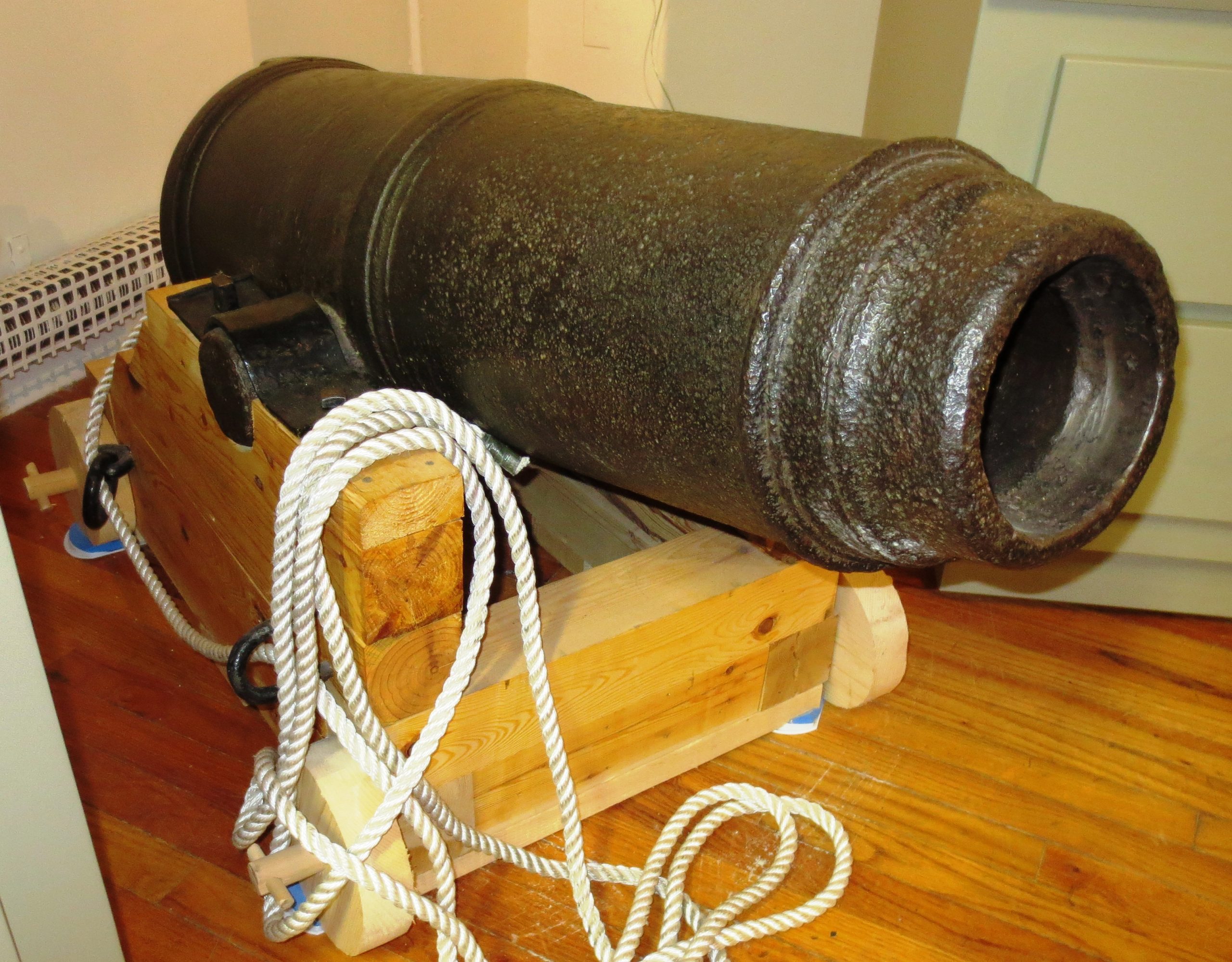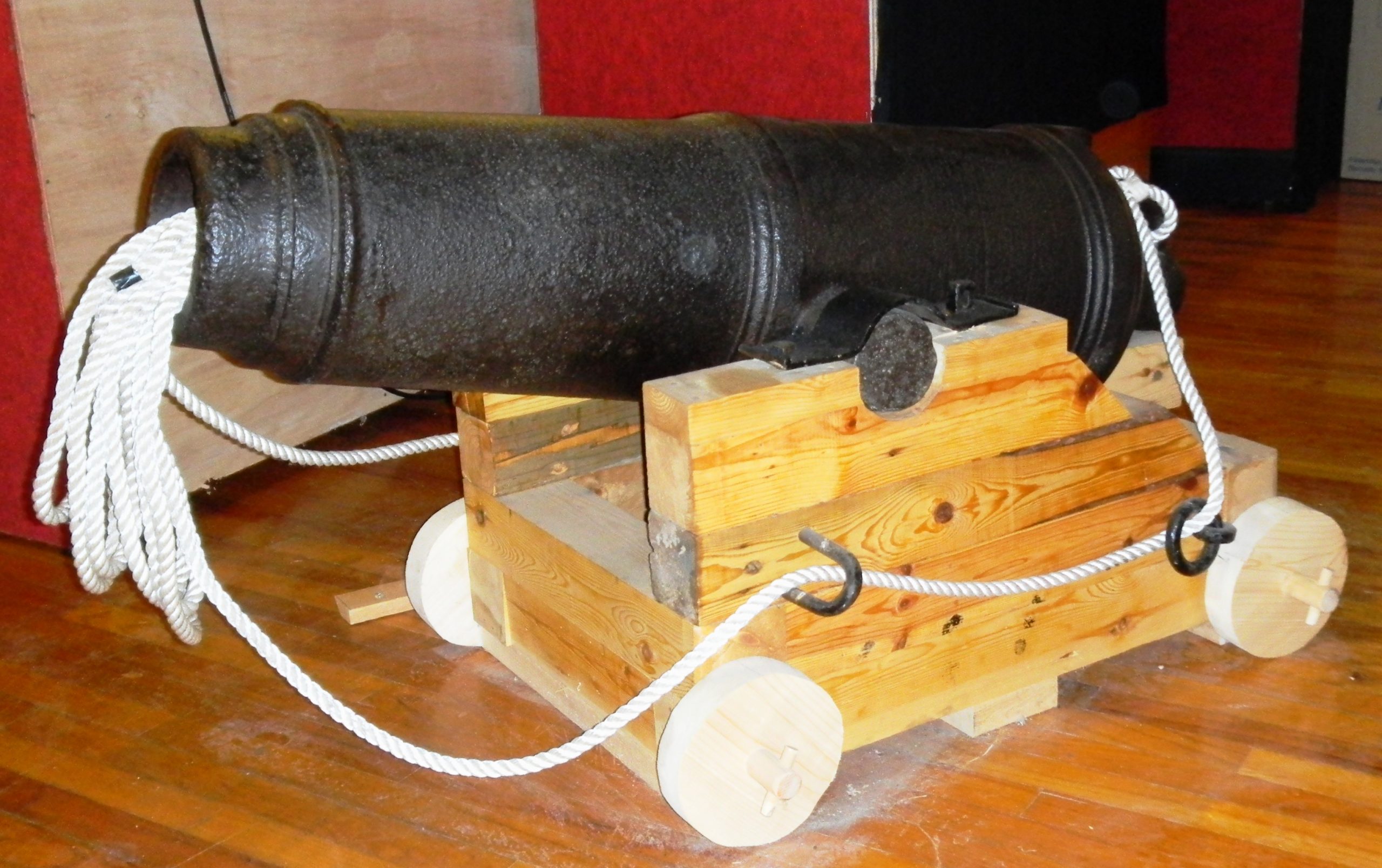 Cast Iron 12-pounder 6-cwt Smoothbore Muzzleloading Carronade with a Blomefield pattern breeching ring, mounted on a wooden carriage, inside the museum.  The carronade is a short smoothbore, cast iron cannon, which was used by the Royal Navy and first produced by the Carron Company, an ironworks in Falkirk, Scotland.  It was used from the 1770s to the 1850s.  Its main function was to serve as a powerful, short-range anti-ship and anti-crew weapon.  While considered very successful early on, carronades eventually disappeared as rifled naval artillery changed the shape of the shell and led to fewer and fewer close-range engagements.