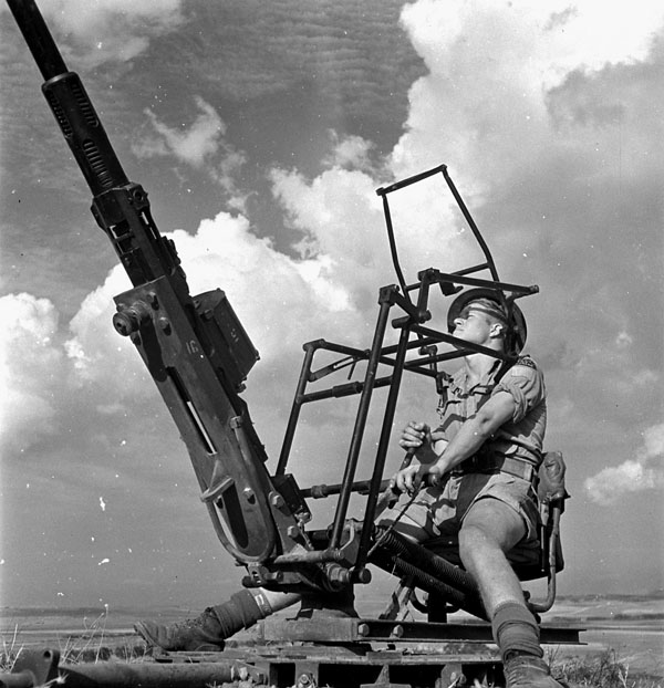 Oerlikon 20-mm/70 Light Anti-Aircraft Gun manned by a soldier of the Saskatoon Light Infantry (MG), Spinazzola, Italy, 1 Oct 1943.