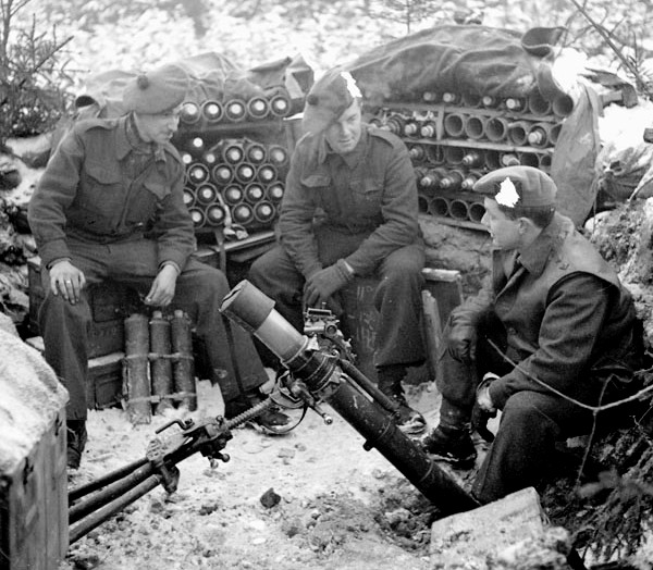 Black Watch (Royal Highland Regiment) of Canada, B Company mortar crew firing at target, left to right: Ptes. Al Keep, Bill Hart and Len Rundvall, Groesbeek, Netherlands, 3 Feb 1945.