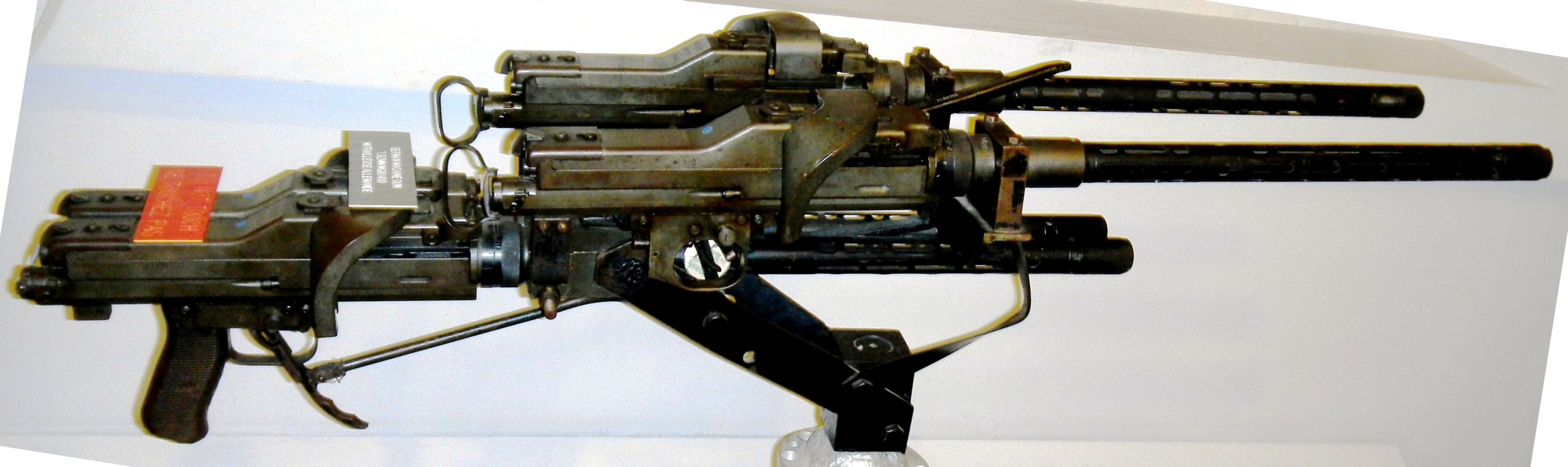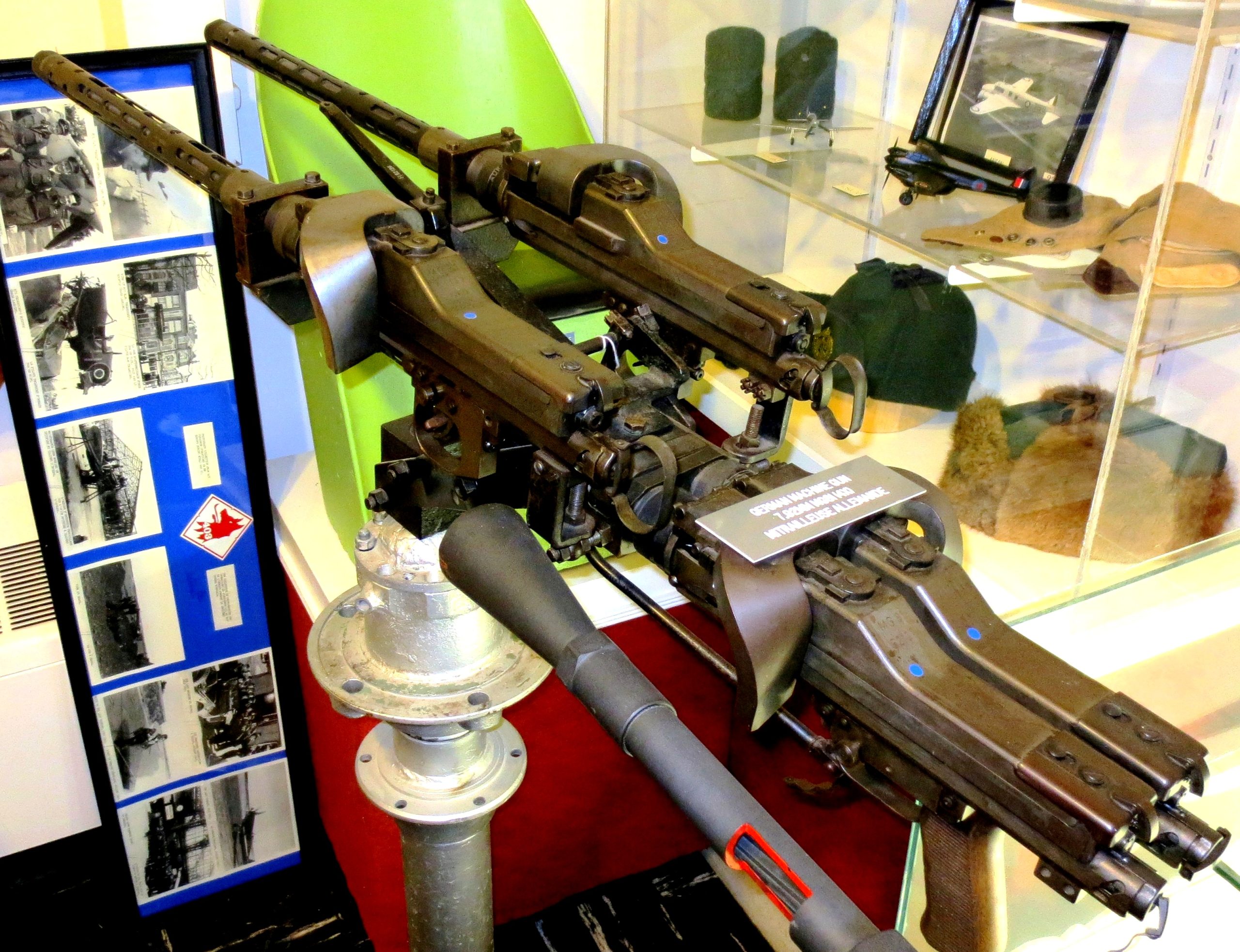 German Second World War 7.92-mm MG 81Z twin/paired (four-barreled) machine-guns with a single trigger pistol grip, (Serial Nos. 52108, 52137, 52138, & 64127), New Brunswick Military History Museum, 5 CDSB Gagetown, New Brunswick.  This is a special double twin-mount MG 81Z (the Z suffix stands for Zwilling, meaning “twin”) that was introduced for the Luftwaffe in 1942.  It paired up two of the weapons on one mount to provide even more firepower with a maximum rate of fire of 3200 rounds/minute without requiring much more space than a standard machine gun.  The MG 81Z was found in many unique installations in Luftwaffe combat aircraft, like this twin pair of MG 81Z (for a total of four guns) installed in the air defences of the Dornier Do 217.  It was technically designated R19 (R for Rüstsatz) as a factory designed field conversion/upgrade kit.  (Wikipedia)
