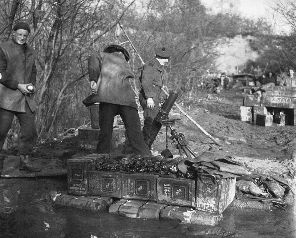 3-inch Mortar, Essex Scottish Regiment, Groesbeek, Netherlands, 24 Jan 1945.