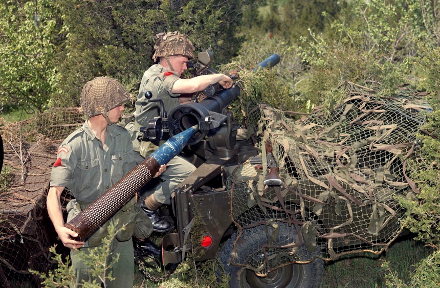 106-mm M40A1 Recoilless Rifle. Canadian anti-tank gunners taking part in live fire ranges at Sennelager Germany. Guardsmen Thos. Kinney and Jim Kidd ready the 106mm Recoiless Rifle M40. Both are members of the 1st Battalion, Canadian Guards serving in Germany with the 4th Canadian Infantry Brigade Group. (DND Photo)