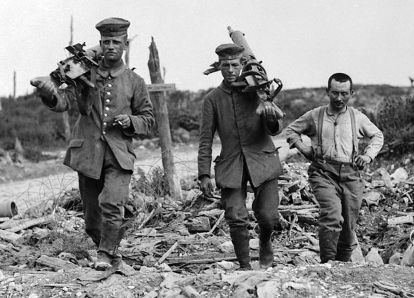German First World War 7.92-mm Maxim Spandau MG 08/15 Machineguns carried by German Prisoners of War captured by Canadians, June 1917.