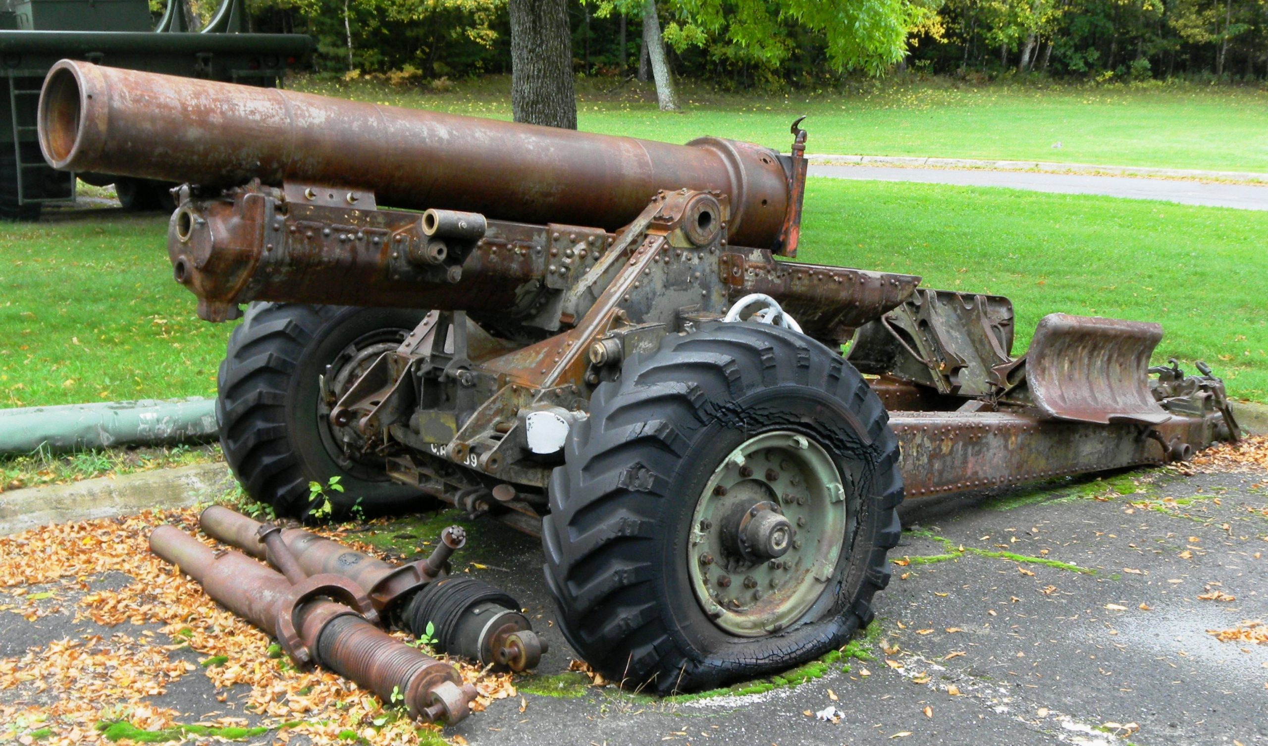 5.5-inch BL Mk. III Gun on a Mk. I Carriage, weight 1-14-1-0 (12,000 + 1,568 + 28 = 13,624 lbs), King George VI cypher, to be restored, currently in the NBMHM storage compound.  Canada made carriages for these guns during the Second World War, and after the war acquired 85 of them for the RCA.  The gun fired a 45.5-kg (100-pound) shell to a range of 14,800 metres (16,200 yards).  A missing barrel for this gun has recently been sourced at CFB Edmonton, and hopefully the parts will be mated and assembled some time in the near future!
