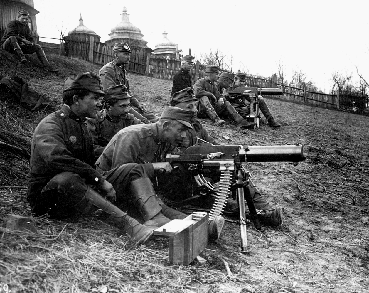 First World War Austro-Hungarian Army soldiers manning a 7.92-mm Schwarzlose M07.12 Machine Gun, possibly somewhere on the Russian or Serbian front.  This MG is similar to one held in the NBMHM.