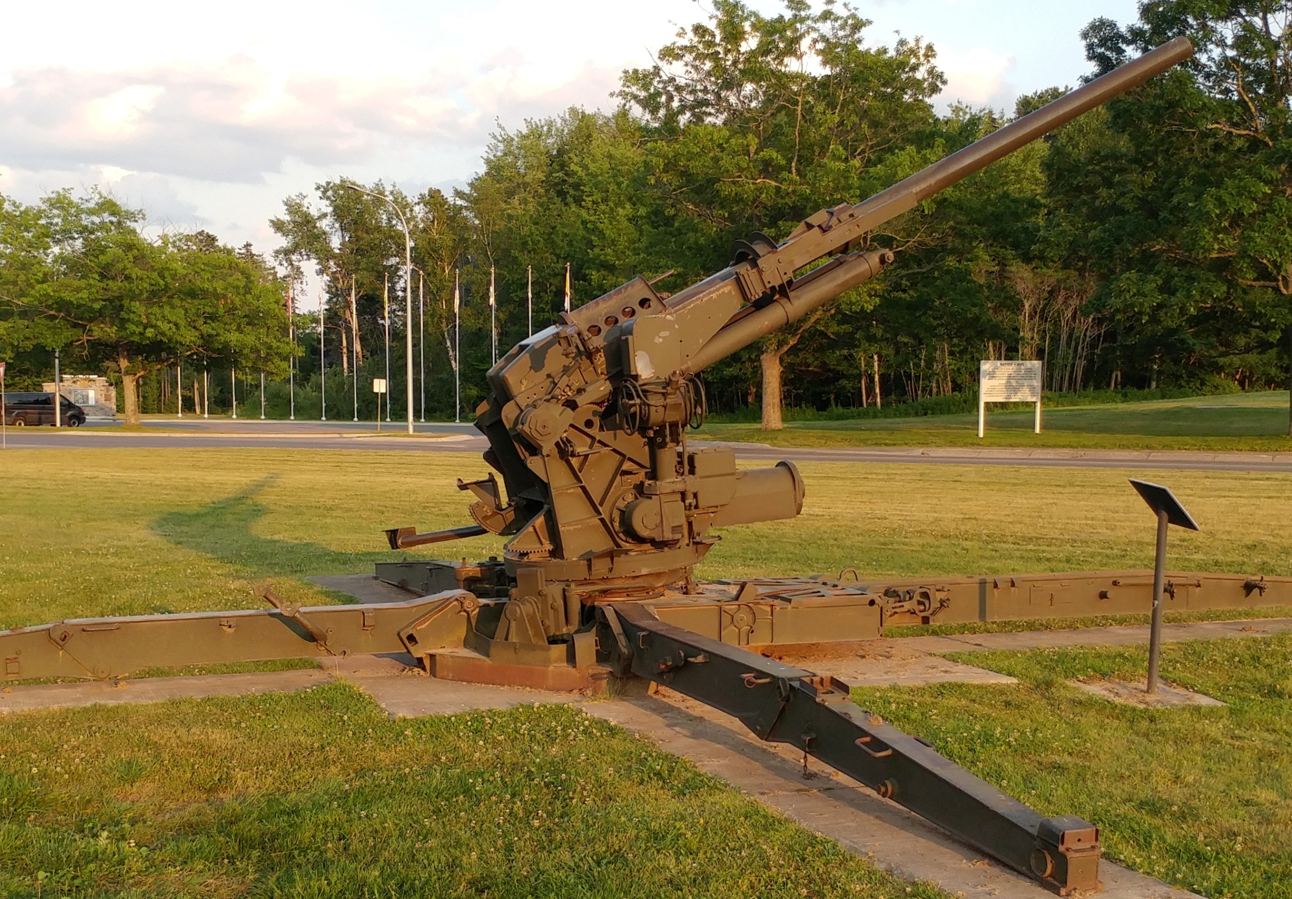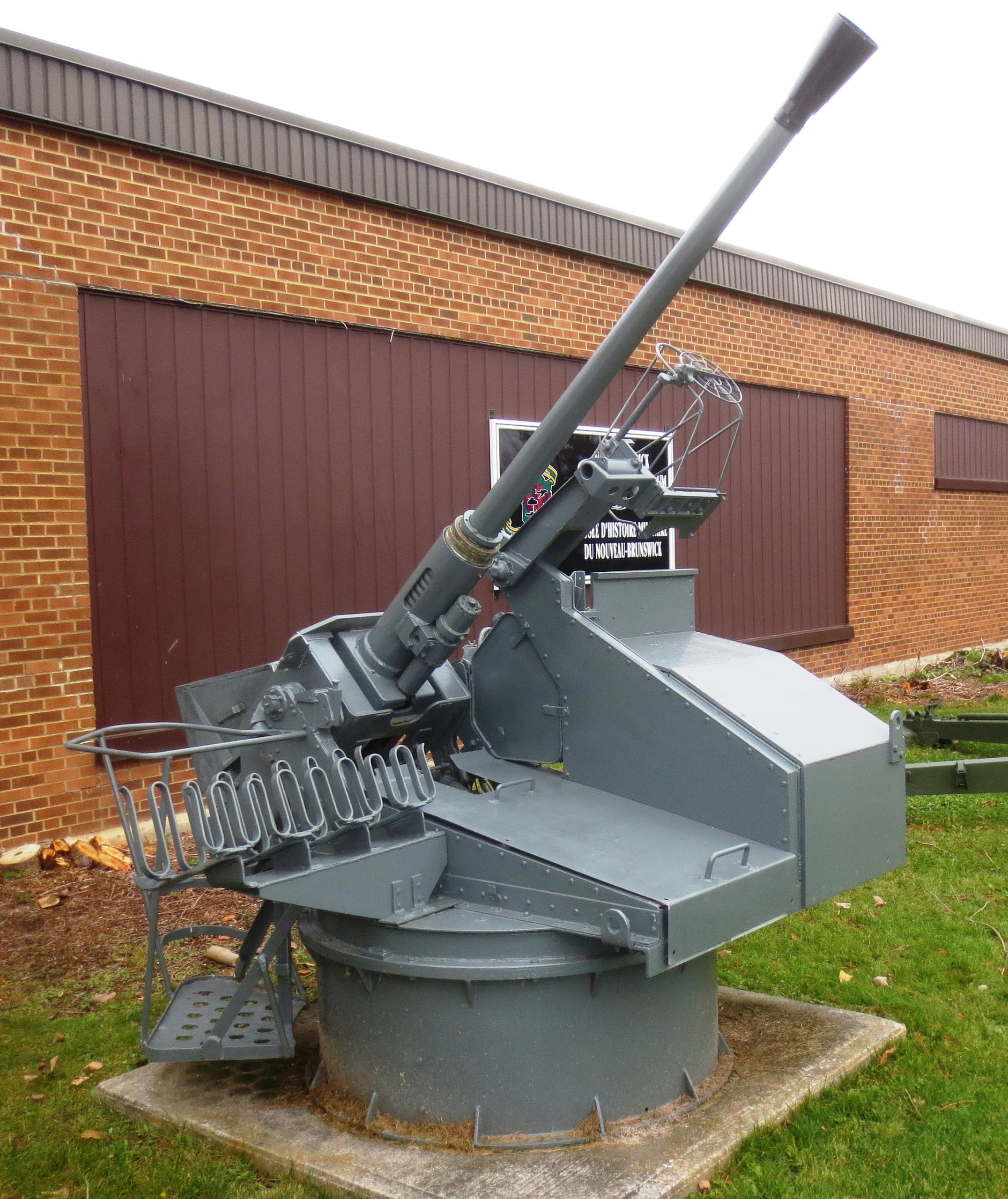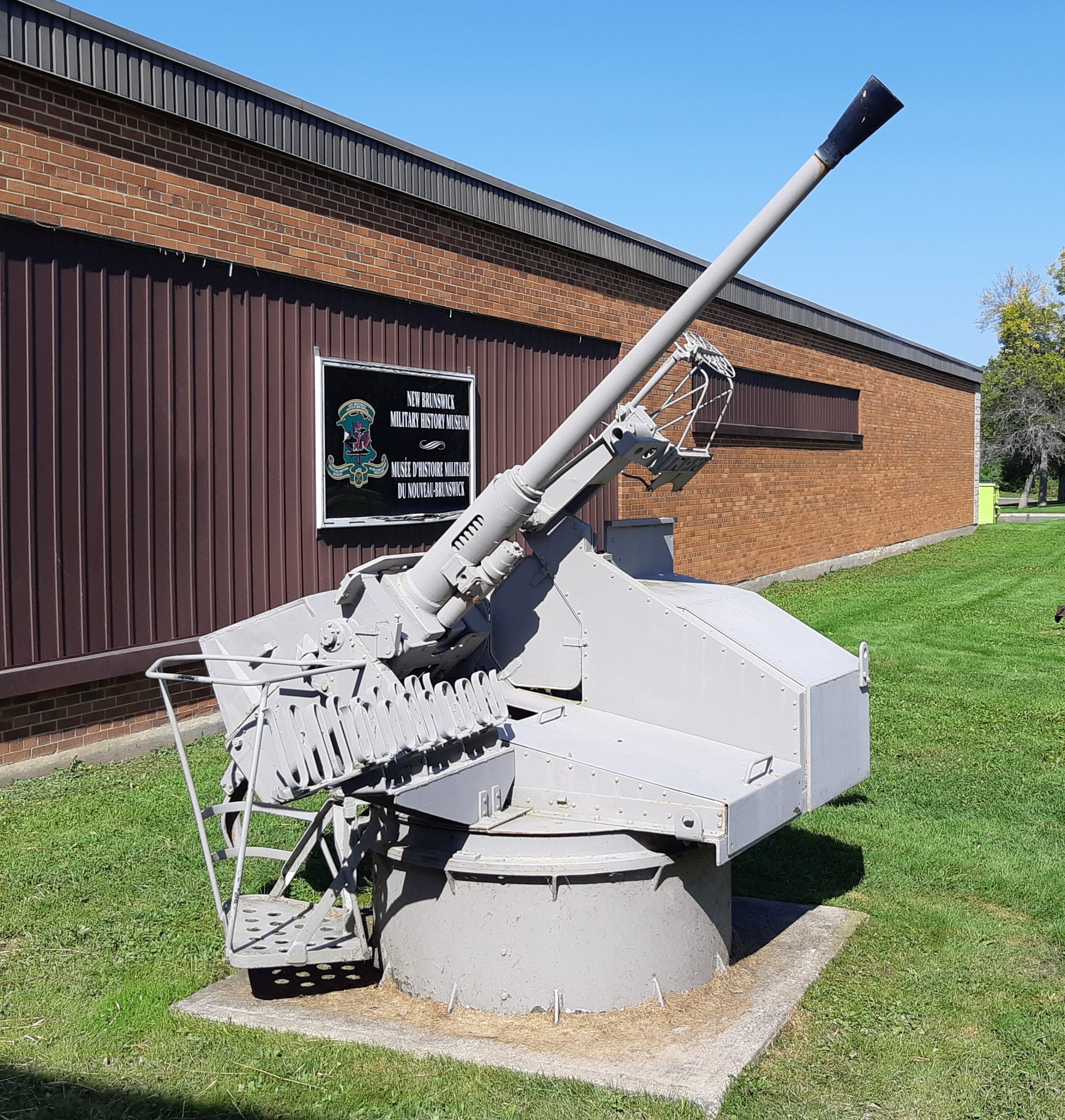 40-mm Bofors Light Anti-Aircraft Gun in a Naval gun mount, 1945, outside the front entrance of the museum.  This Bofors came from HMCS Bonaventure, Canada’s last Aircraft carrier.