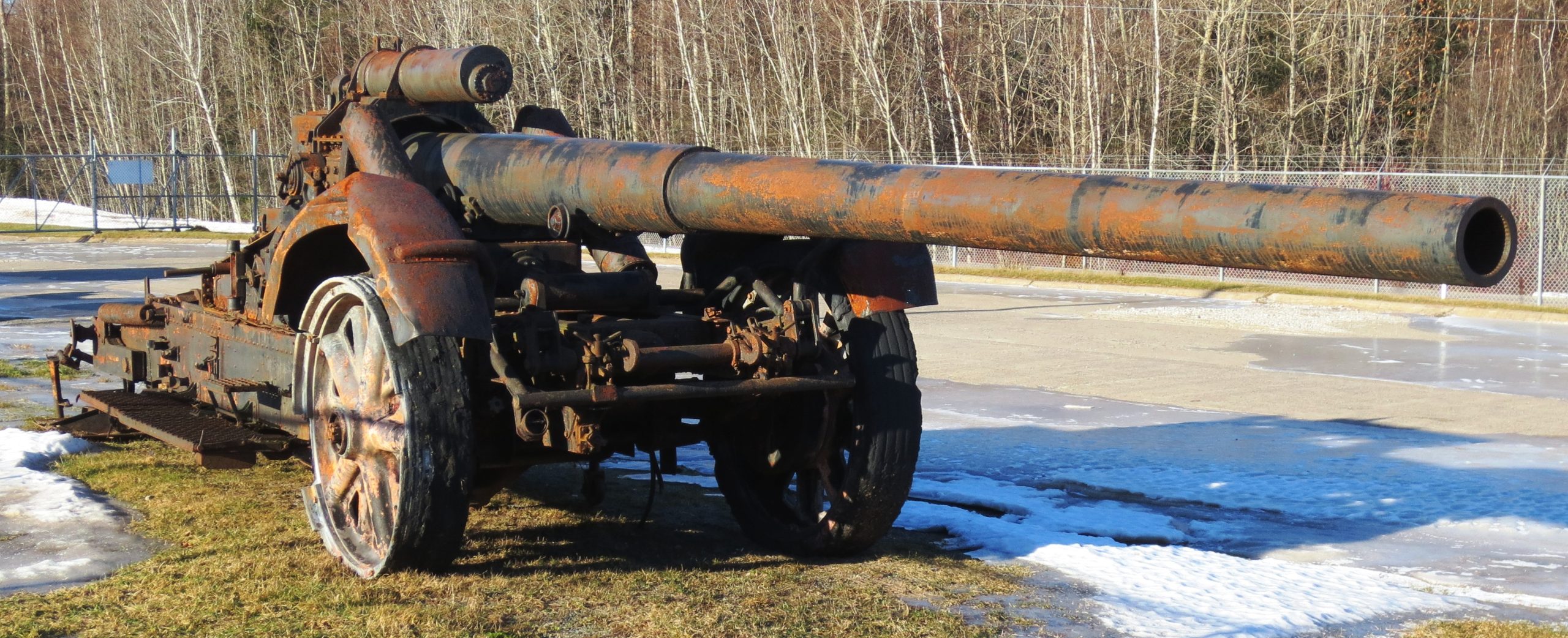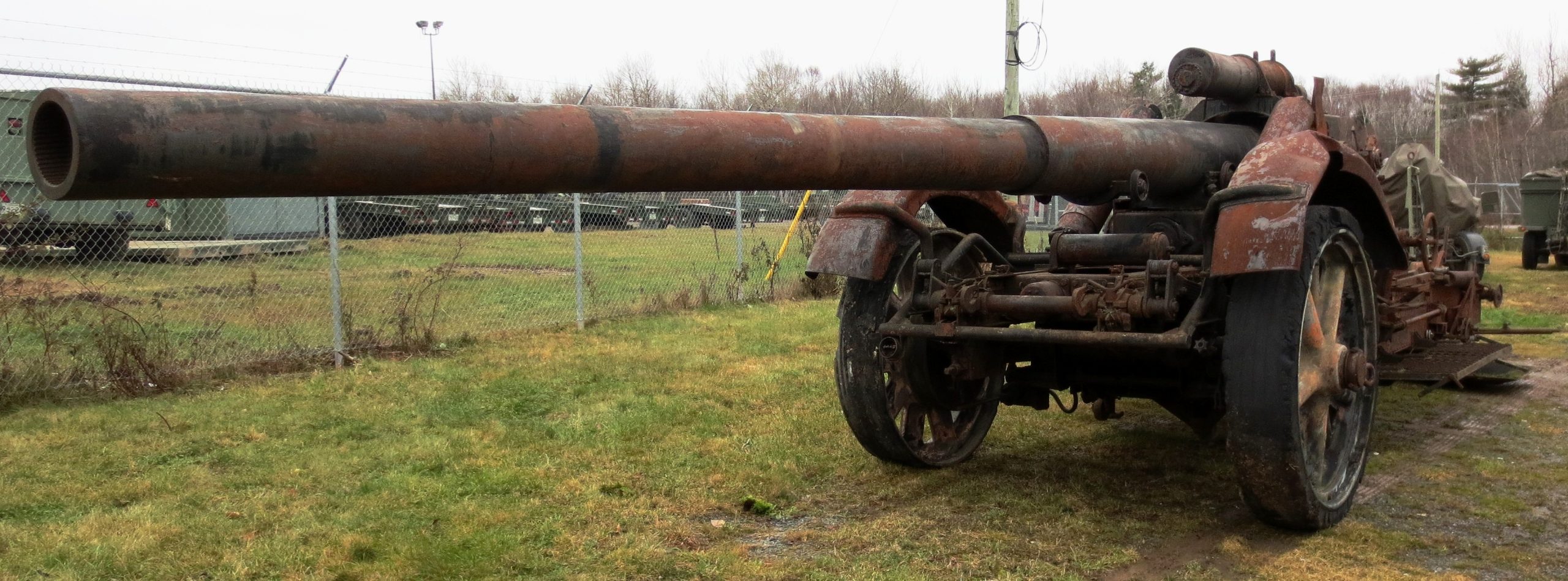 German Second World War 17-ton 17-cm Kanone 18 (K18) in Mörserlafette (on a big gun carriage), (Serial Nr. R320), 1942, bye.  This gun was sent from Europe to Aberdeen in the USA on 3 Mar 1945, along with a new spare barrel, and then to Valcartier, Quebec later in 1945.  It was located in the Munitions Experimental Test Centre (CEEM) at CFB Valcartier, until it was transferred to the New Brunswick Military History Museum (NBMHM), with 5 Canadian Division Support Base Gagetown, on 4 Dec 2012.   Once it has been restored, it will be displayed in front of the museum.
