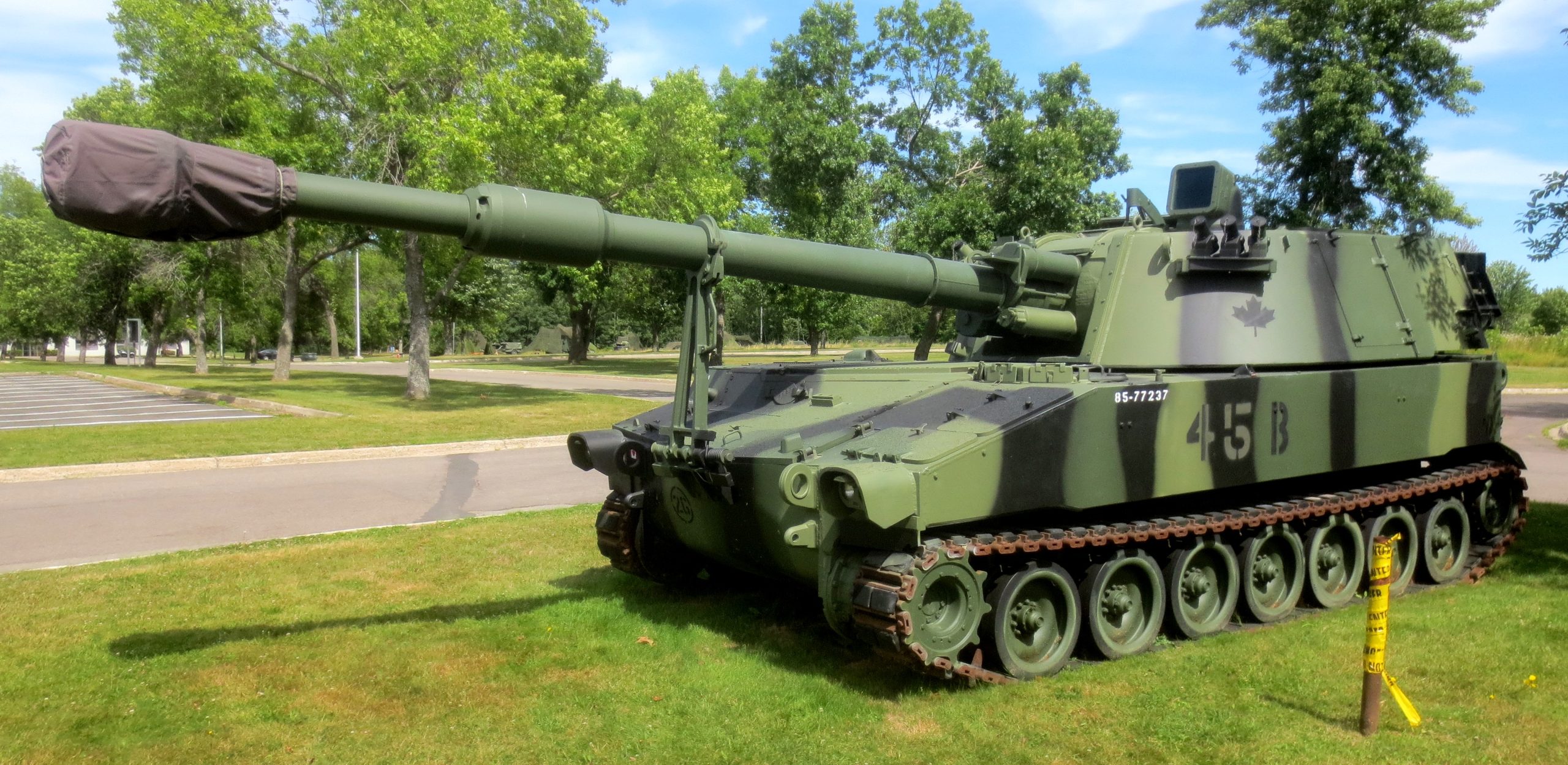 155-mm M109 Self-Propelled Howitzer, CFR 85-77247, 1985, AC: NX, ECC: 119205 HUI C: 0105, SAUI C: 0105, VMO No. DLE21802, VMO.  Painted as 45B.  This is the fourth vehicle on the right on the right as you enter 5 CDSB Gagetown.