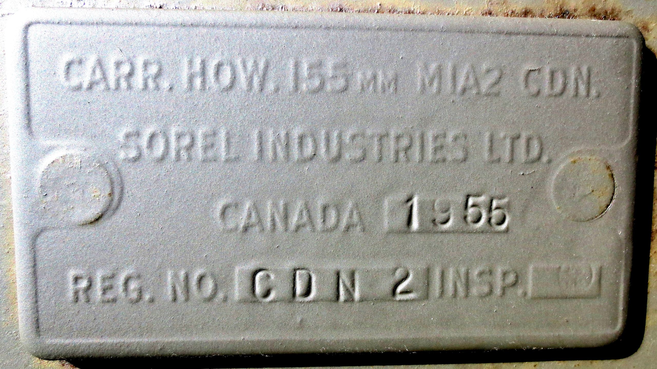 155-mm C1 (M1A2) Medium Howitzer on M1A2 Carriage, aka M114, manufactured at Sorel Industries Limited in Quebec, Queen Elizabeth II cypher.  CFR 00-34411.  The carriage plate reads: CARR. HOW. 155MM M1A2 CDN. SOREL INDUSTRIES LTD. CANADA 1955, REG. NO. CDN 2, INSP (symbol).  This gun is located in front of the museum.