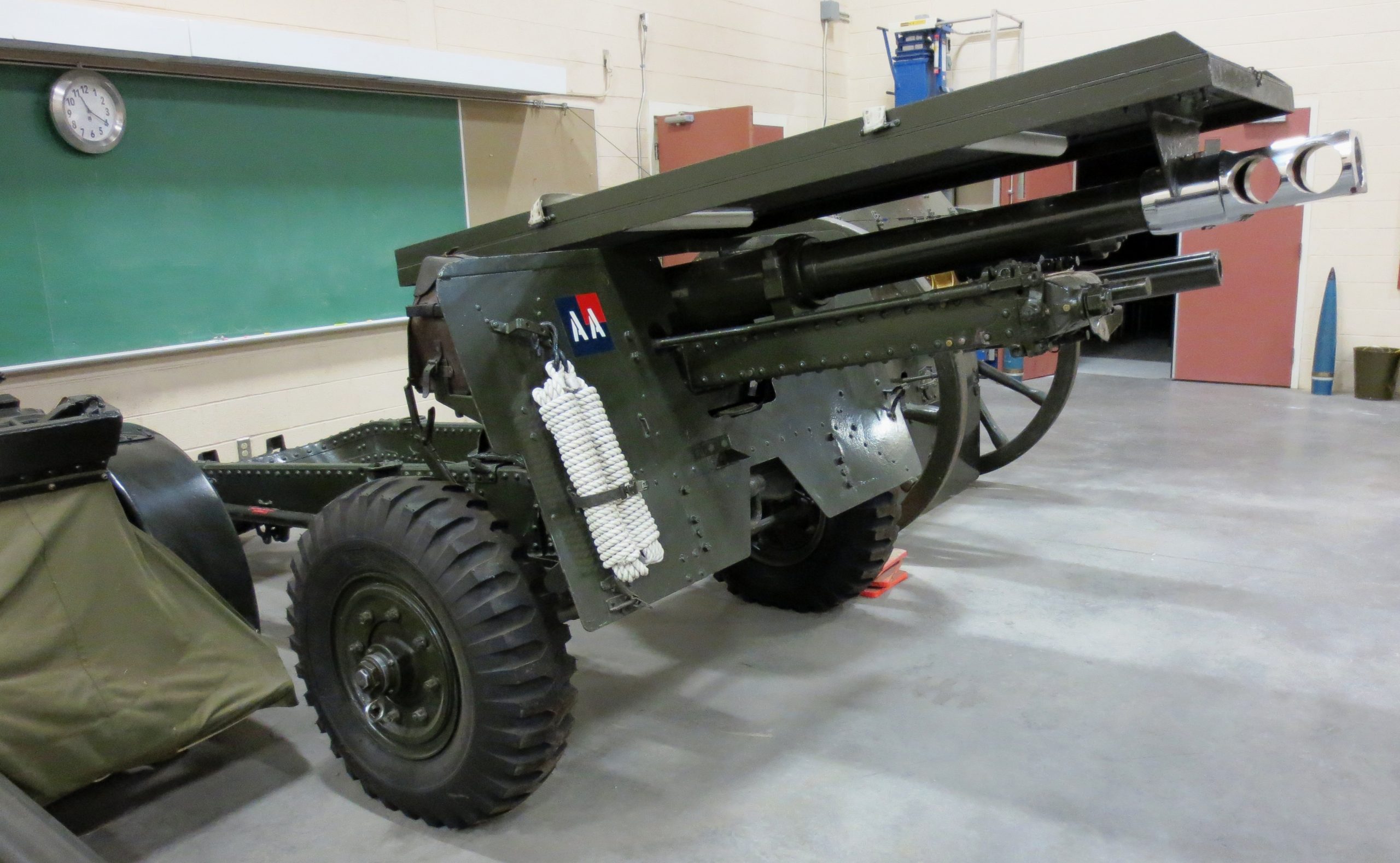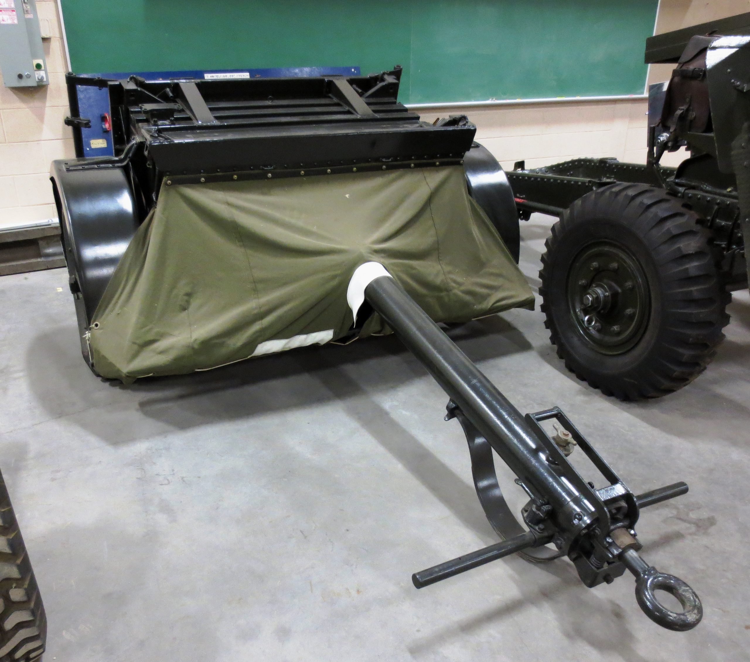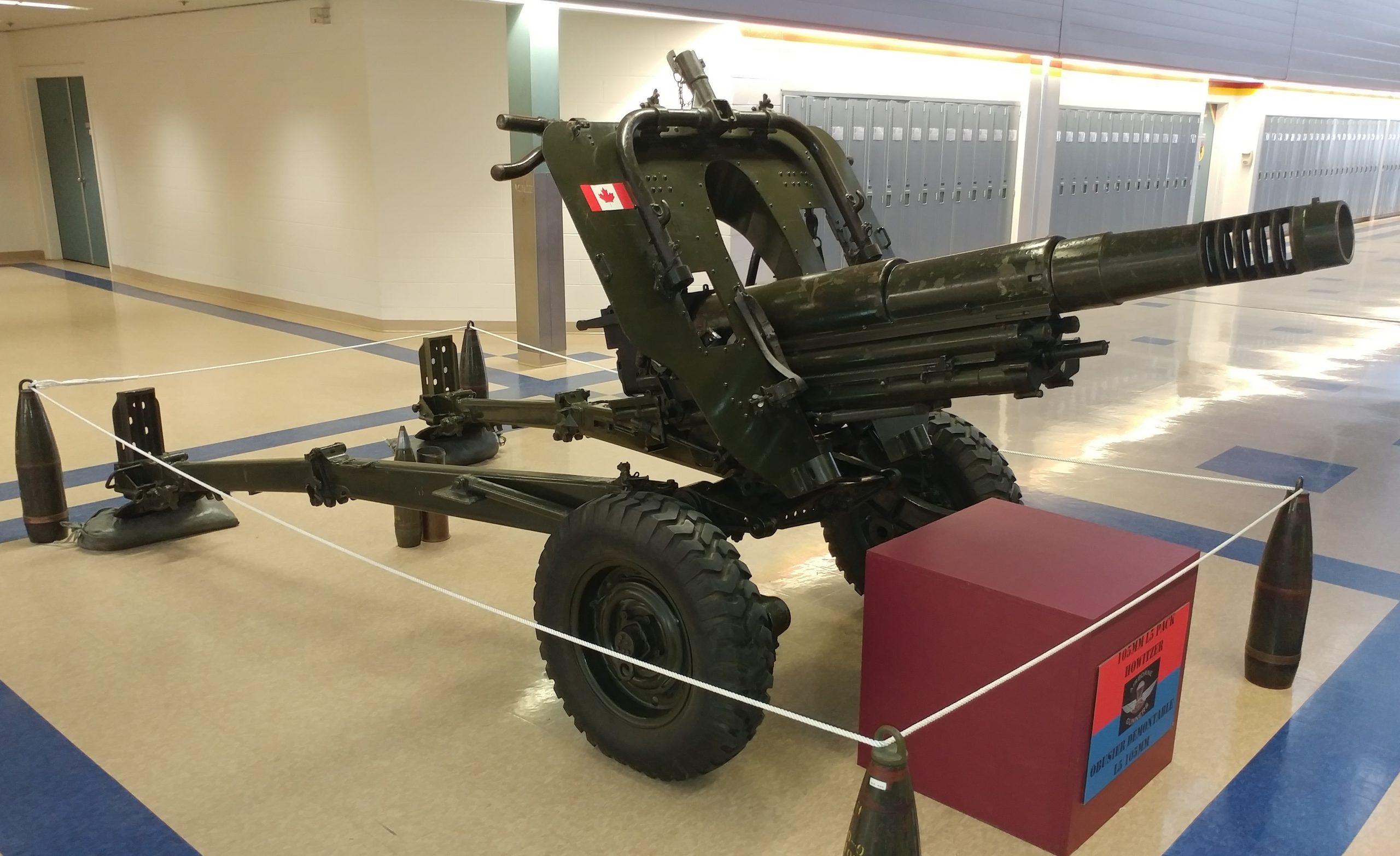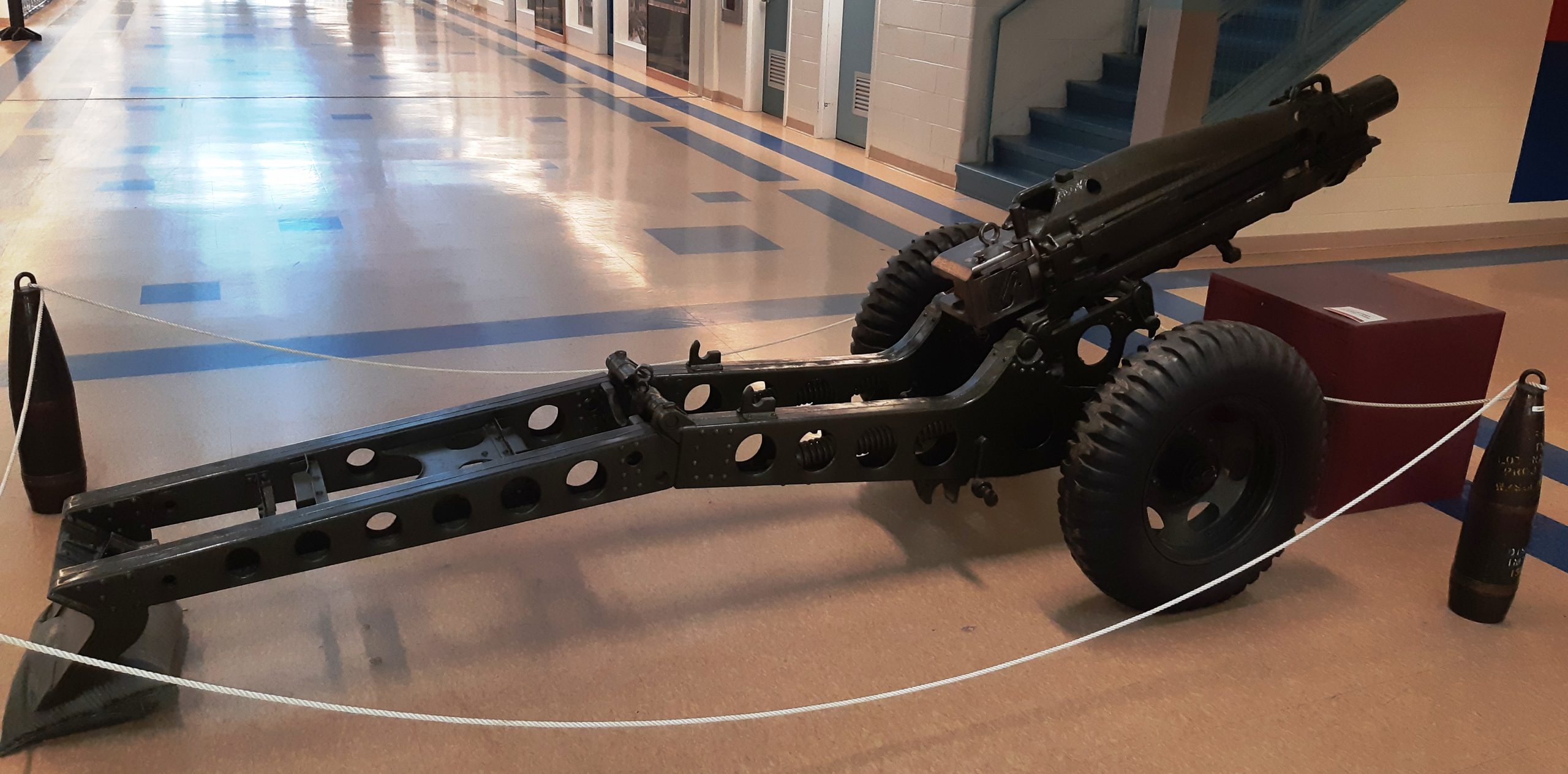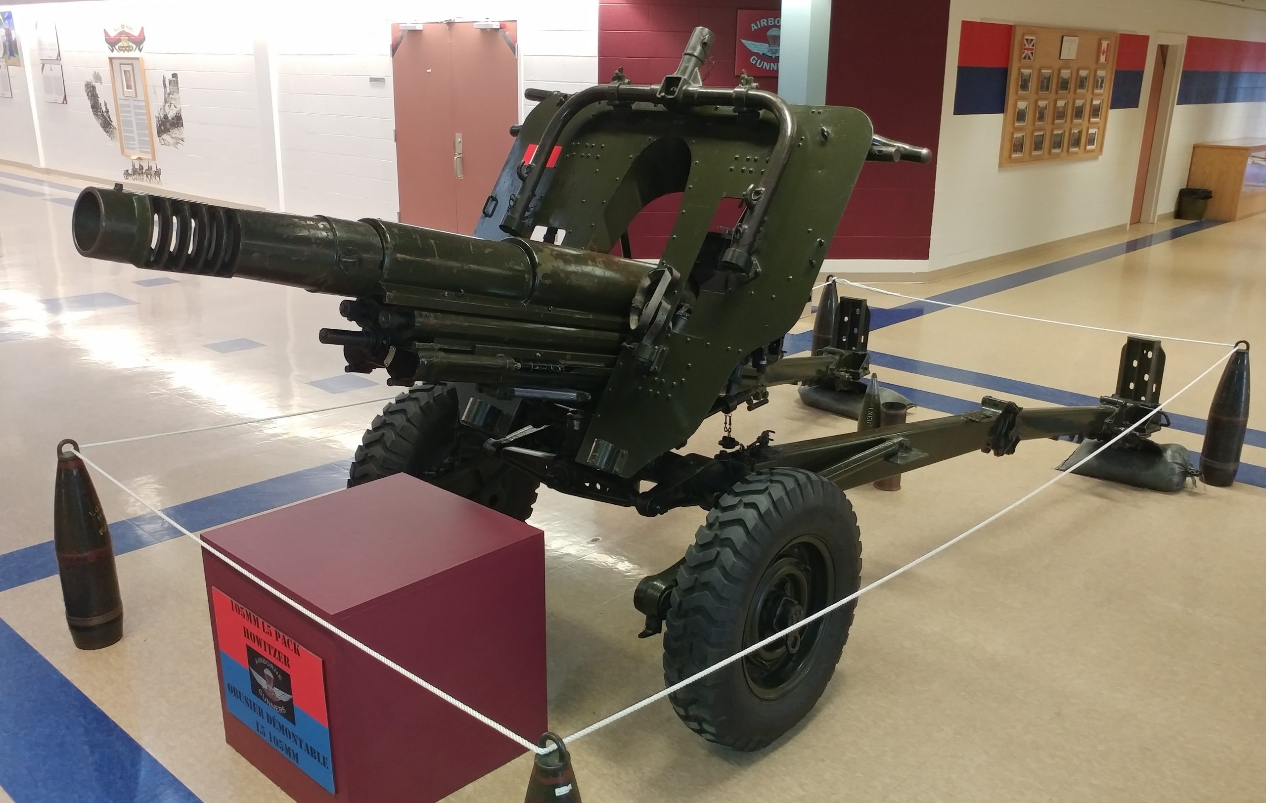 American 75-mm QF M1A1 Pack Howitzer (Serial No. 3063), on an M8 Carriage, Arsenal No. 5024, inside the school.  This gun is on loan from the RCA Museum, CFB Shilo, Manitoba.