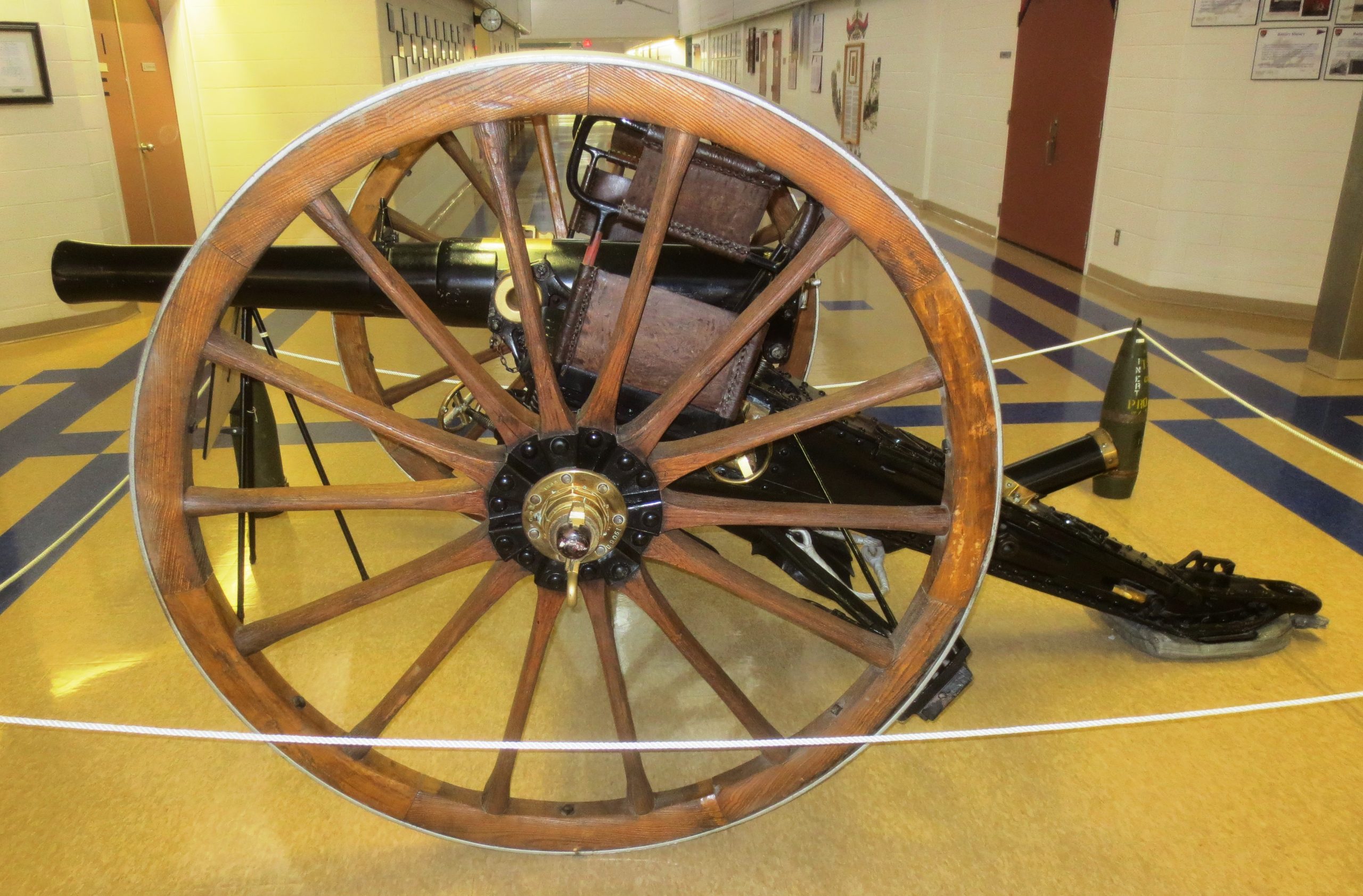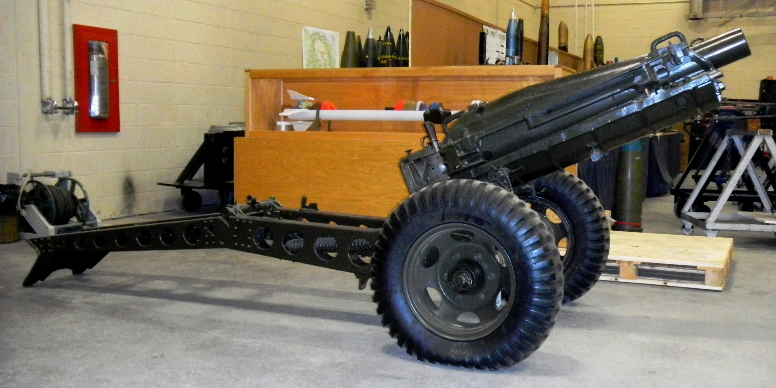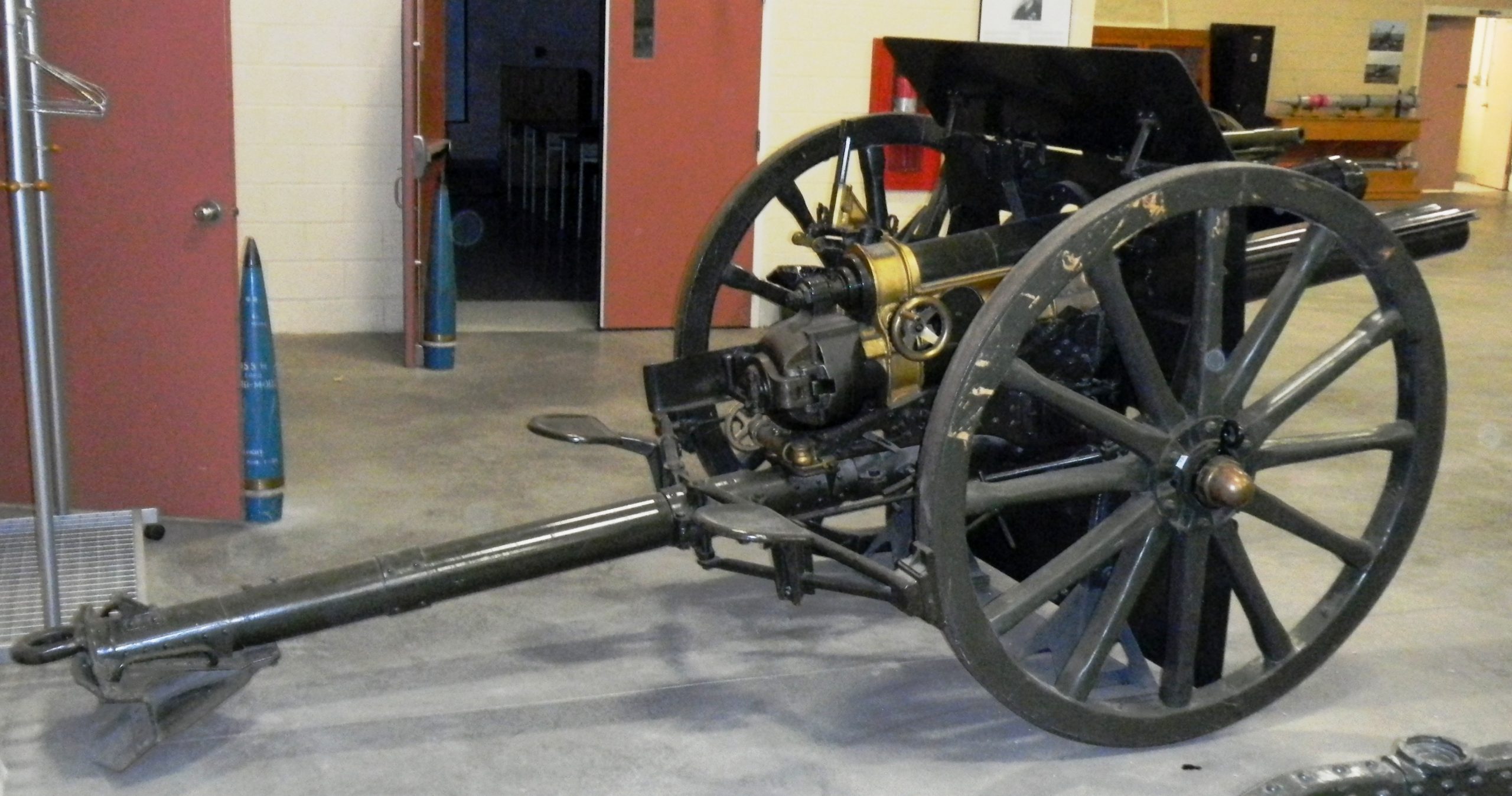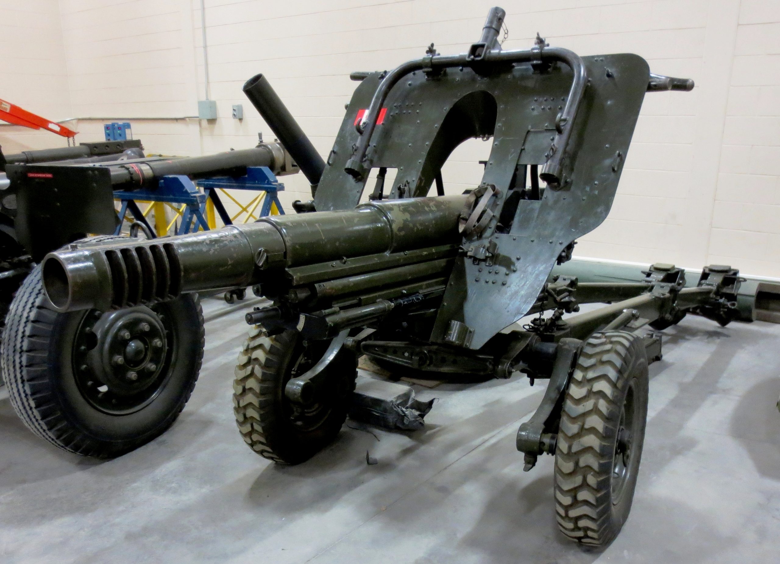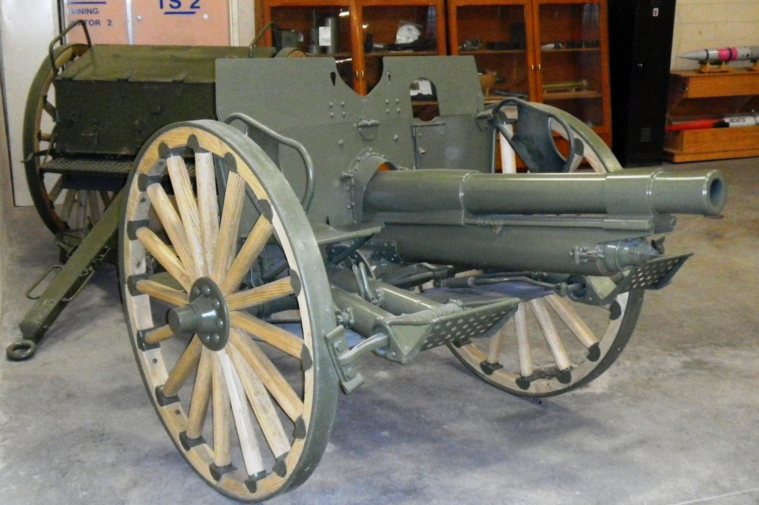 American 75-mm QF M1A1 Pack Howitzer (Serial No. 3063), on an M8 Carriage, Arsenal No. 5024, inside the school.  This gun is on loan from the RCA Museum, CFB Shilo, Manitoba.