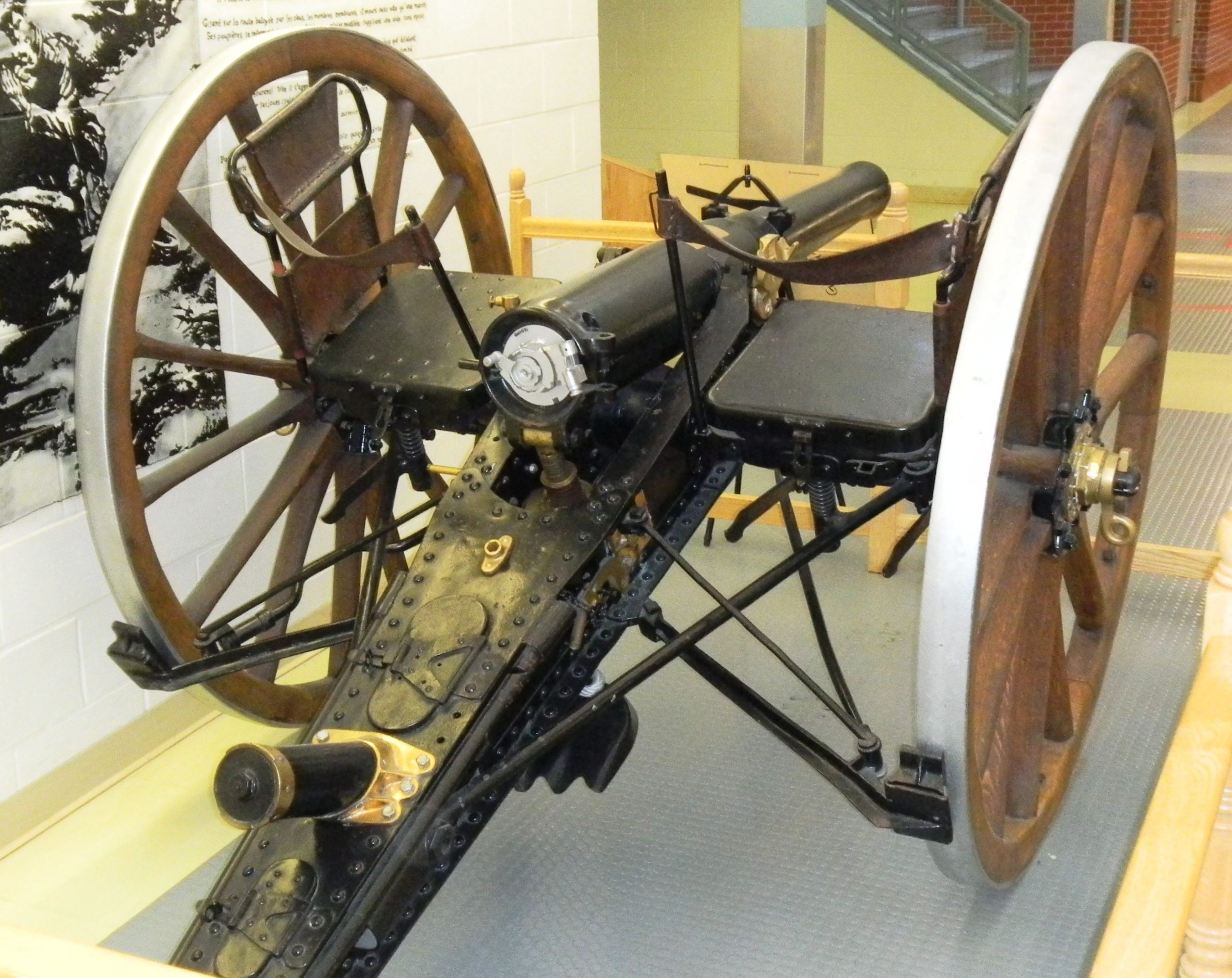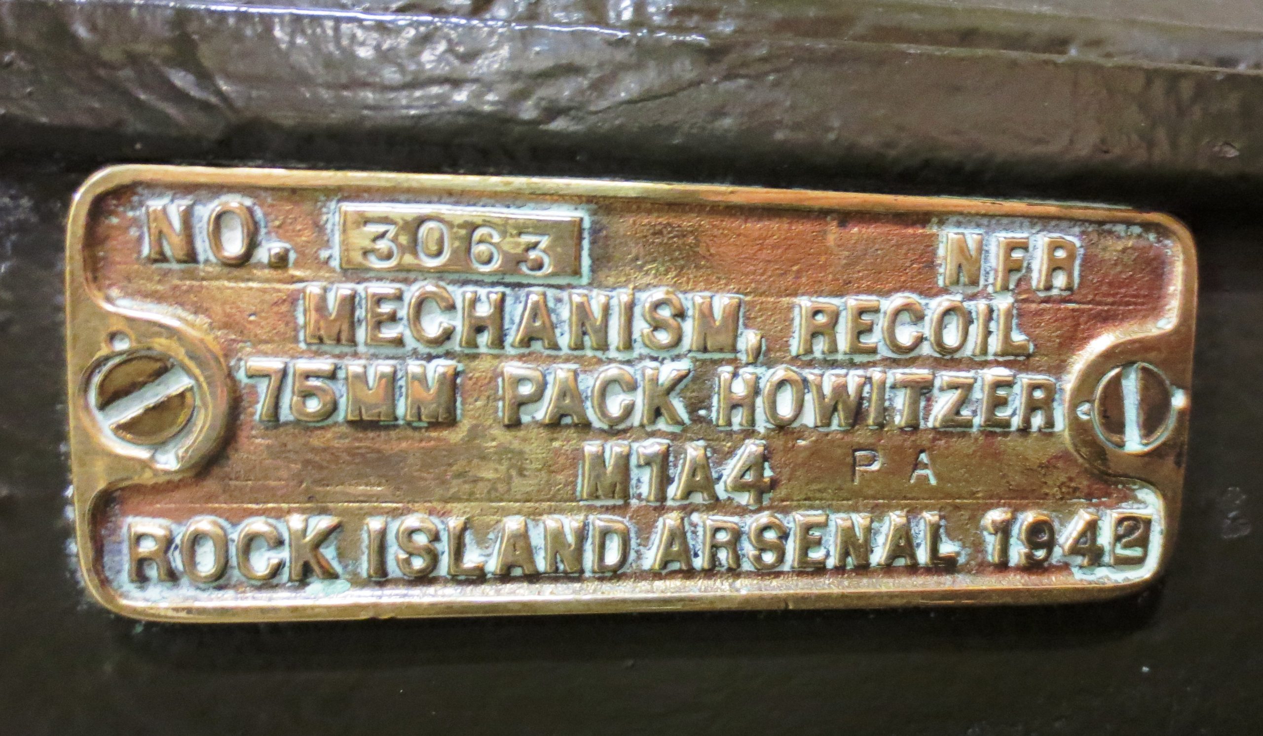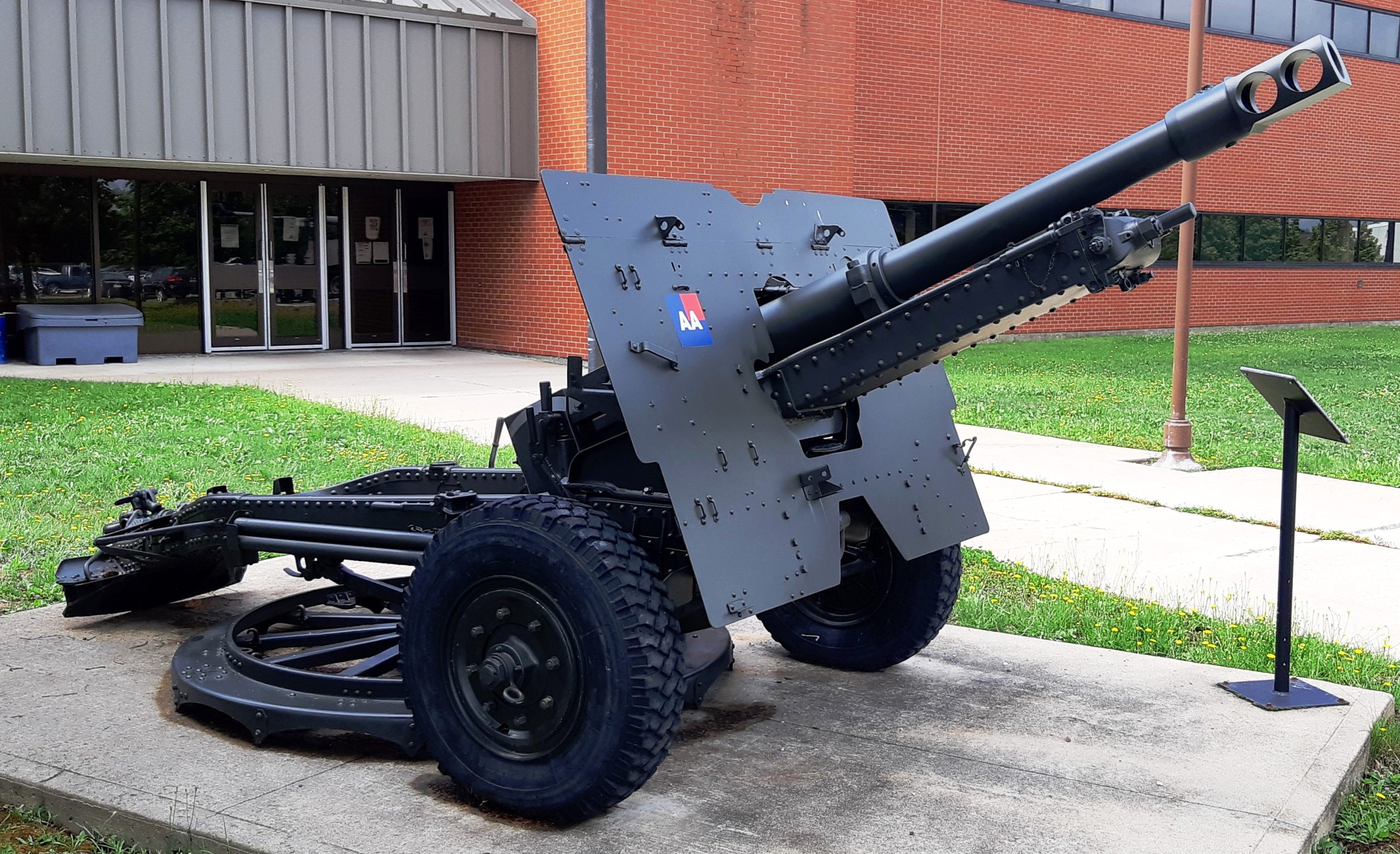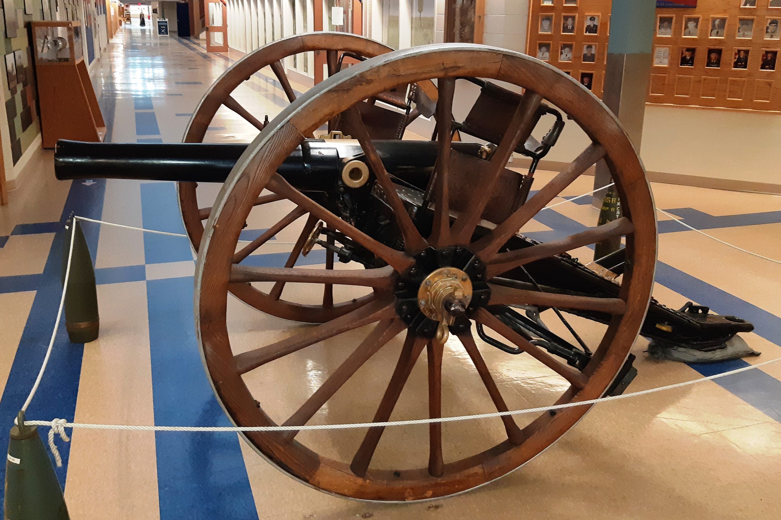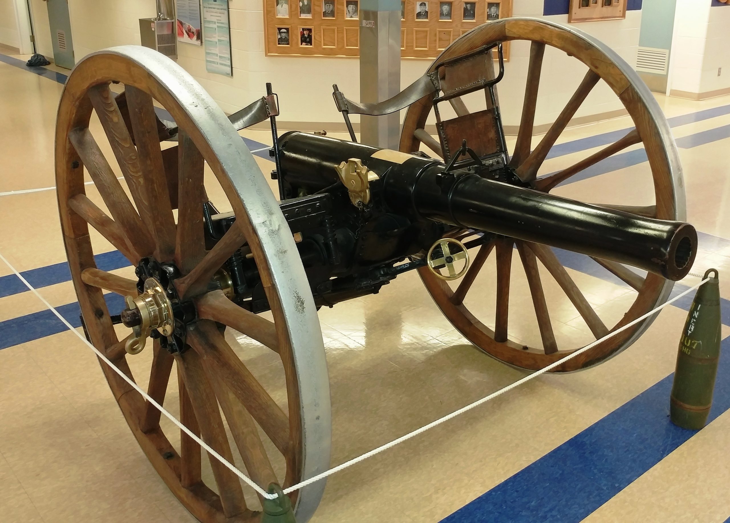 American 75-mm QF M1A1 Pack Howitzer (Serial No. 3063), on an M8 Carriage, Arsenal No. 5024, inside the school.  This gun is on loan from the RCA Museum, CFB Shilo, Manitoba.