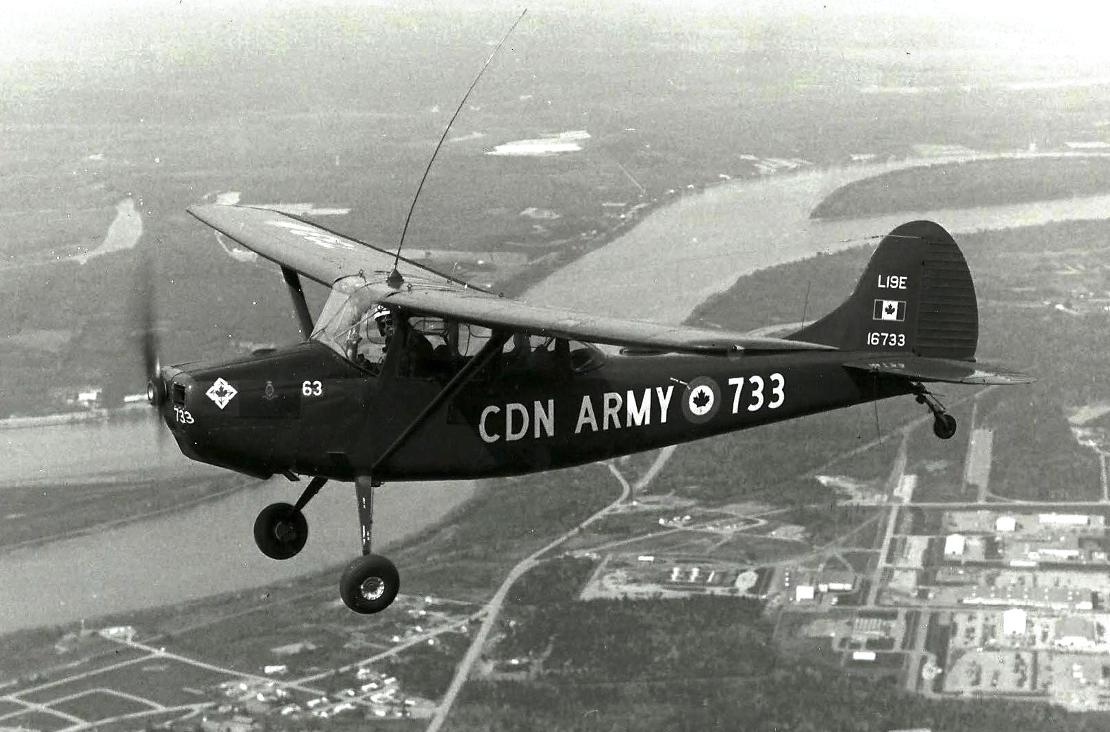 Cessna L-19E Bird Dog (Serial No. 16733), Canadian Army, Royal Canadian Artillery Spotter aircraft in flight over CFB Gagetown, July 1973.  (Photo courtesy of the Shearwater Aviation Museum)