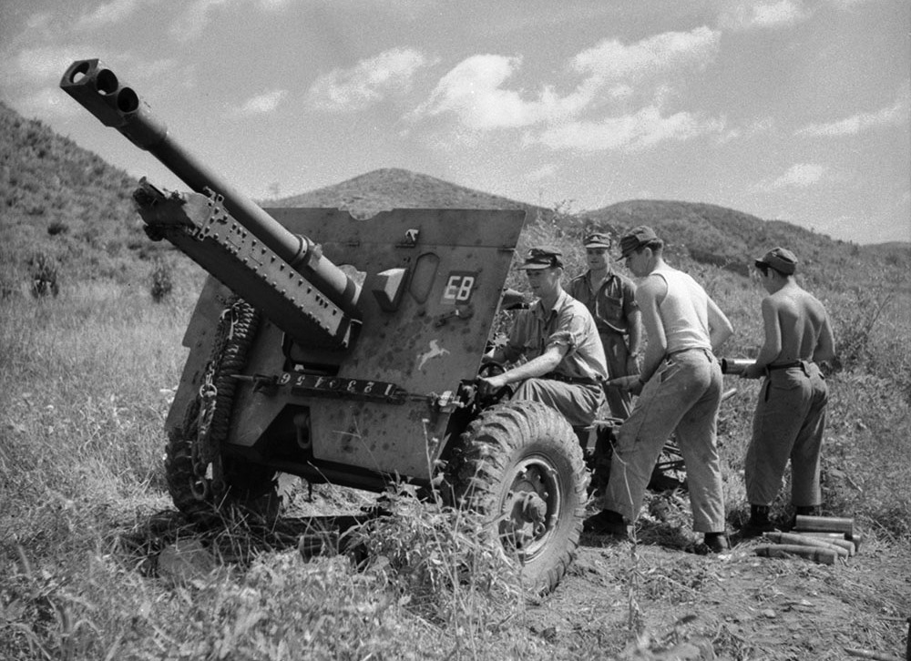 L/Bdr D. Robertson, Sgt W. Malcolm, Gunner R. Flemming and Gunner J. Gaudet (left to right), Royal Canadian Horse Artillery (RCHA), ready to fire 25-pounder, 26 Sep 1951.