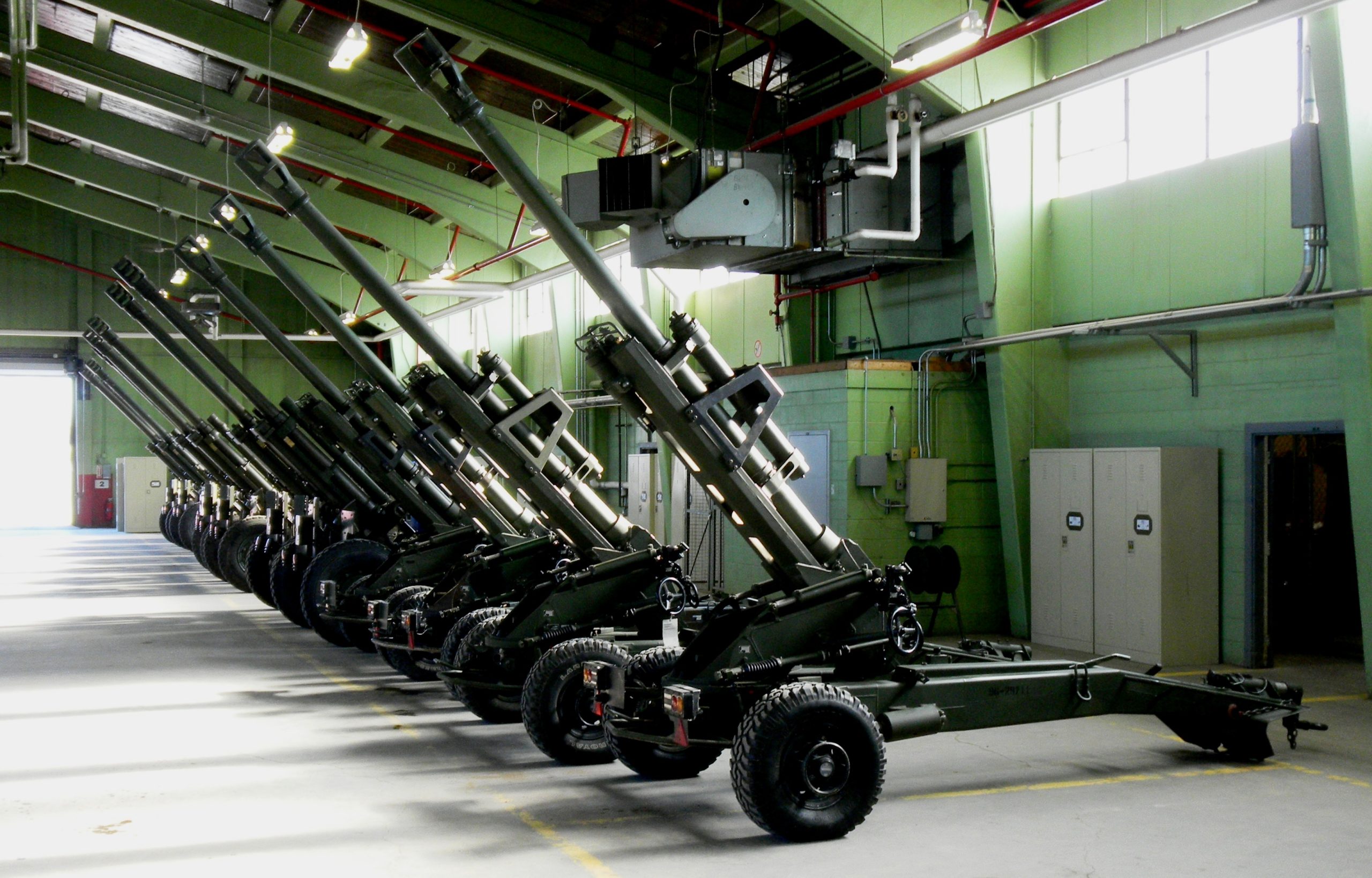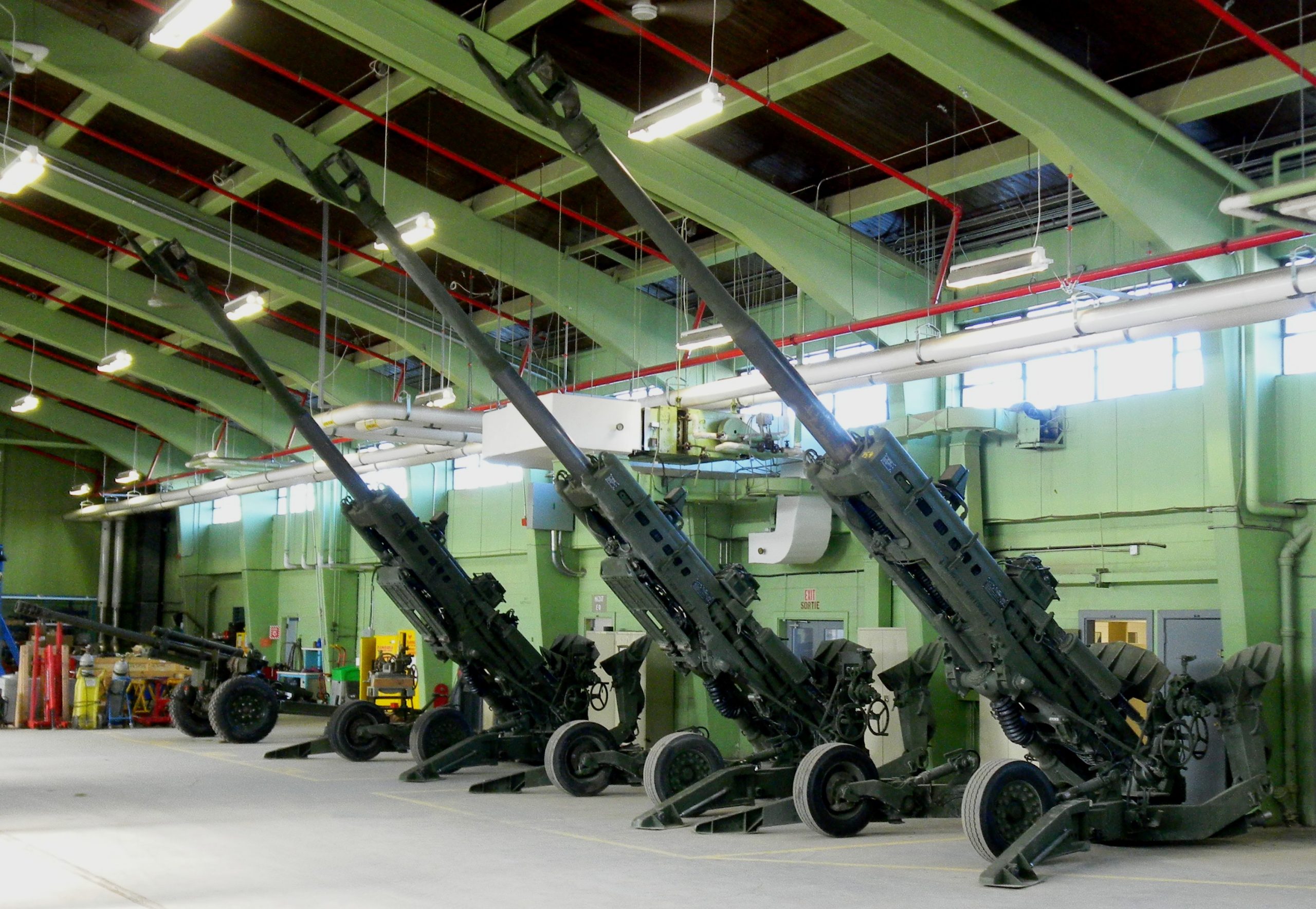 155-mm M777 Howitzers inside the K Line hangar of the Royal Regiment of Canadian Artillery School (RCAS), 5 Canadian Division Support Base Gagetown, New Brunswick.