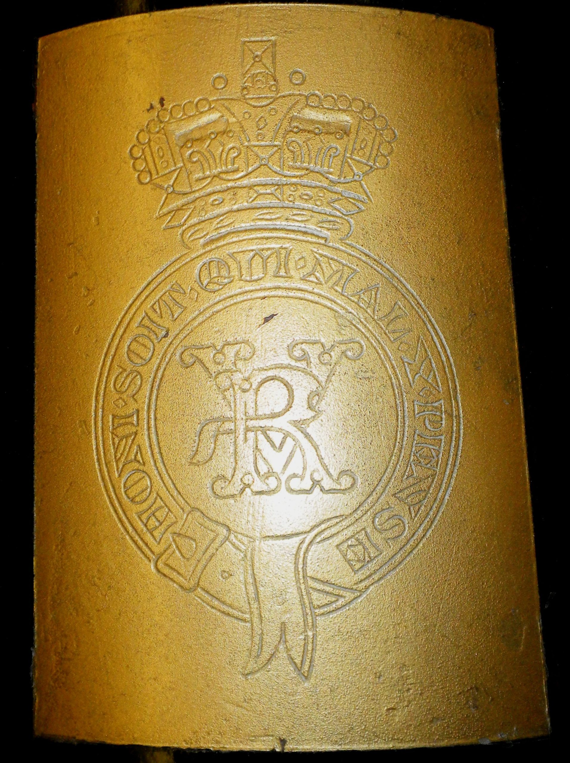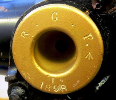 12-pounder 6-cwt Breechloading Mk. IV Gun, weight 6-0-9 (681 lbs), made by Armstrong, mounted on a wheeled carriage, Queen Victoria cypher, inside the school.  No. 136, RGF 1898, 12 pdr 6 cwt on right trunnion.  RCD 1910 on right wheel hub, RCD 1896 on left wheel hub as well as 628470.  No. 20 on the carriage box trail.  1307024 on the breech.