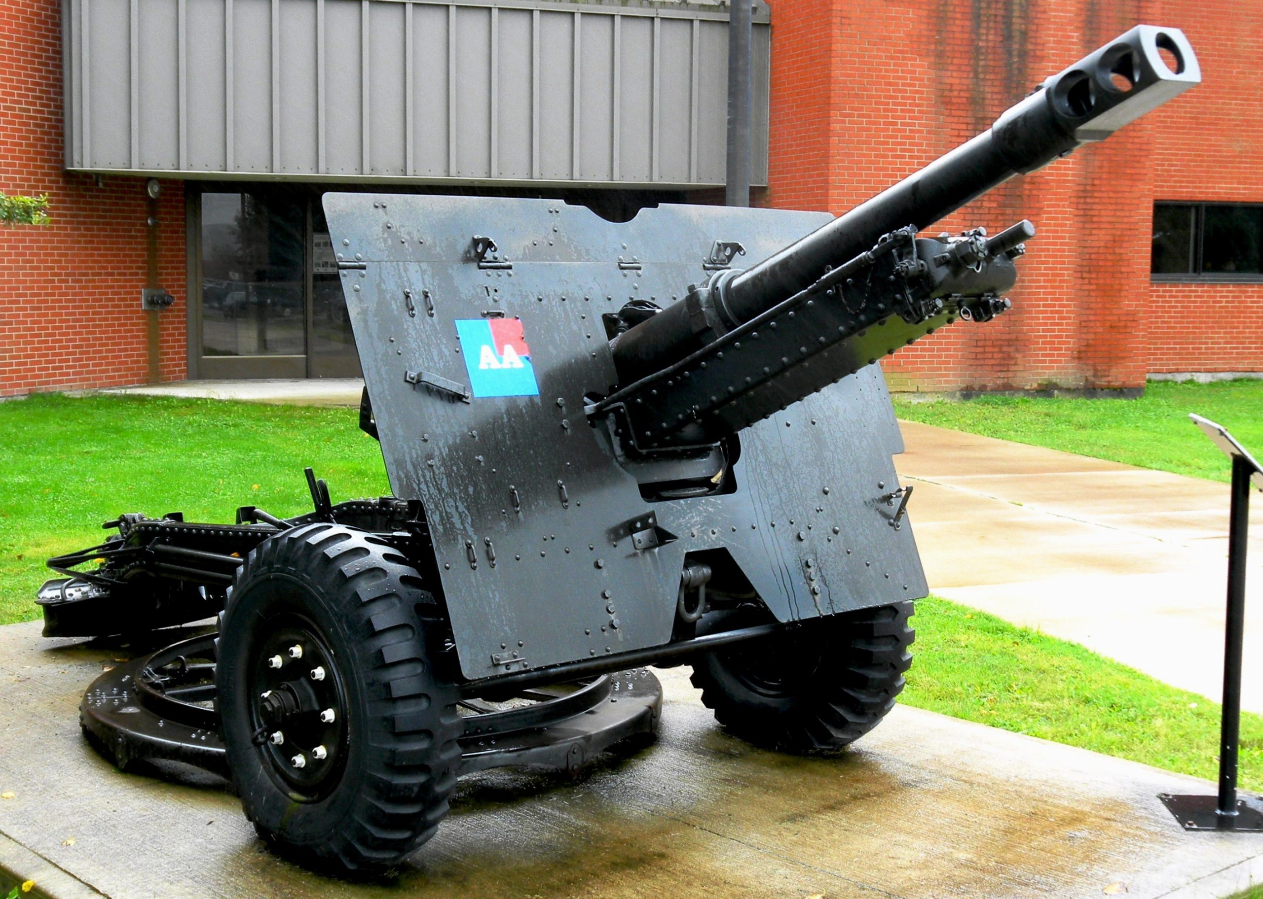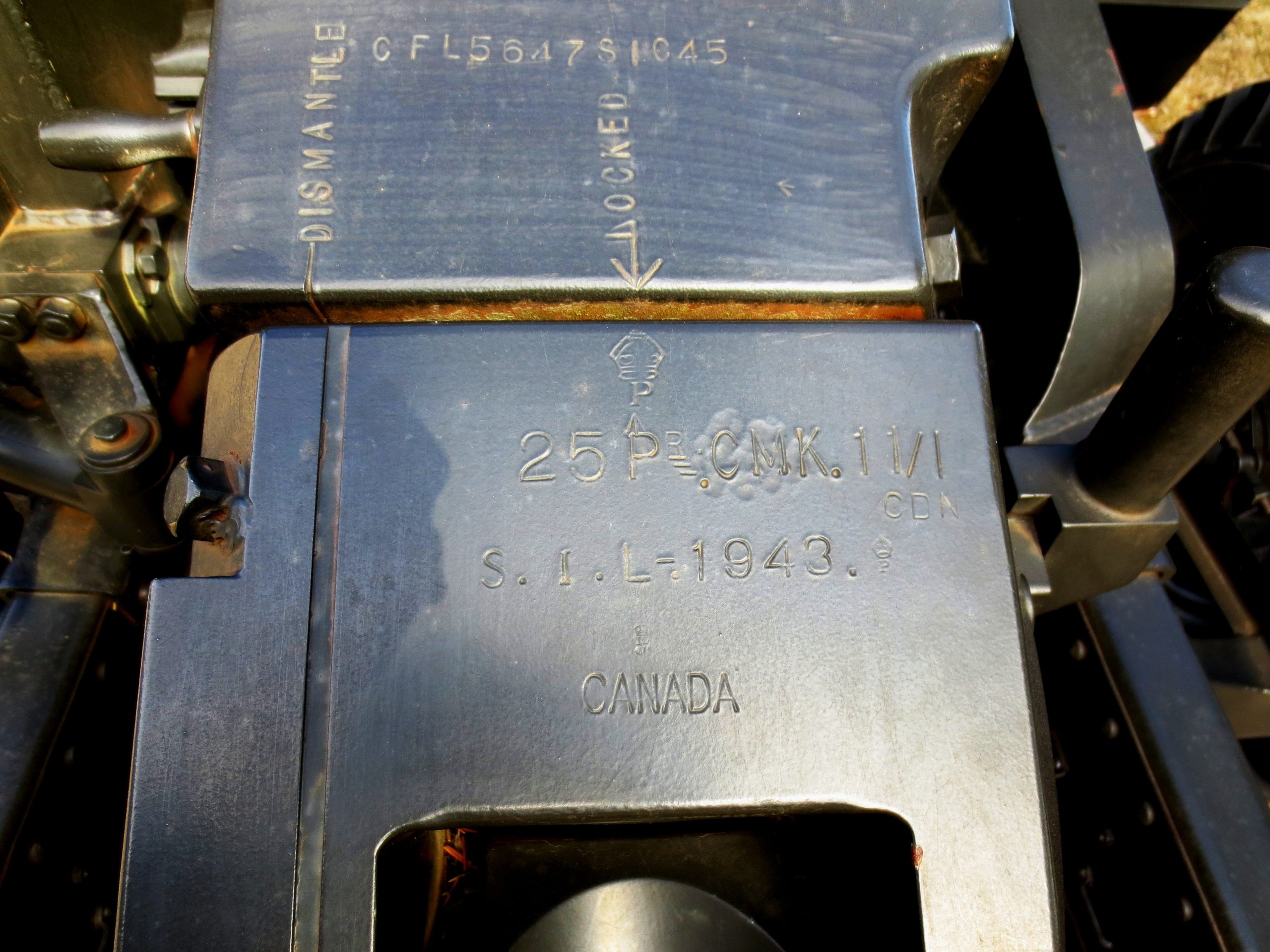 French Hotchkiss 25-mm APX modèle 1937 or Canon de 25 mm semi-automatique modèle 1937 (canon de 25) anti-tank gun (Serial No. 2206), stamped APX 1940, G 25, SAL 1937.  This gun was captured by the German Army c1940 during the Second World War. The Germans used a number of captured guns under the designation 2.5 cm Panzerabwehrkanone 113(f) (25 PstK/37).  They were used to arm Atlantic Wall fortifications in France and the occupied Channel Islands.  This gun was recaptured by the Allies, and is now on display outside the RRCAS’s K lines.