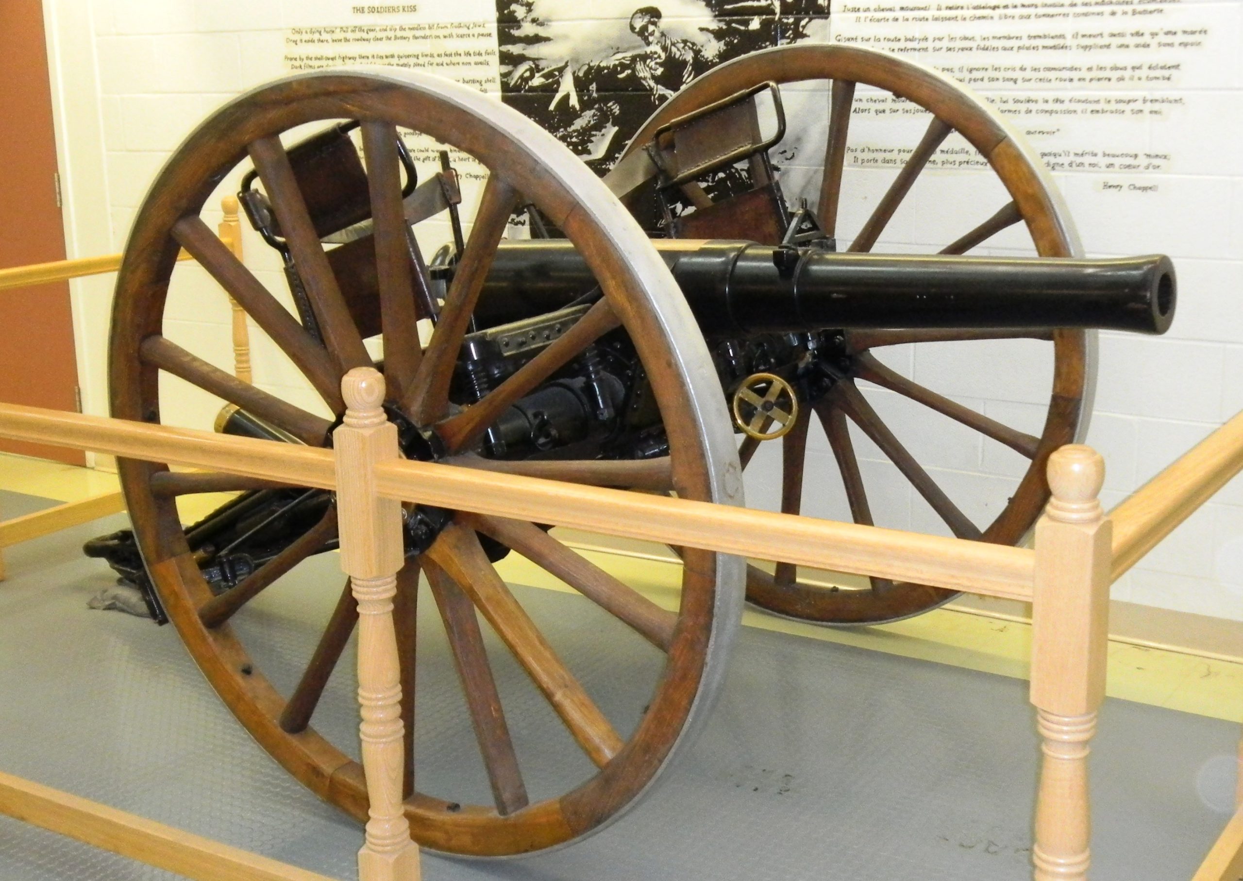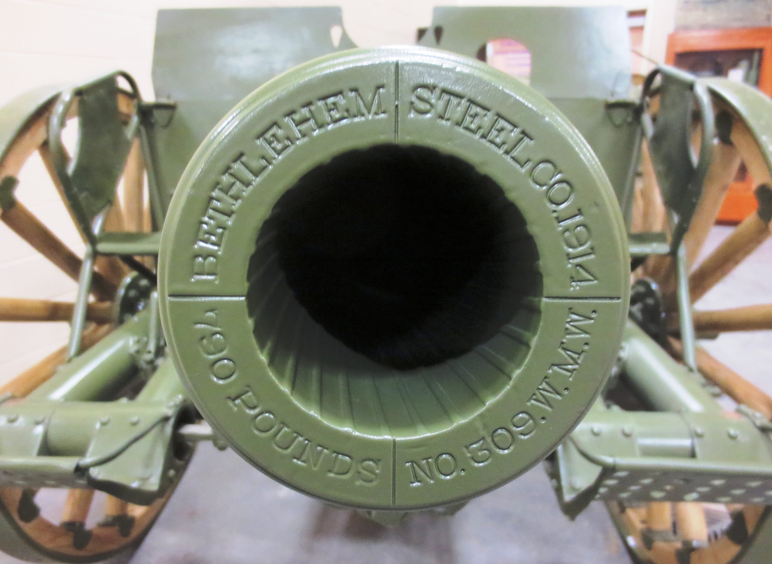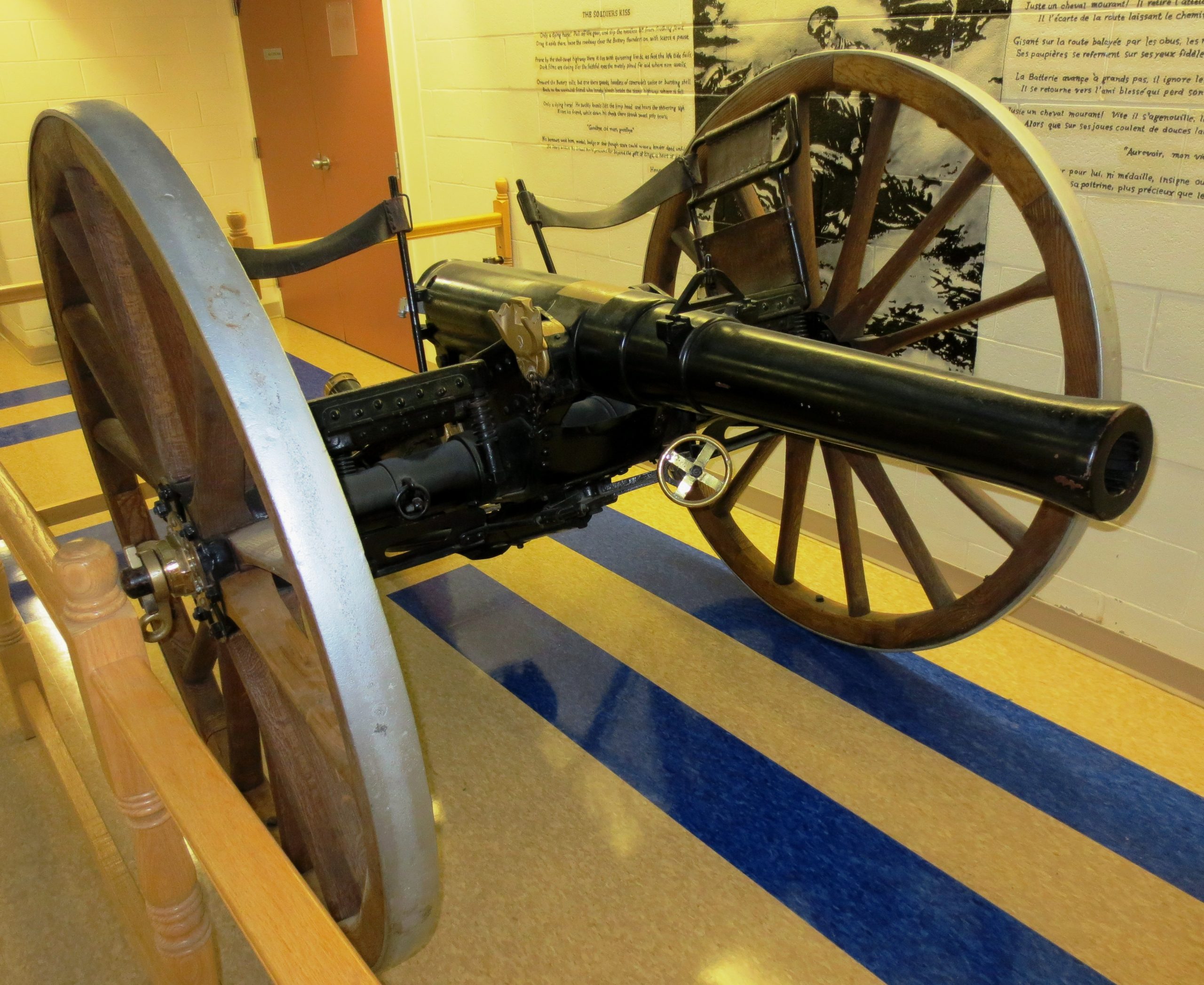 American 75-mm M1917 Field Gun, Bethlehem Steel Coy, 1912, 995 Pounds, (Serial No. 489) on the muzzle.  This gun is mounted on a 75-mm Gun Carriage Model of 1917 (British), Bethlehem Steel Company, 1918, (Serial No. 2079), MMC, according to the builder’s plate on the carriage.  This gun is on loan from the Royal Canadian Artillery Museum.  This is an American version of the British QF 18-pounder modified to fire French 75-mm ammunition.  One other gun, an  M1917A1, is preserved in the RCA Museum, CFB Shilo, Manitoba.