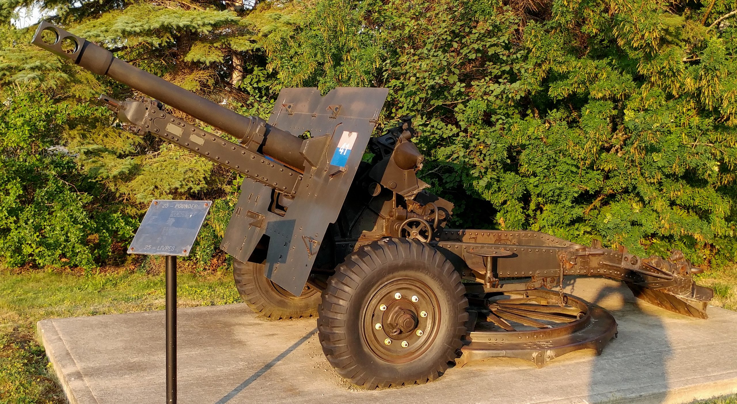 25-pounder C Mk. 2 QF Field Gun with No. 9 circular firing platform, with funeral platform, inside the school.