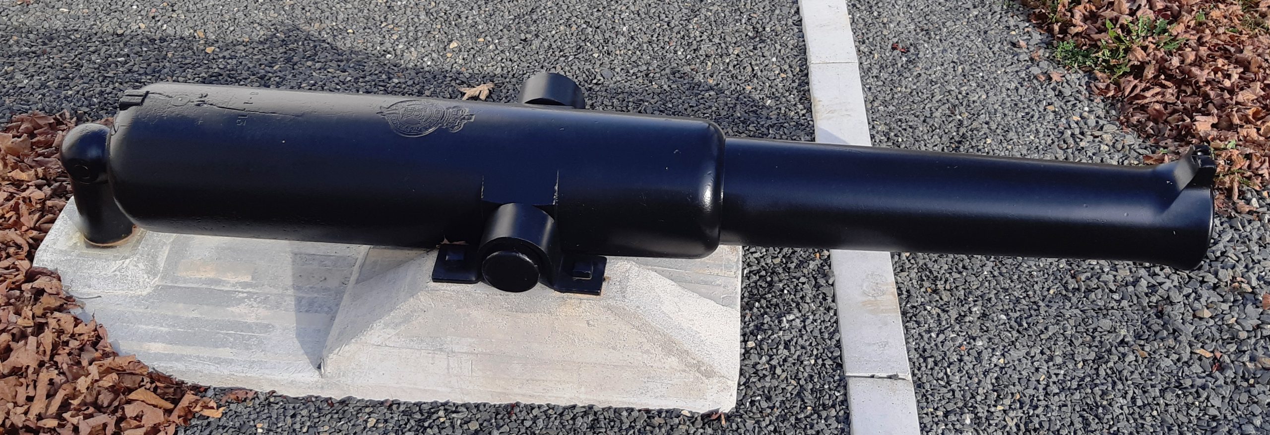 Cast Iron 12-pounder 6-cwt Smoothbore Muzzleloading Carronade with a Blomefield pattern breeching ring, set on wood blocks on the ground beside a city fountain.