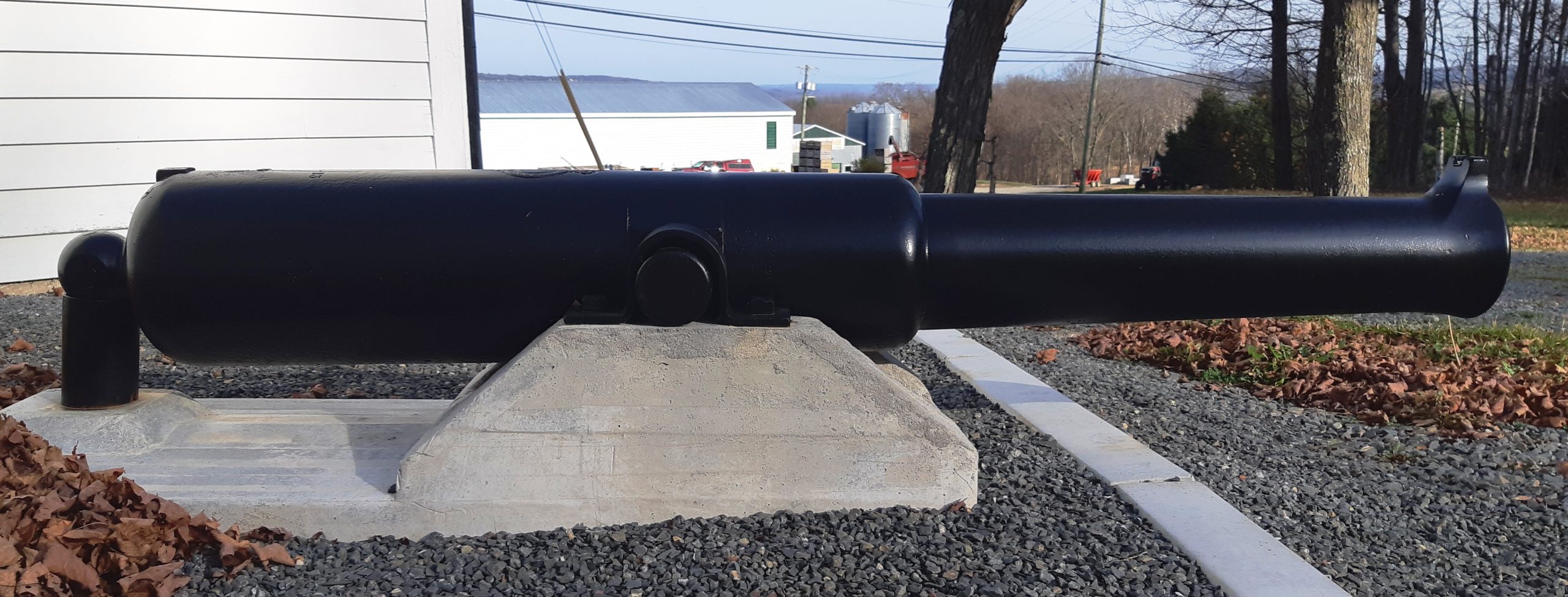 Cast Iron 64-pounder 71-cwt Muzzleloading Rifle (MLR) with a Dundas or Millar pattern breeching ring, Palliser conversion from a 32-pounder 58-cwt smoothbore muzzle-loading (SBML) Gun to a rifled muzzle-loading (RML) 32-pounder Gun, Queen Victoria cypher, broad arrow, Royal Gun Factory (RGF), (Serial No. 672) with an I, over possibly a corroded 1856 on the left trunnion, blank on the right trunnion, weight 59-0 (6,608 lbs). RGF IRON on the muzzle. No. 1 of 2 that will stand again in Officer’s Square, facing the lighthouse on the Saint John River, opposite the York-Sunbury historical Society, Fredericton Region Museum. This gun came from Halifax ca. 1947. It has been sanded and repainted for preservation with the City of Fredericton Operations Department.