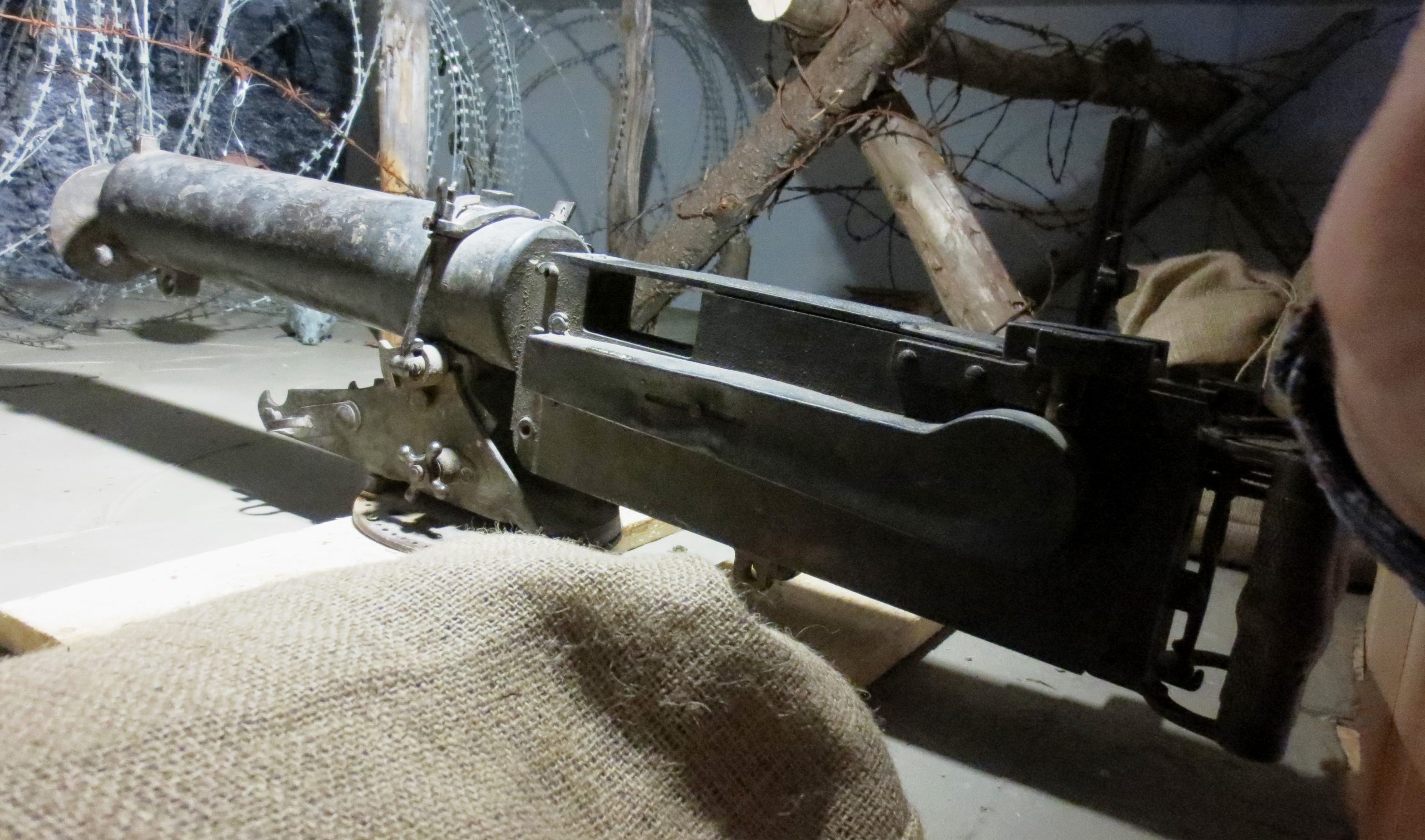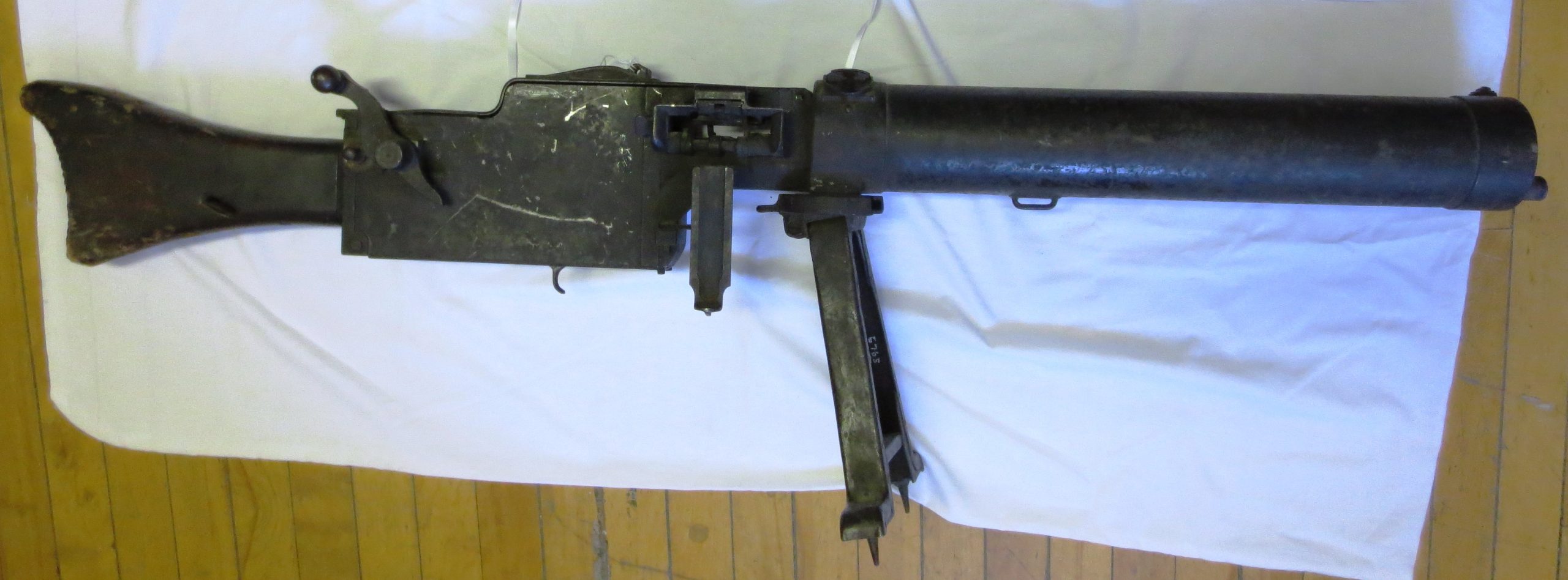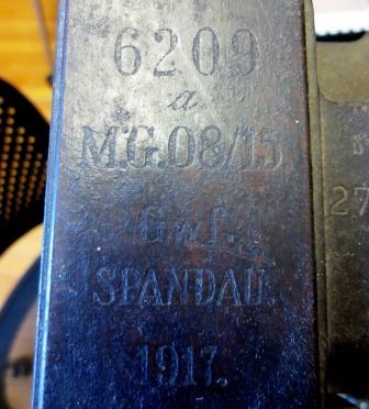 German First World War 7.92-mm Maxim Spandau MG 08/15 Machinegun, (Serial Nr. 6209a), Gwf Spandau 1917. This weapon was likely captured ca 1918 by a Battalion of an Infantry Brigade in a Canadian Division of the Canadian Expeditionary Force (CEF), in France. This MG is on display inside the Fredericton Regional Museum on Officer’s Square.
