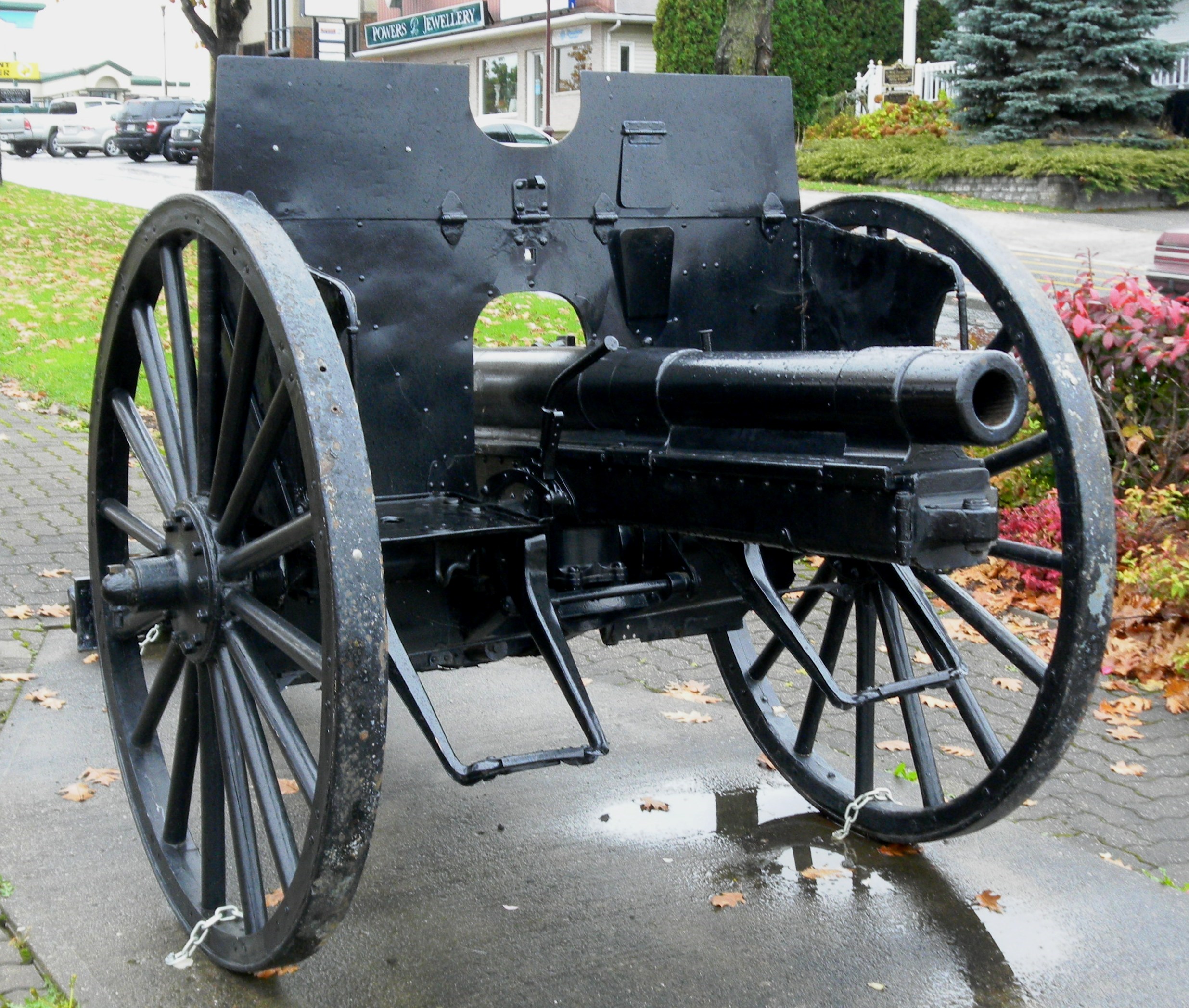 German First World War 7.7-cm Feldkanone 96 neuer Art (7.7-cm FK 96 n.A.), (Serial Nr. 8283). This FK 96 was captured on 27 Aug 1918 by the 25th Battalion (Nova Scotia Rifles), 5th Infantry Brigade, 2nd Canadian Division, Canadian Expeditionary Force (CEF), at Moon Quarry near Cherisy, France. Main Street, City Park.