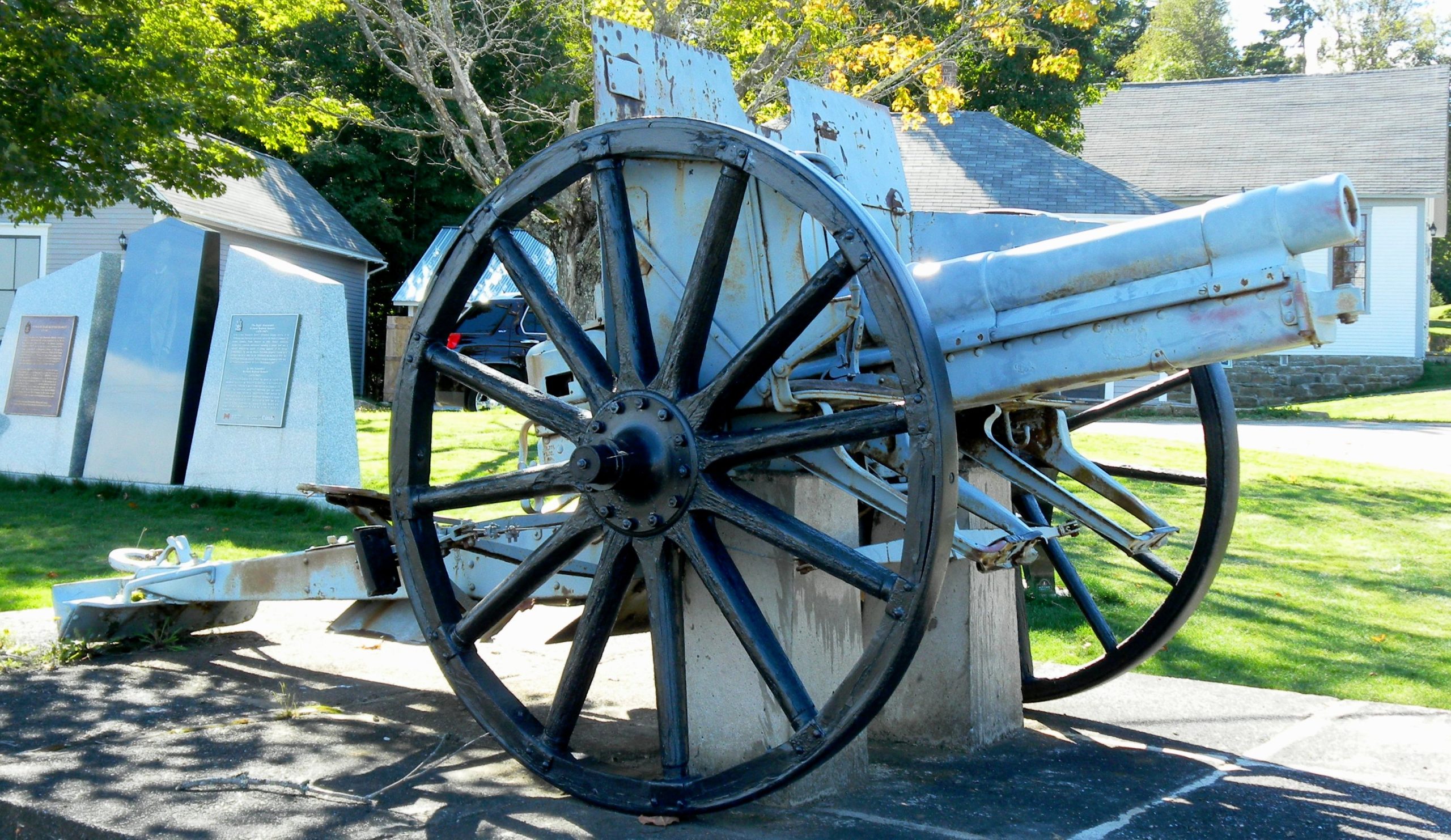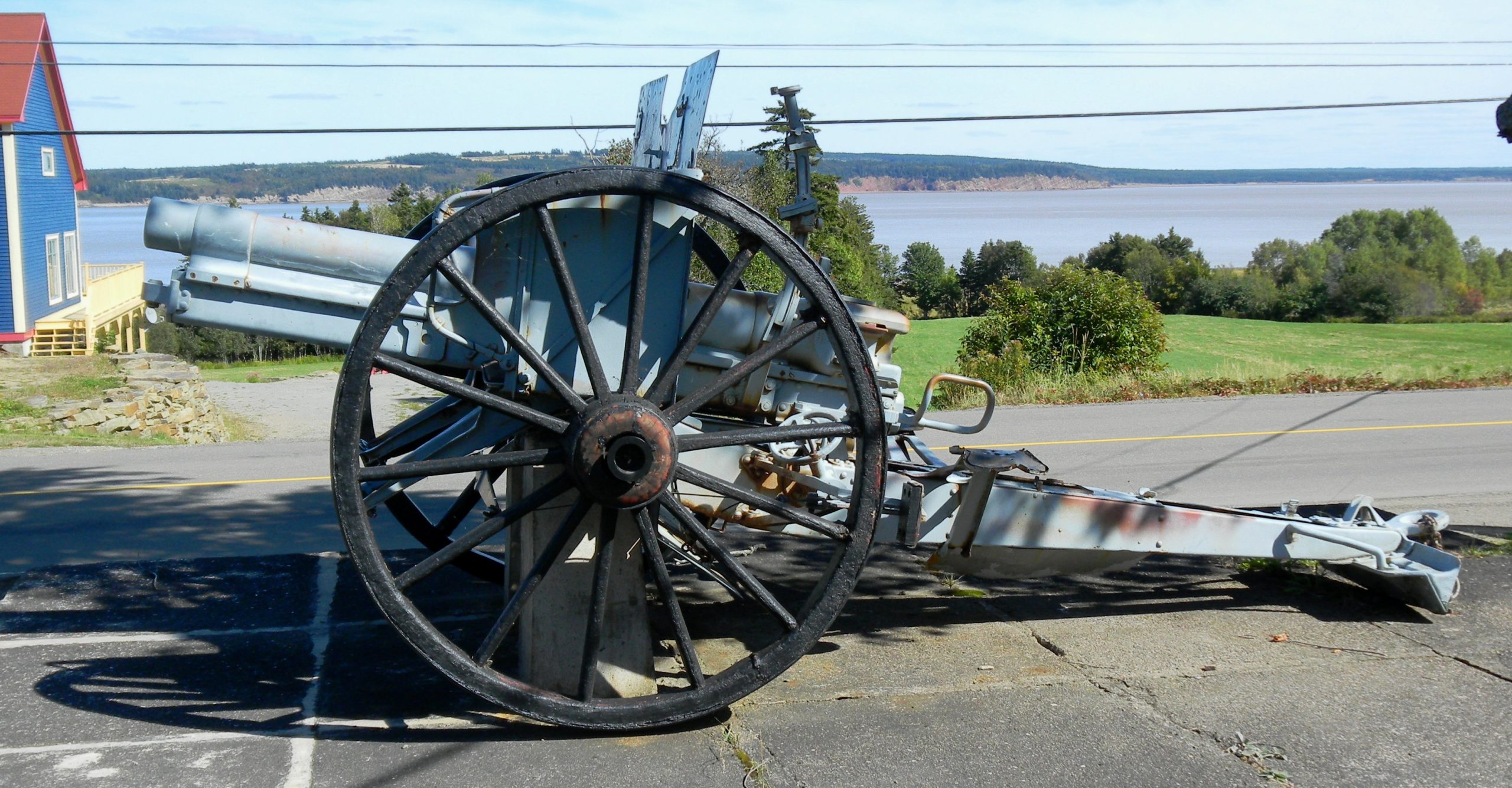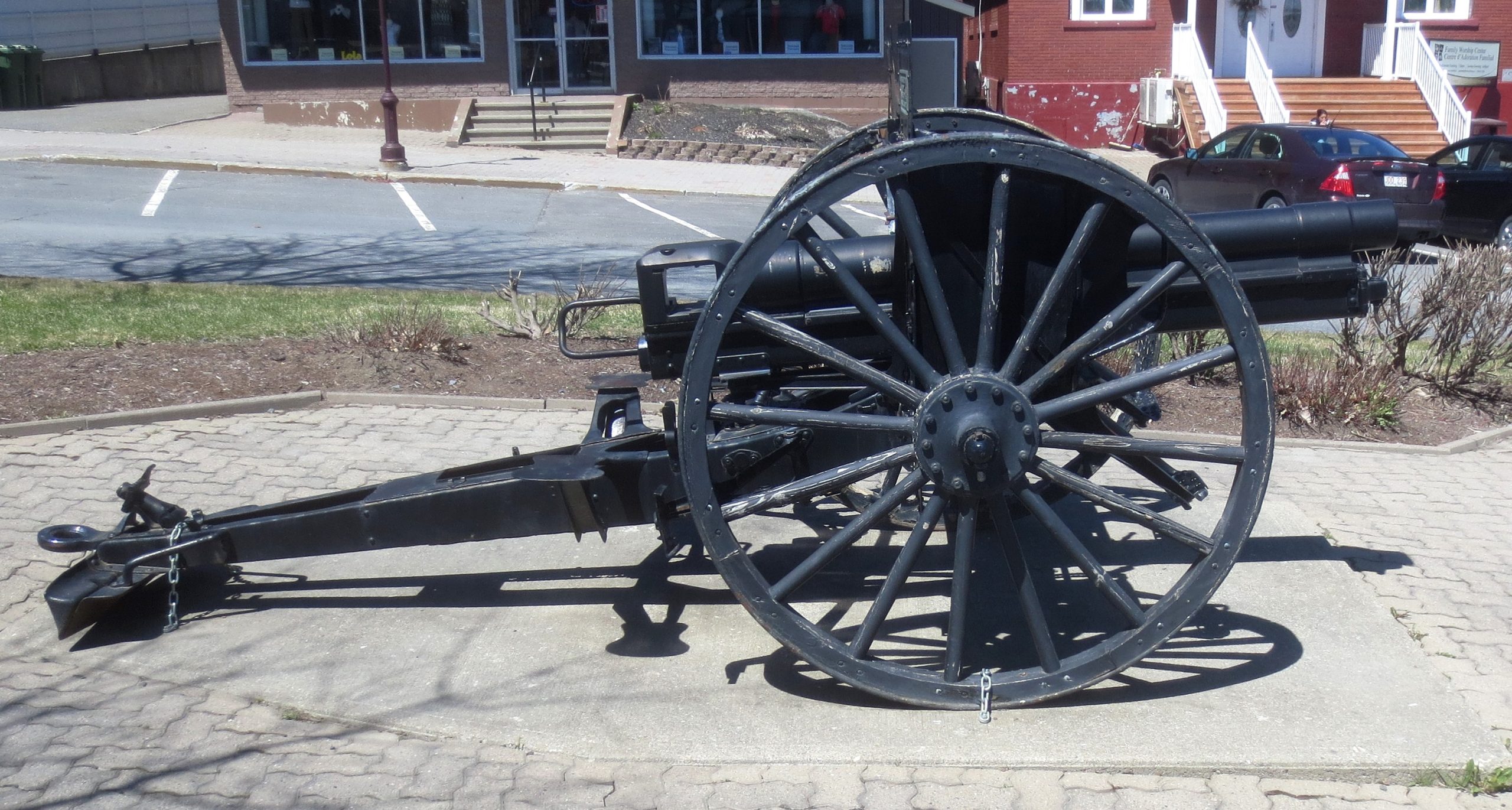 A plaque fixed to the gun states, “This German Gun No. 590 captured in the World War by the 26th Battalion recruited in this province was won by the citizens of Albert County, New Brunswick in the Victory Loan competition of 1919. Henry L. Drayton, Minister of Finance.”