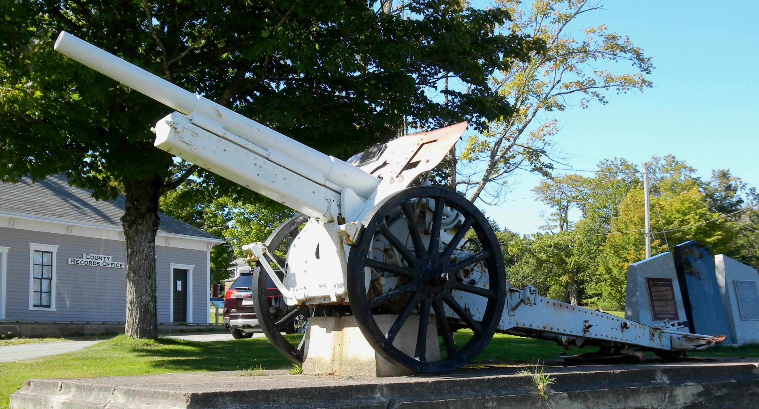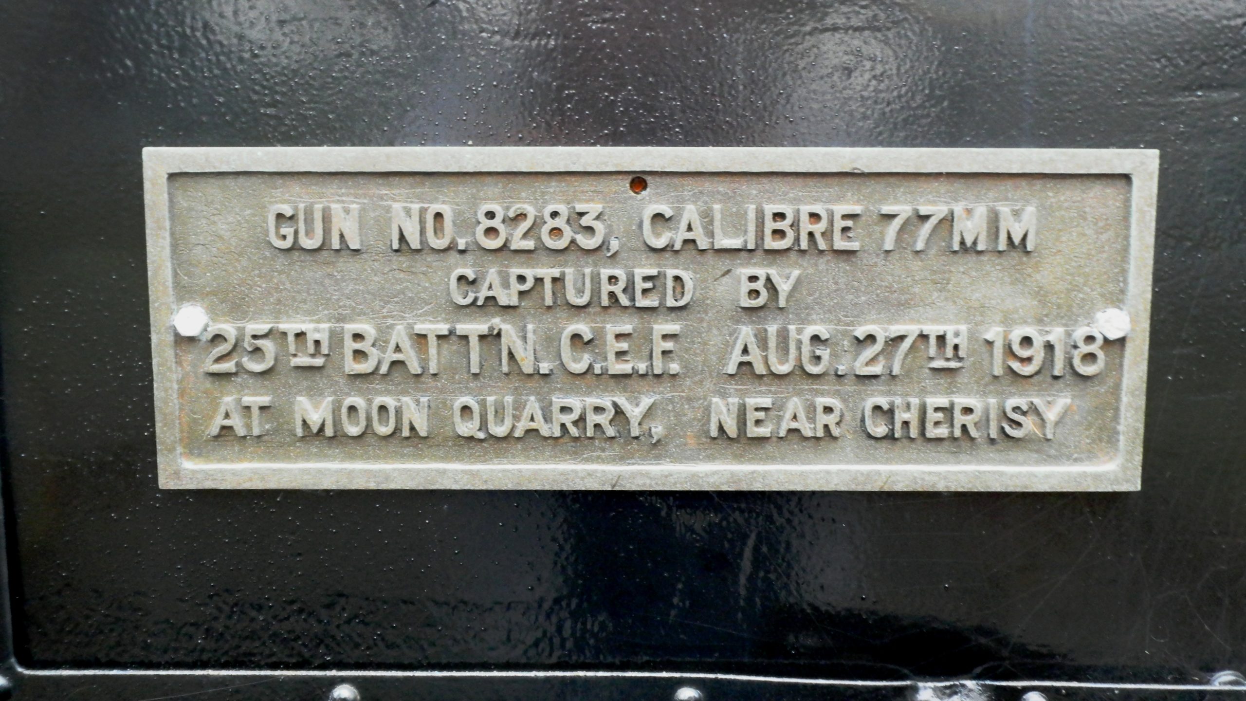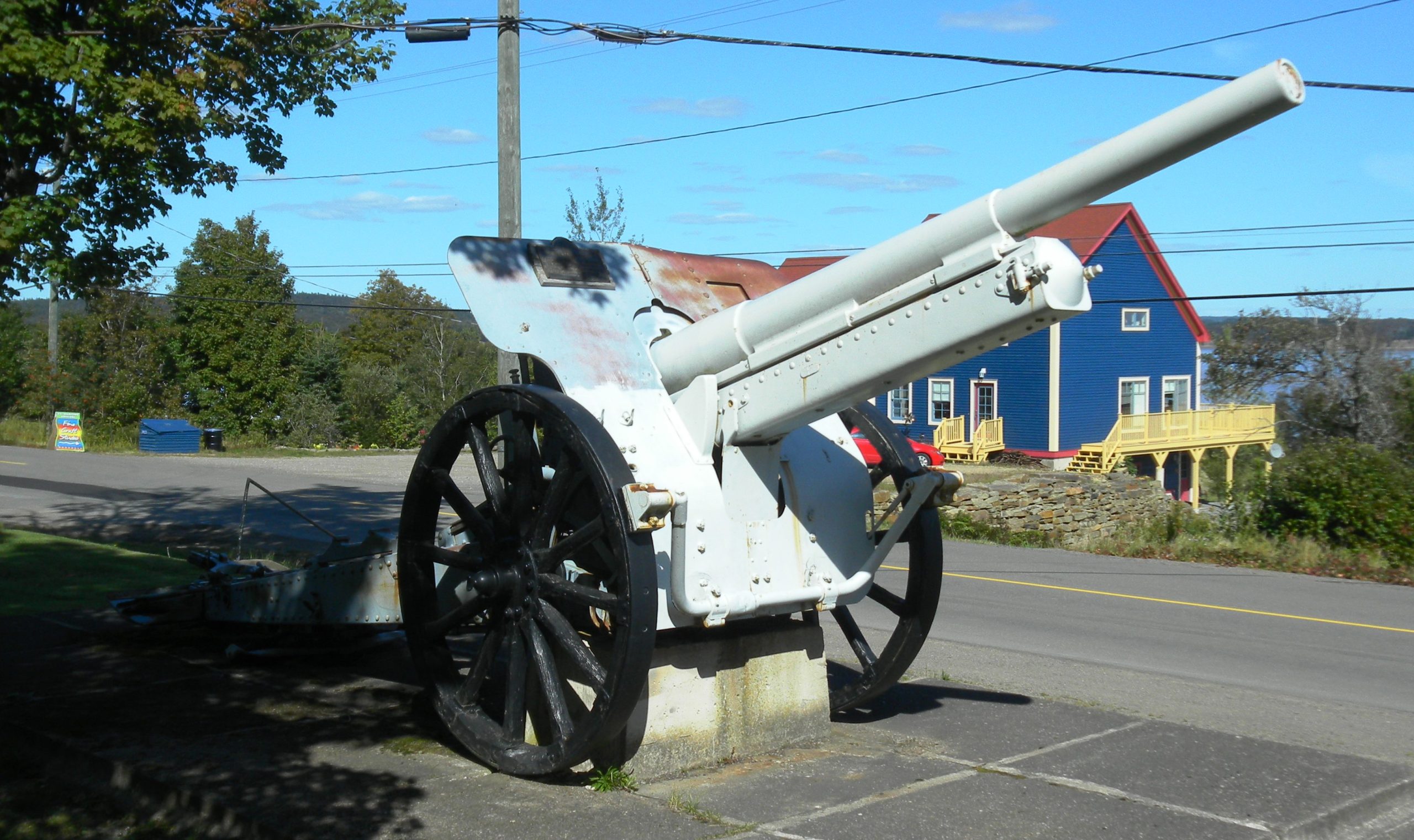 A plaque fixed to the gun states, “This German Gun No. 590 captured in the World War by the 26th Battalion recruited in this province was won by the citizens of Albert County, New Brunswick in the Victory Loan competition of 1919. Henry L. Drayton, Minister of Finance.”
