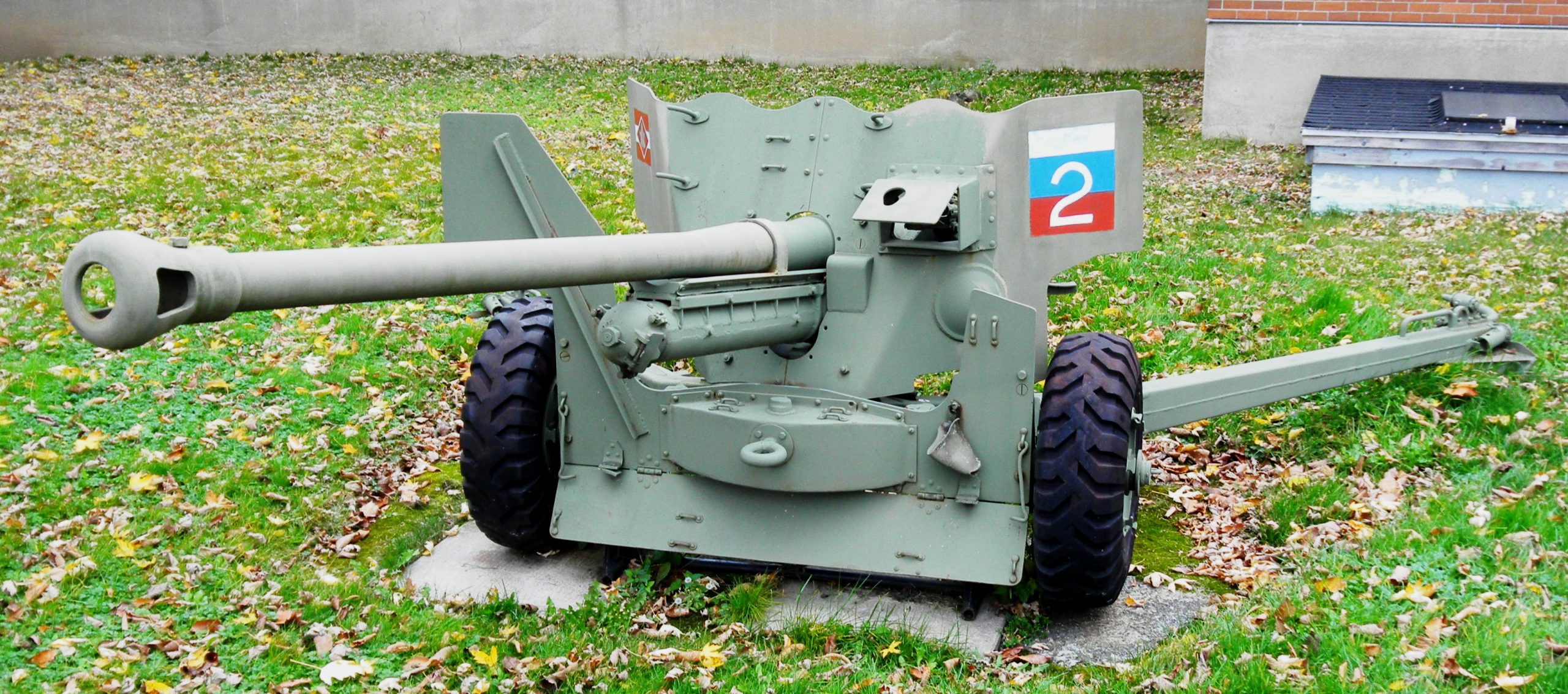 6-pounder 7-cwt QF Anti-Tank Gun, painted with a white No. 2 on a red over blue tactical sign on the face of the gun shield. Marysville Cenotaph.