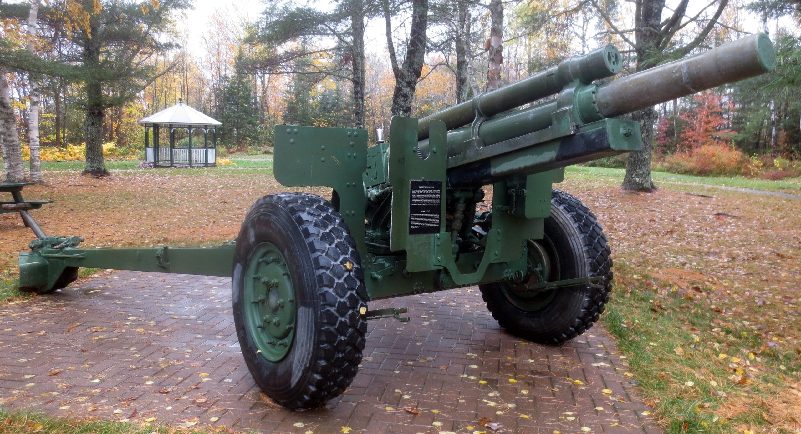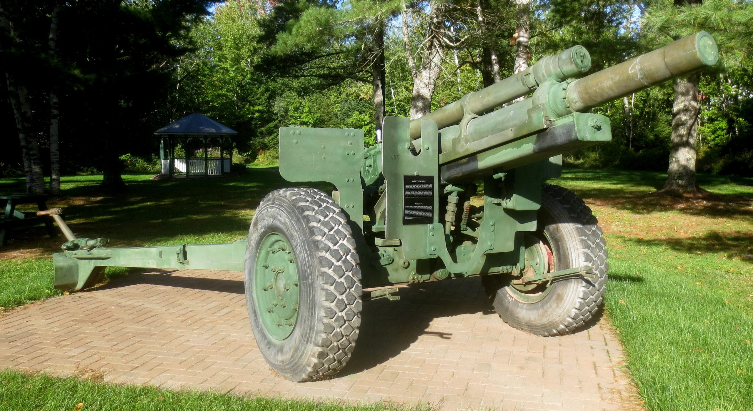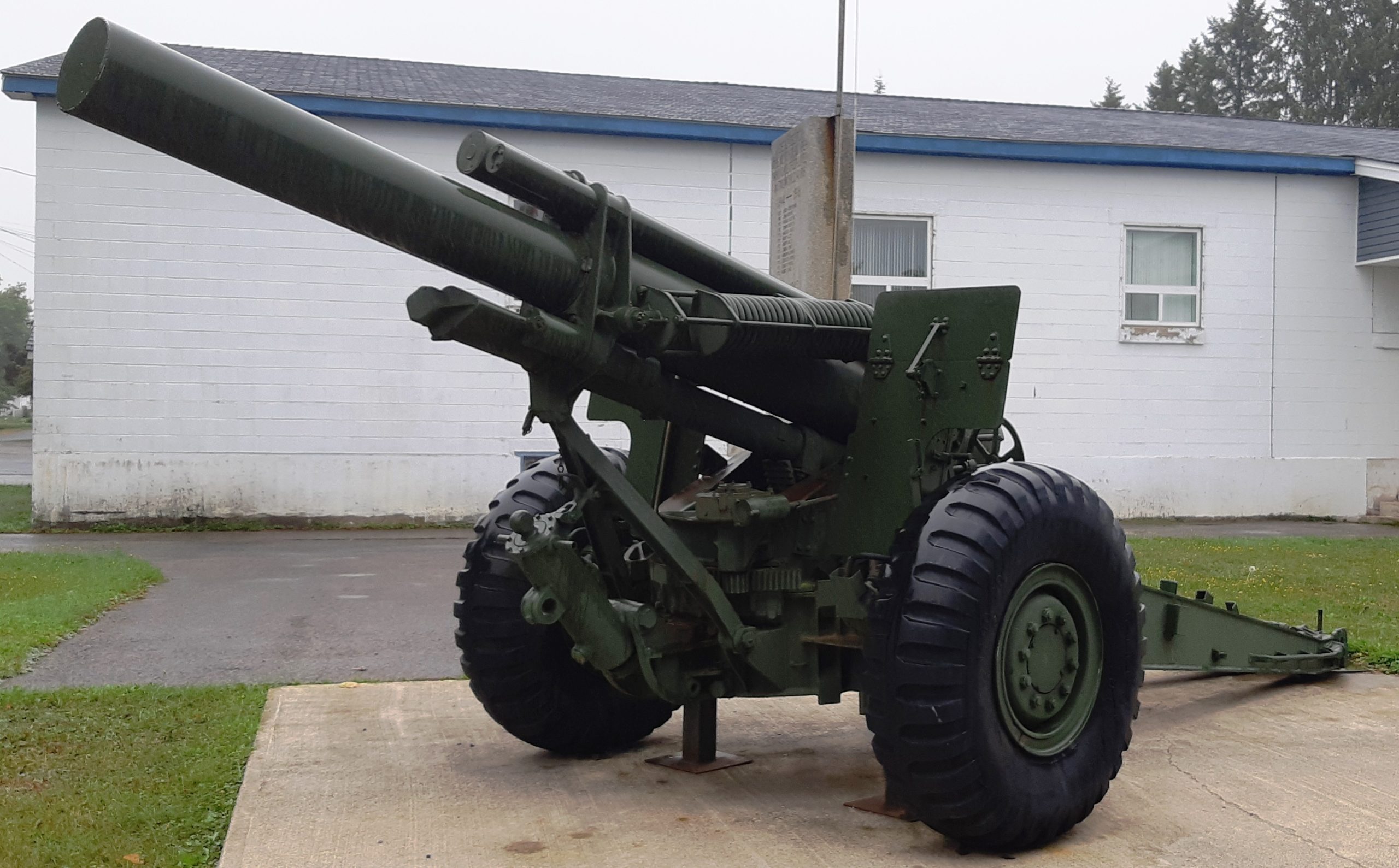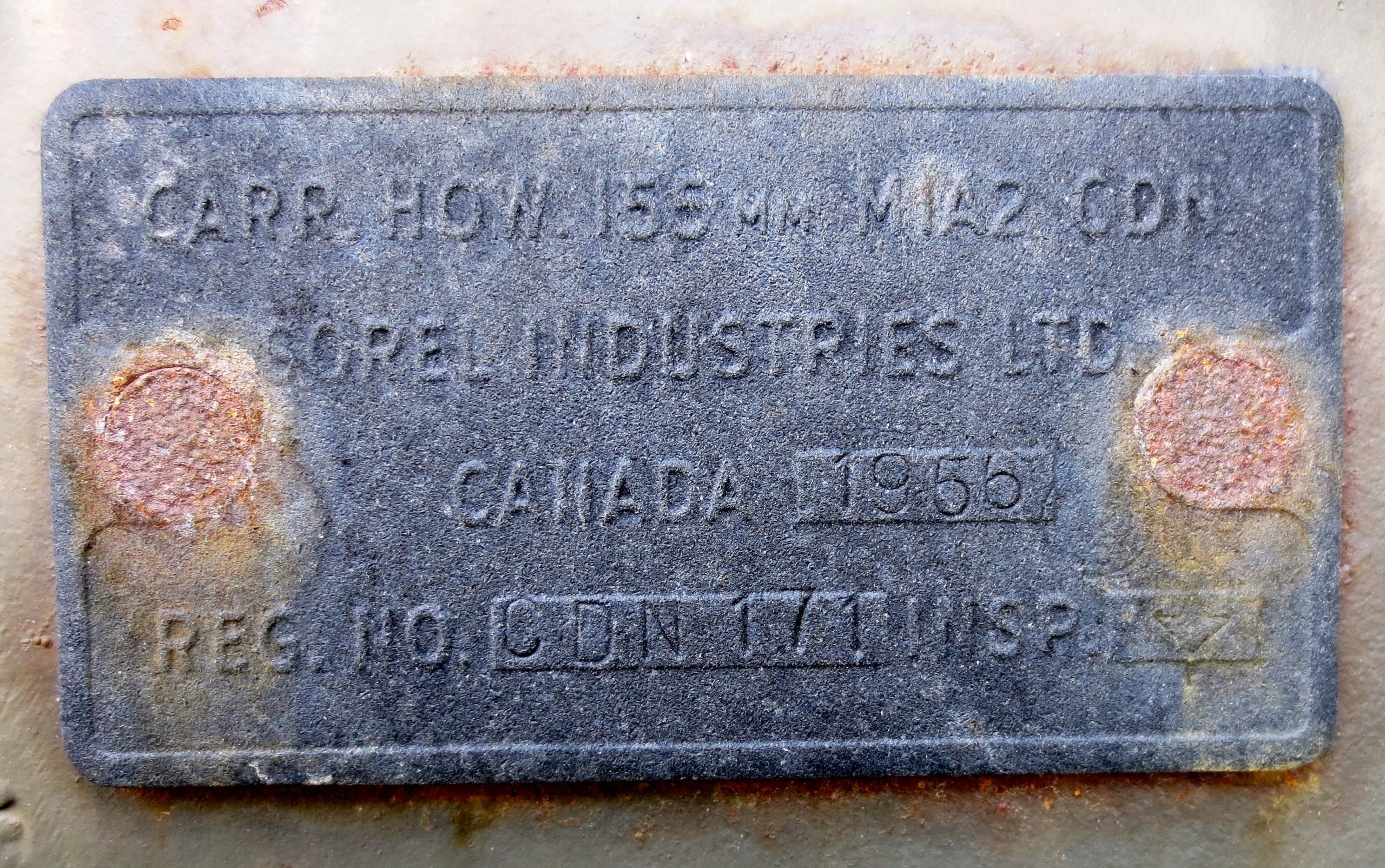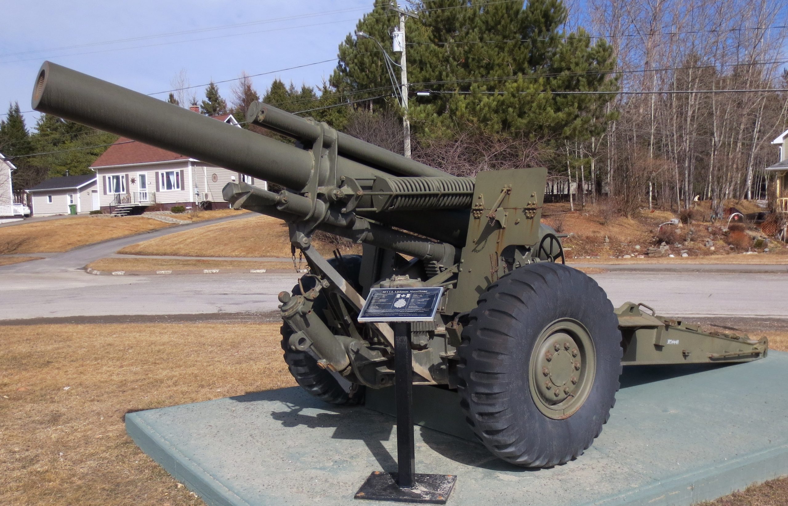155-mm C1 (M1A2) Medium Howitzer on M1A2 Carriage, aka M114, manufactured at Sorel Industries Limited in Quebec, Queen Elizabeth II cypher. CFR 34-448. The carriage plate reads: CARR. HOW. 155MM M1A2 CDN. SOREL INDUSTRIES LTD. CANADA (year TBC), REG. NO. CDN 171, INSP (symbol). The breech block reads: HOWITZER 155MM M1A1 CDN, CANADA, SOREL INDUSTRIES LTD, 1956, 3730 LBS, INSP (symbol). Veterans Memorial, Highway 17. The breech block reads: HOWITZER 155MM M1A1 CDN, CANADA, SOREL INDUSTRIES LTD, 1956, 3730 LBS, INSP (symbol). The carriage plate reads: CARR HOW 155mm M1A2 CDN, SOREL INDUSTRIES LTD, CANADA (year TBC), REG. NO. CDN 171, INSP (Symbol). The CFR number painted on the right trail is 0034448.