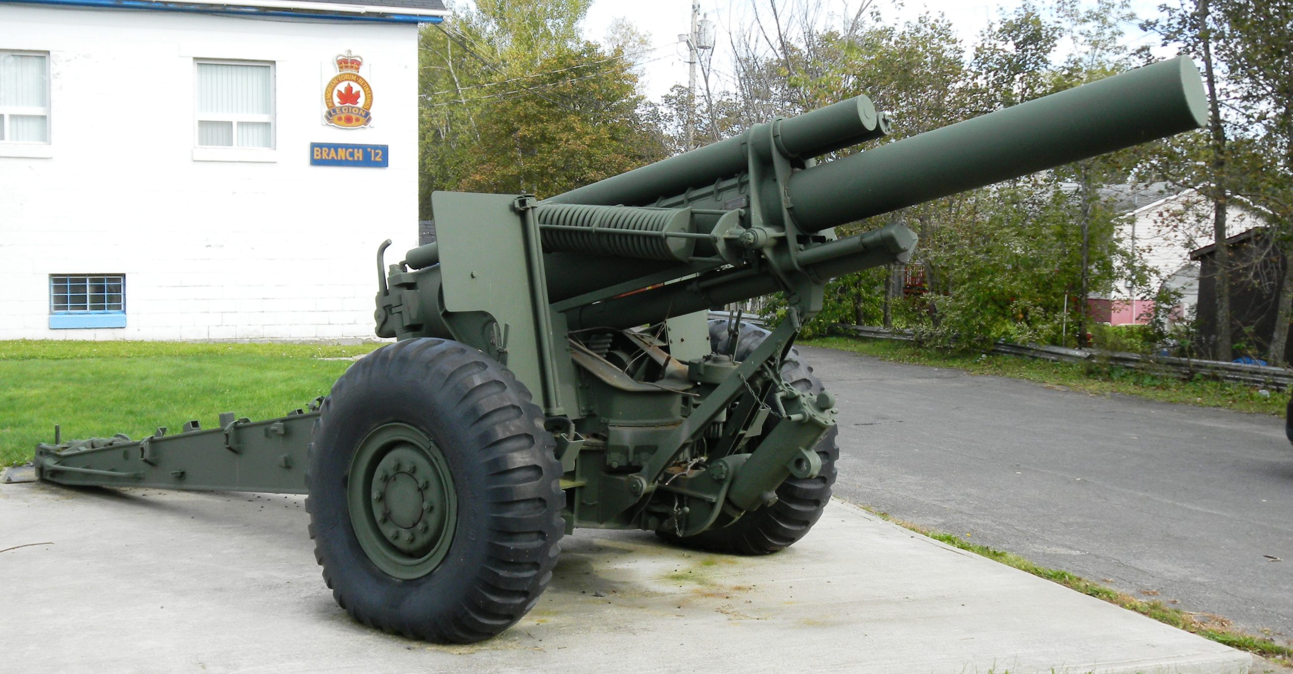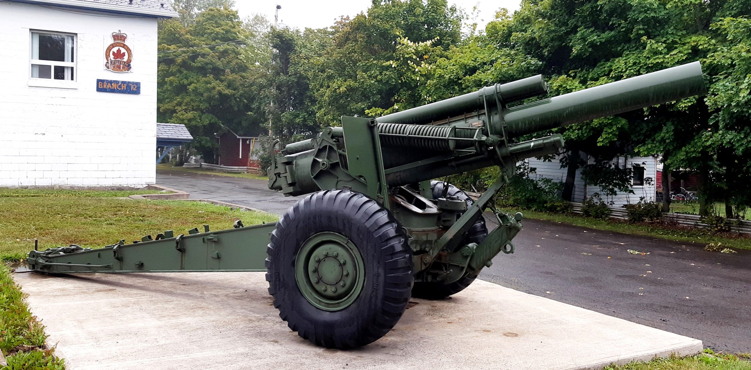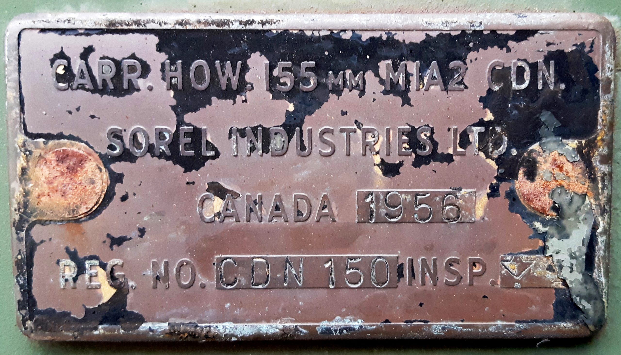 155-mm C1 (M1A2) Medium Howitzer on M1A2 Carriage, aka M114, manufactured at Sorel Industries Limited in Quebec, Queen Elizabeth II cypher. The carriage plate reads: CARR. HOW. 155MM M1A2 CDN. SOREL INDUSTRIES LTD. CANADA (1956), REG. NO. CDN 150, INSP (symbol). The breech block reads: HOWITZER 155MM M1A1 CDN, CANADA, SOREL INDUSTRIES LTD, Date 1956, 3730 LBS, INSP (symbol). Royal Canadian Legion Branch No. 12.