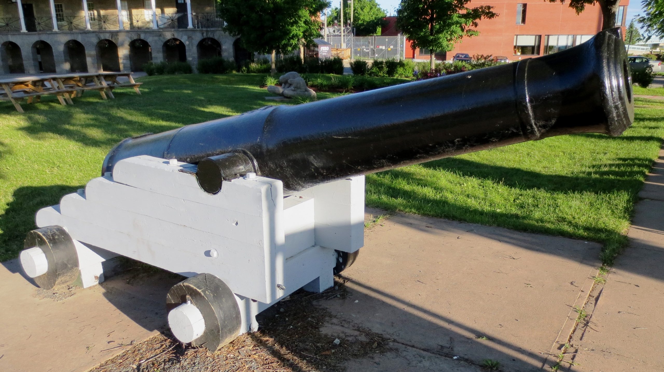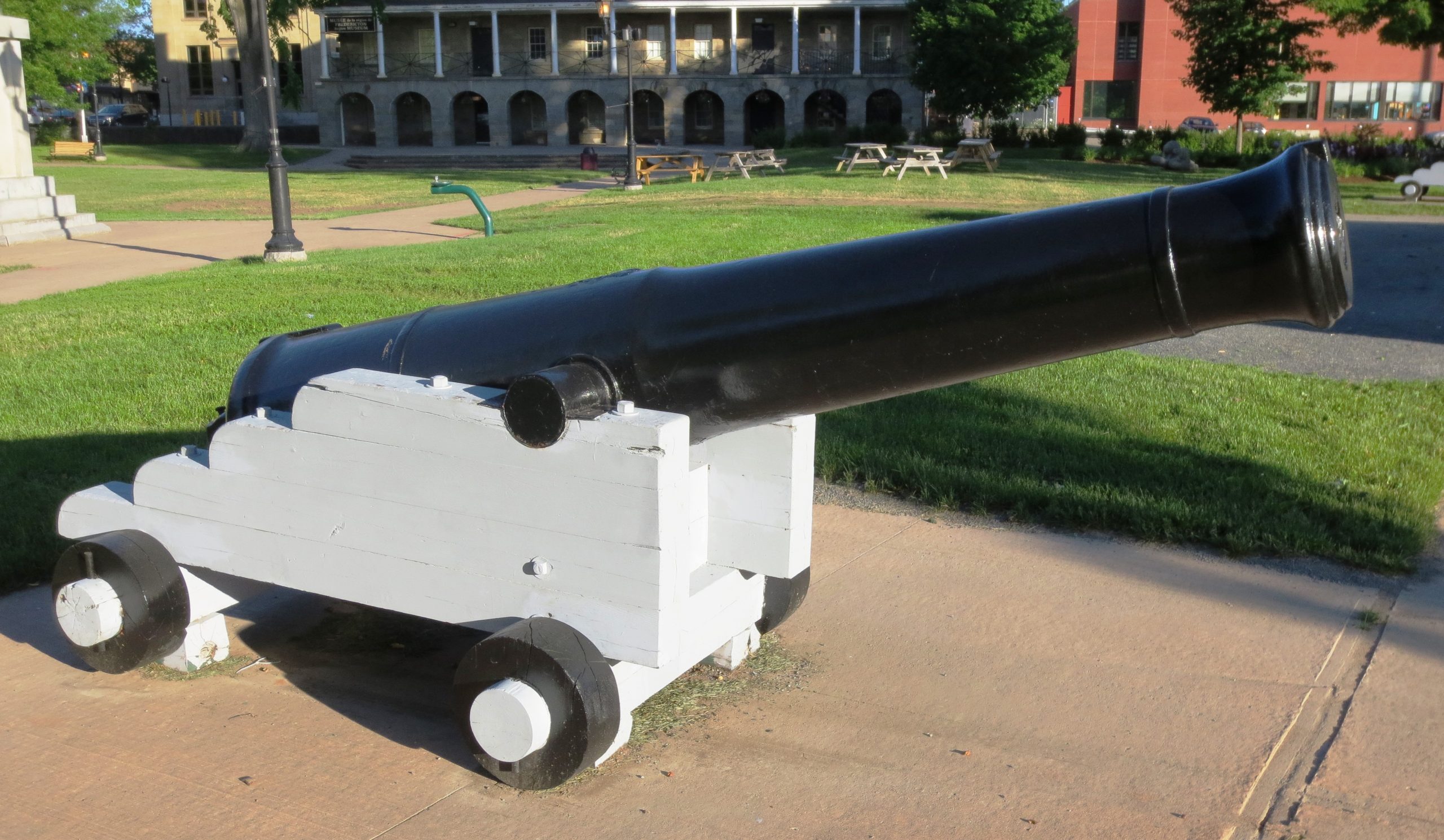 Cast Iron 64-pounder 71-cwt Muzzleloading Rifle (MLR) with a Dundas or Millar pattern breeching ring, Palliser conversion from a 32-pounder 58-cwt smoothbore muzzle-loading (SBML) Gun to a rifled muzzle-loading (RML) 32-pounder Gun, Queen Victoria cypher, broad arrow, Royal Gun Factory (RGF), (Serial No. 672) with an I ,over possibly a corroded 1856 on the left trunnion, blank on the right trunnion, weight 59-0 (6,608 lbs). RGF IRON on the muzzle. No. 1 of 2 that will stand again in Officer’s Square, facing the lighthouse on the Saint John River, opposite the York-Sunbury historical Society, Fredericton Region Museum. This gun came from Halifax ca. 1947. It has been sanded and repainted for preservation with the City of Fredericton Operations Department.