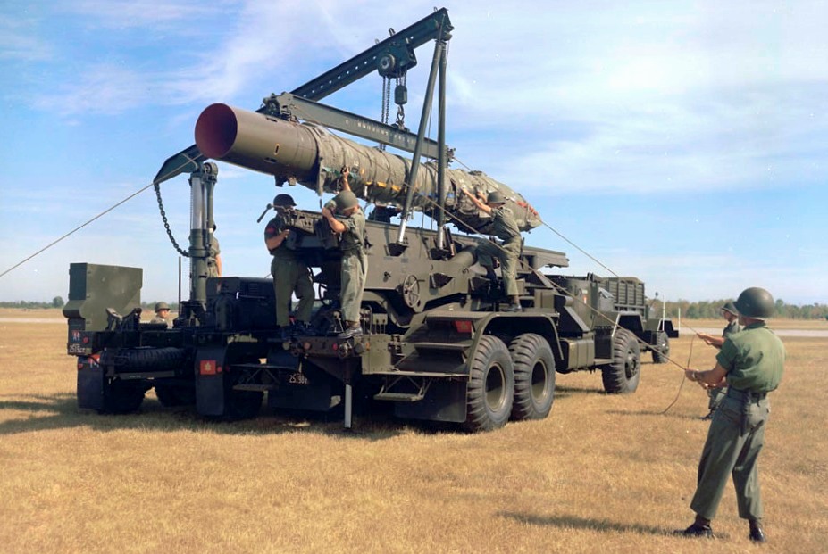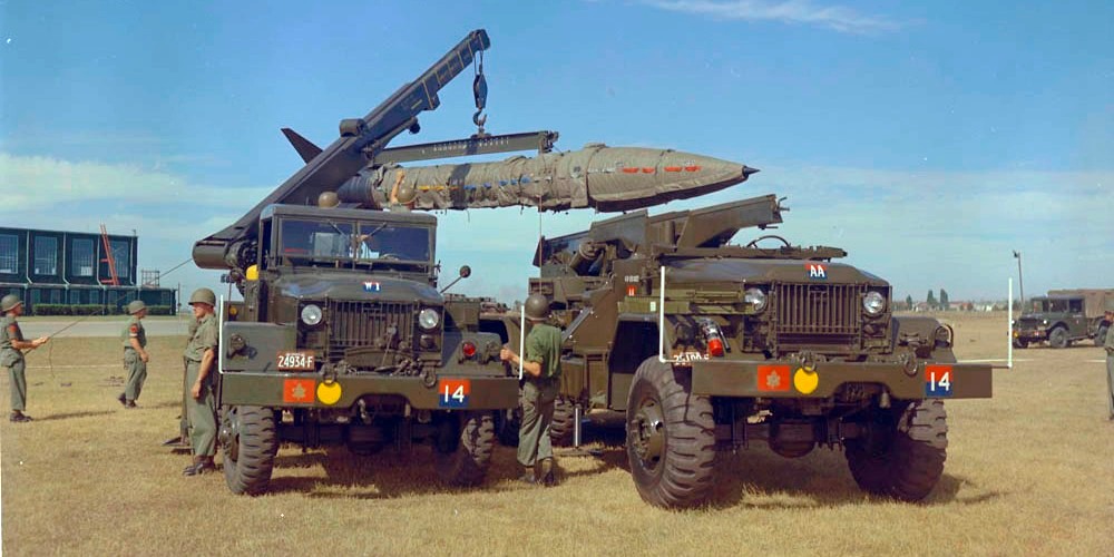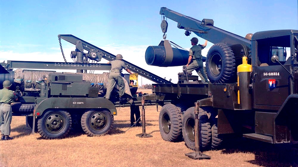 2nd Surface-to-Surface Missile Battery, assembling an M31 762-mm Honest John rocket in Shilo, Manitoba, using an M405 trailer-mounted handling unit and an M62 wrecker/crane. The M-62 was a standard wrecker but, because they were used to handle nuclear warheads, the vehicles used for rocket assembly by the SSM batteries were severely restricted in their usage (for example, the use of the rear winch was forbidden) and were subject to frequent load tests on the boom and its cable. (Doug Knight)