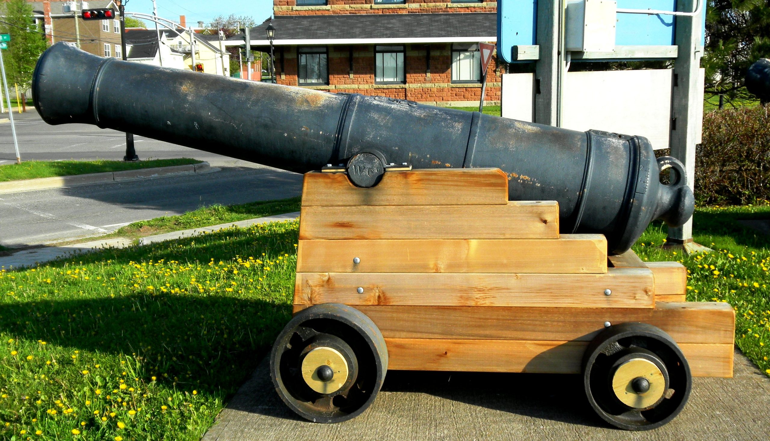 Dundas 32/64-pounder 58-cwt Converted Rifled Muzzleloading Gun, weight 58-2-0 (6,552 lbs), (RGF 401, I, 1854) on left trunnion, (+) on the right trunnion, King George III cypher, 19, broad arrow mark, mounted on a wood naval gun carriage, 210 Water Street. No. 1 of 2 guns facing away from the water.