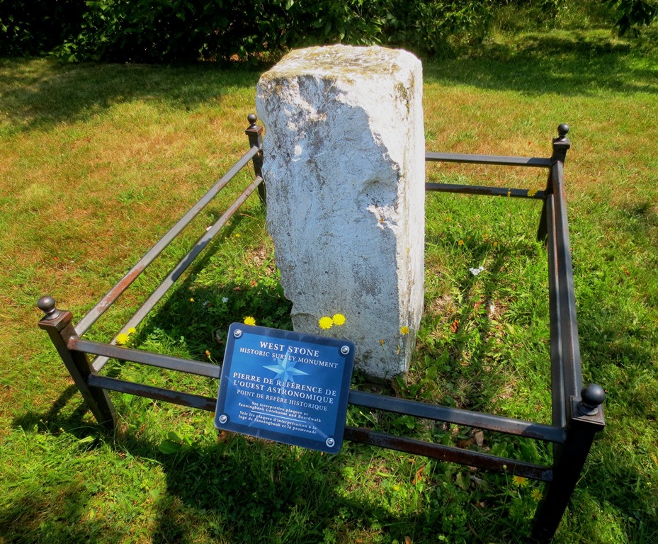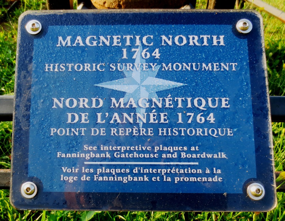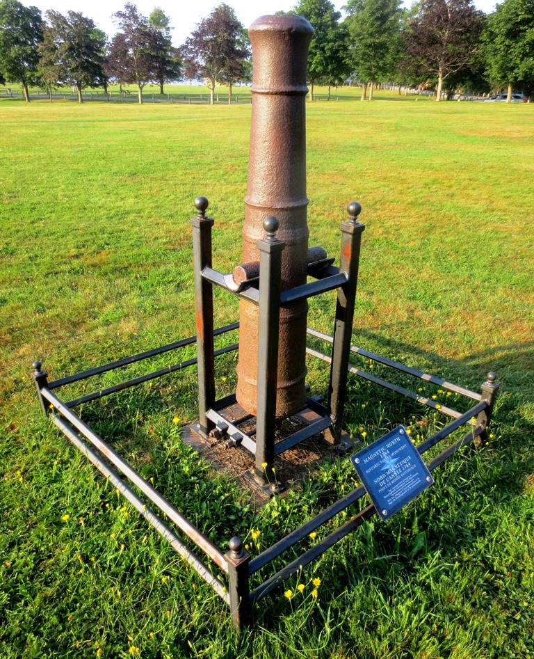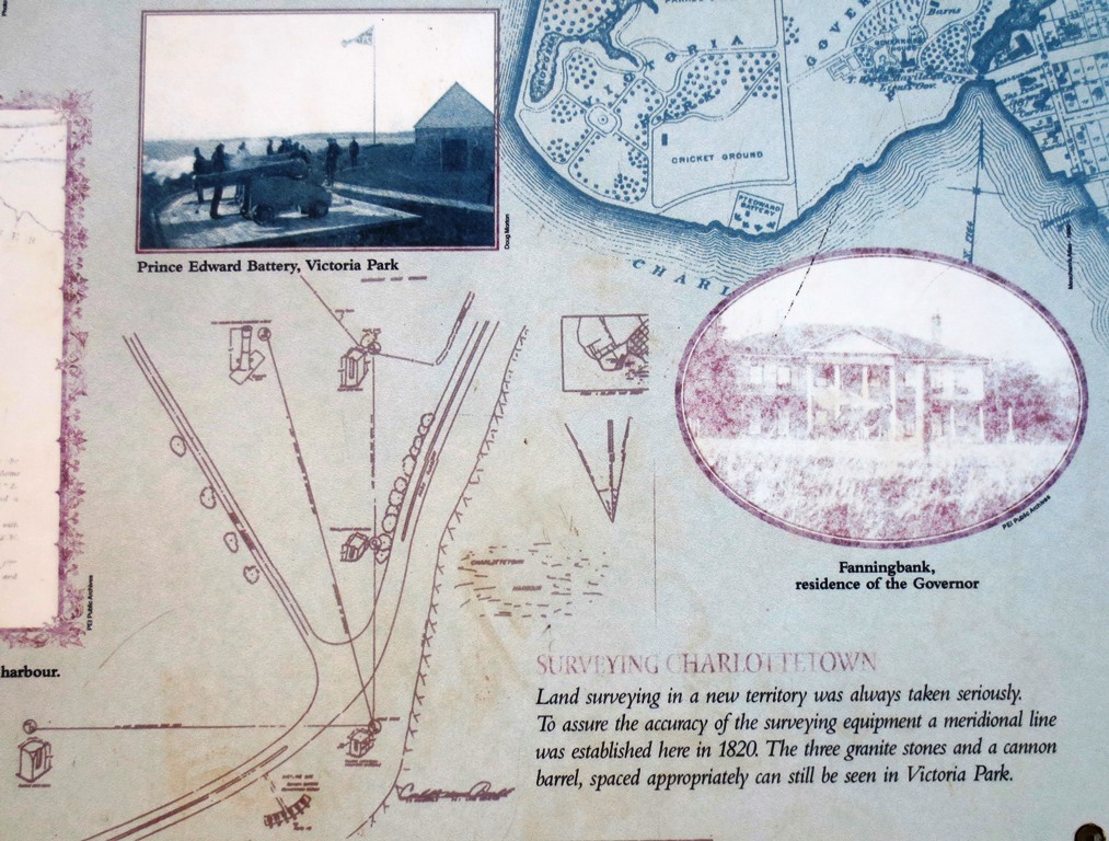 To ensure the accuracy of the surveying equipment in use on Prince Edward Island in the 19th century, a meridonal line was established in Victoria Park in 1830. Three granite posts and what appears to be a SBML 9-pounder gun spaced appropriately are laid out in the park as per the diagram shown here beside the Prince Edward Battery.